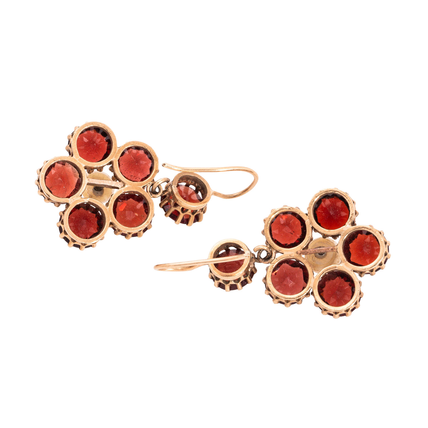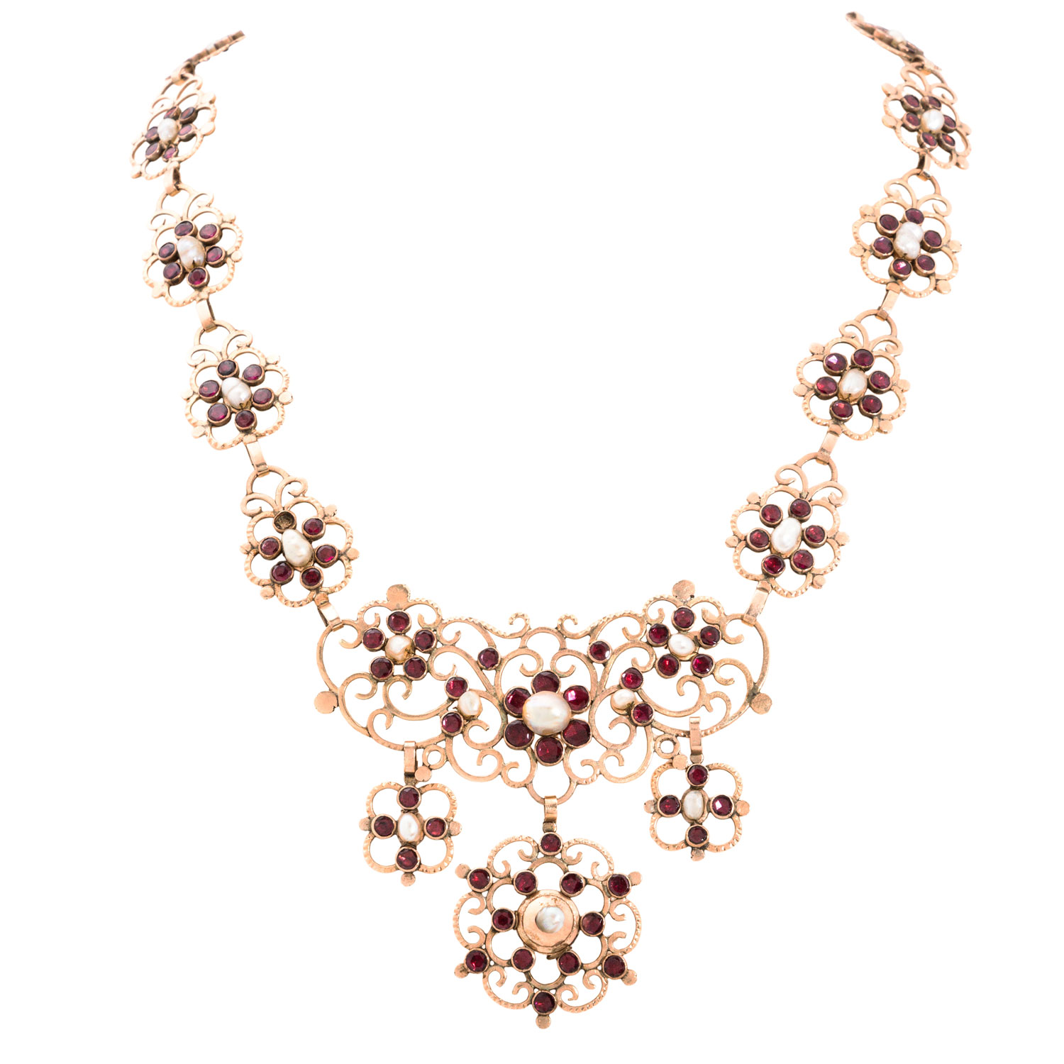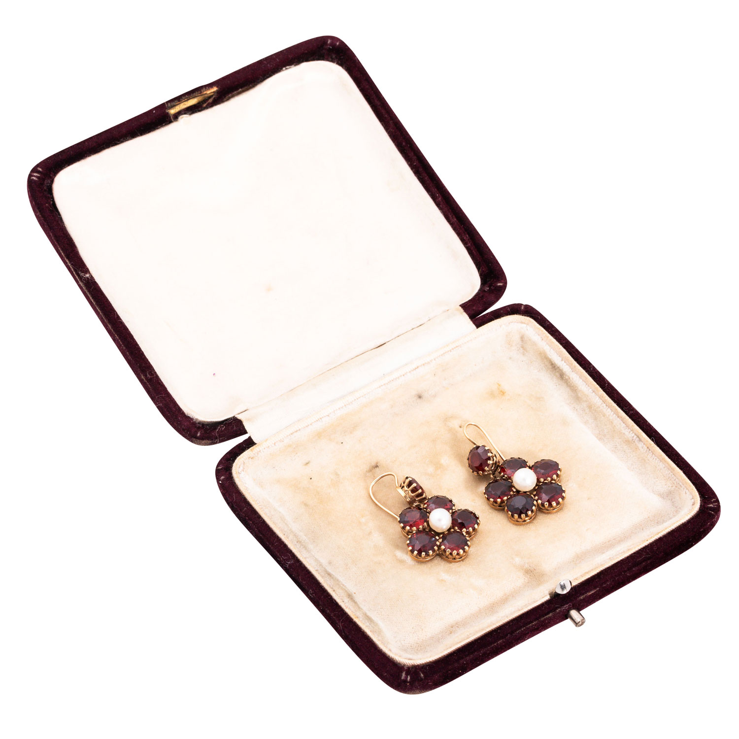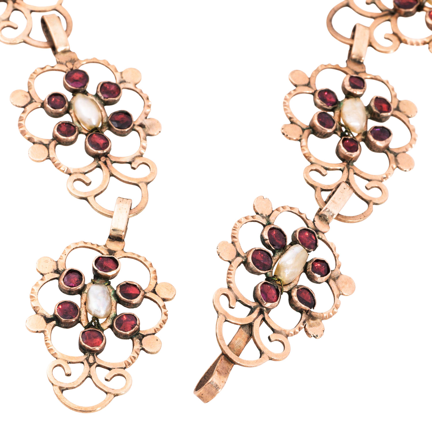 Bundle of necklace and earrings with garnet and pearls, prob. oriental pearl, 1 additional loose pearl included, necklace ca. 10-12K yellow gold, L: 49 cm, earrings ca. 8-9K, L: 3 cm, 18/19th century, good condition, including catalogue page of CHRISTIE'S LONDON (1983).