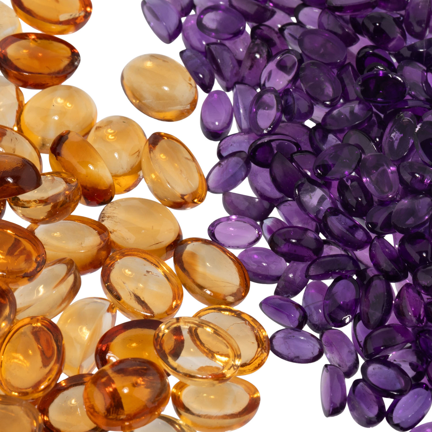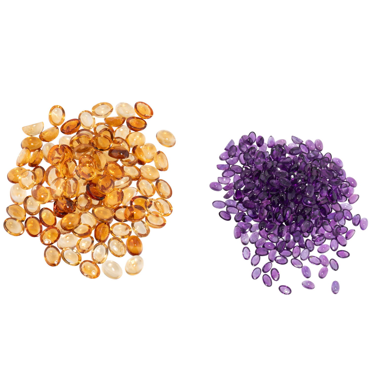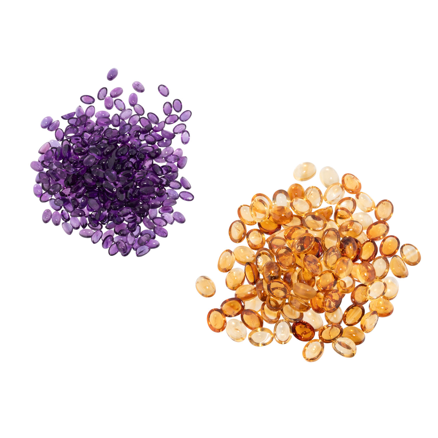 A lot of quartz, citrine totaling 139.2 ct, amethyst totaling 79.6 ct, calibrated cabochons, citrine approx. 8 x 6 mm, amethyst approx. 5 x 3 mm, replacement value: approx. 1,500 €, citrine with slight color gradient, high degree of clarity, good condition. All stones without detailed gemmological testing!