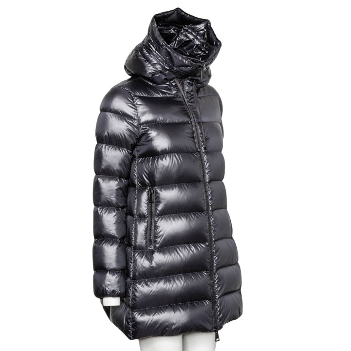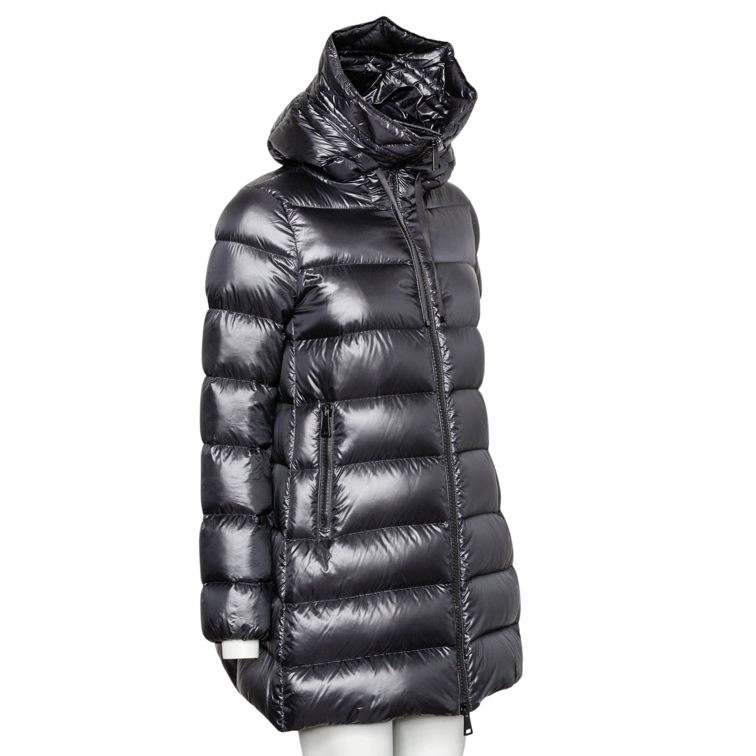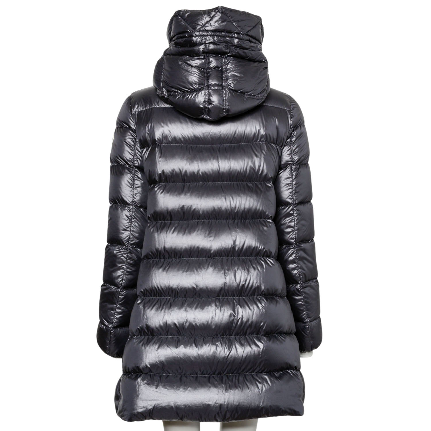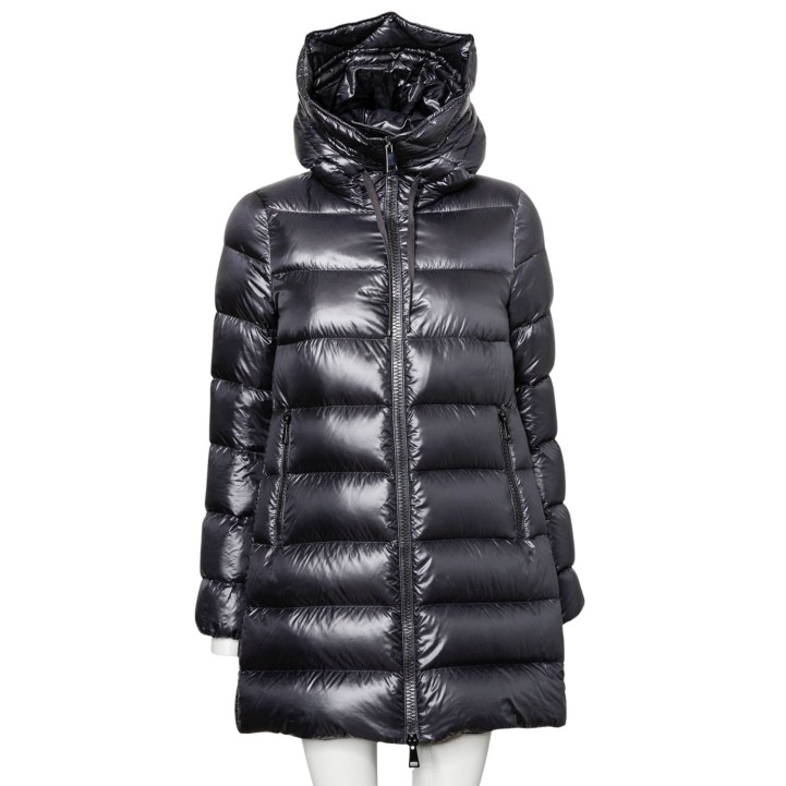 MONCLER Down quilted coat, size 2 (38). Cross-quilted down coat, mid-length in black with hood and black zippers. Very good condition.