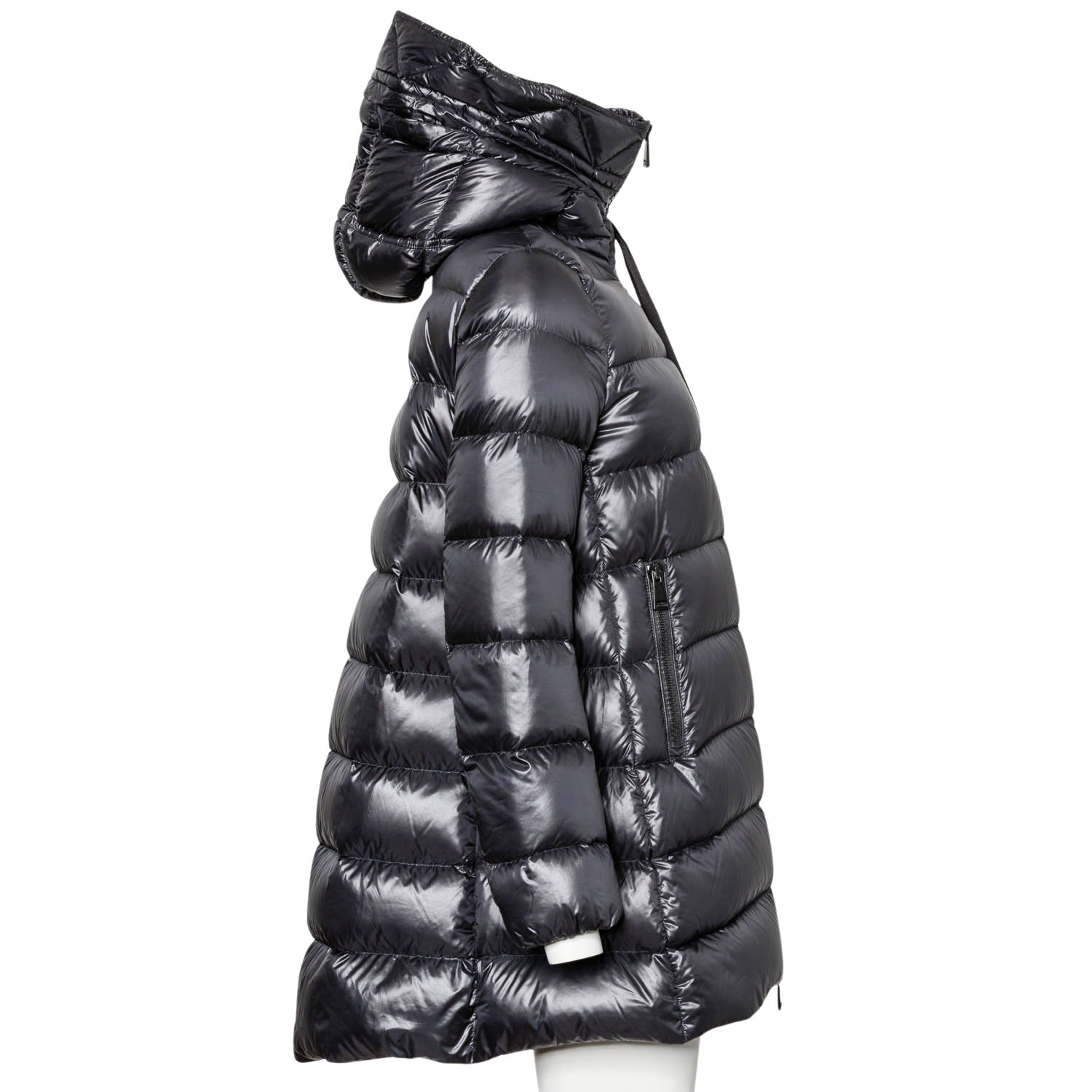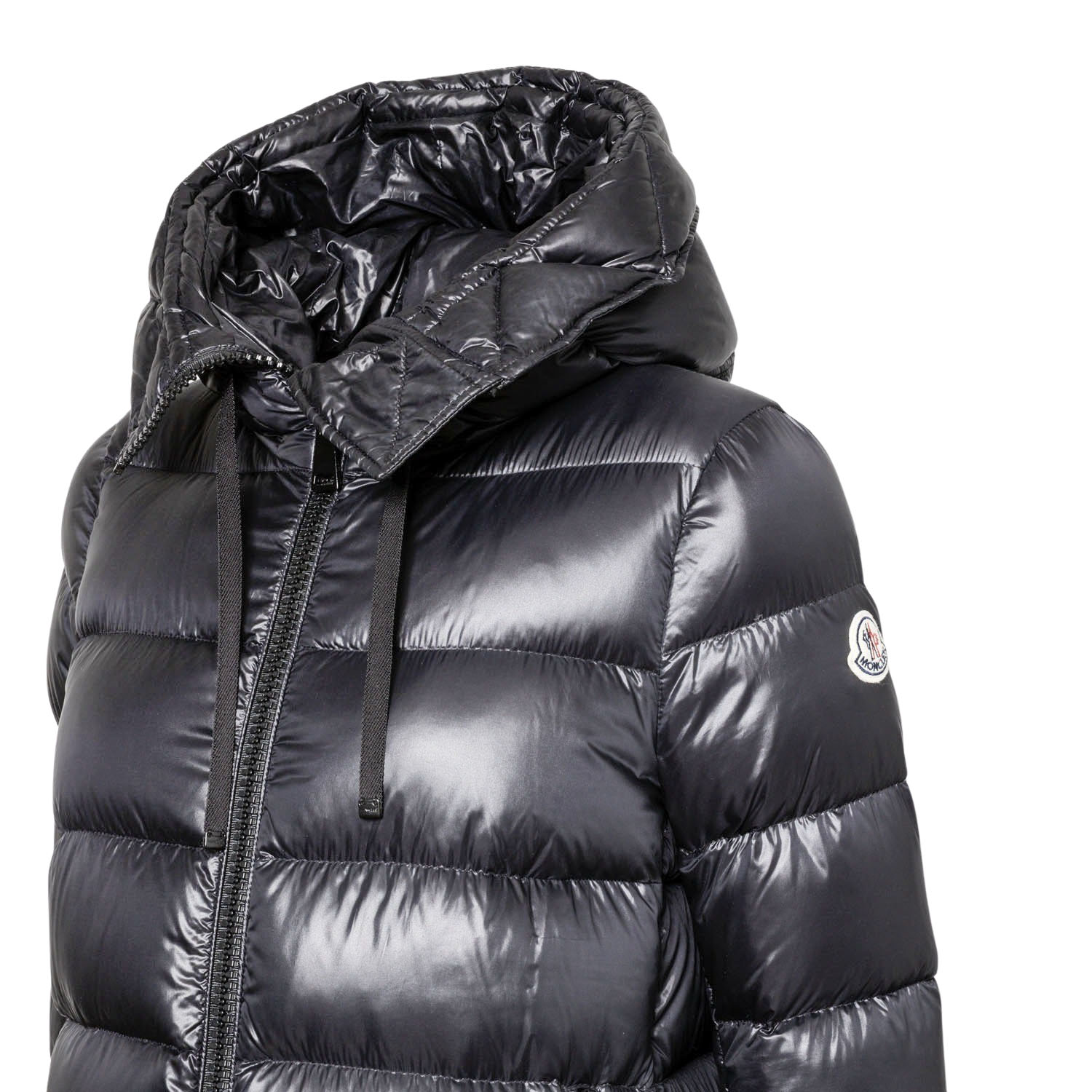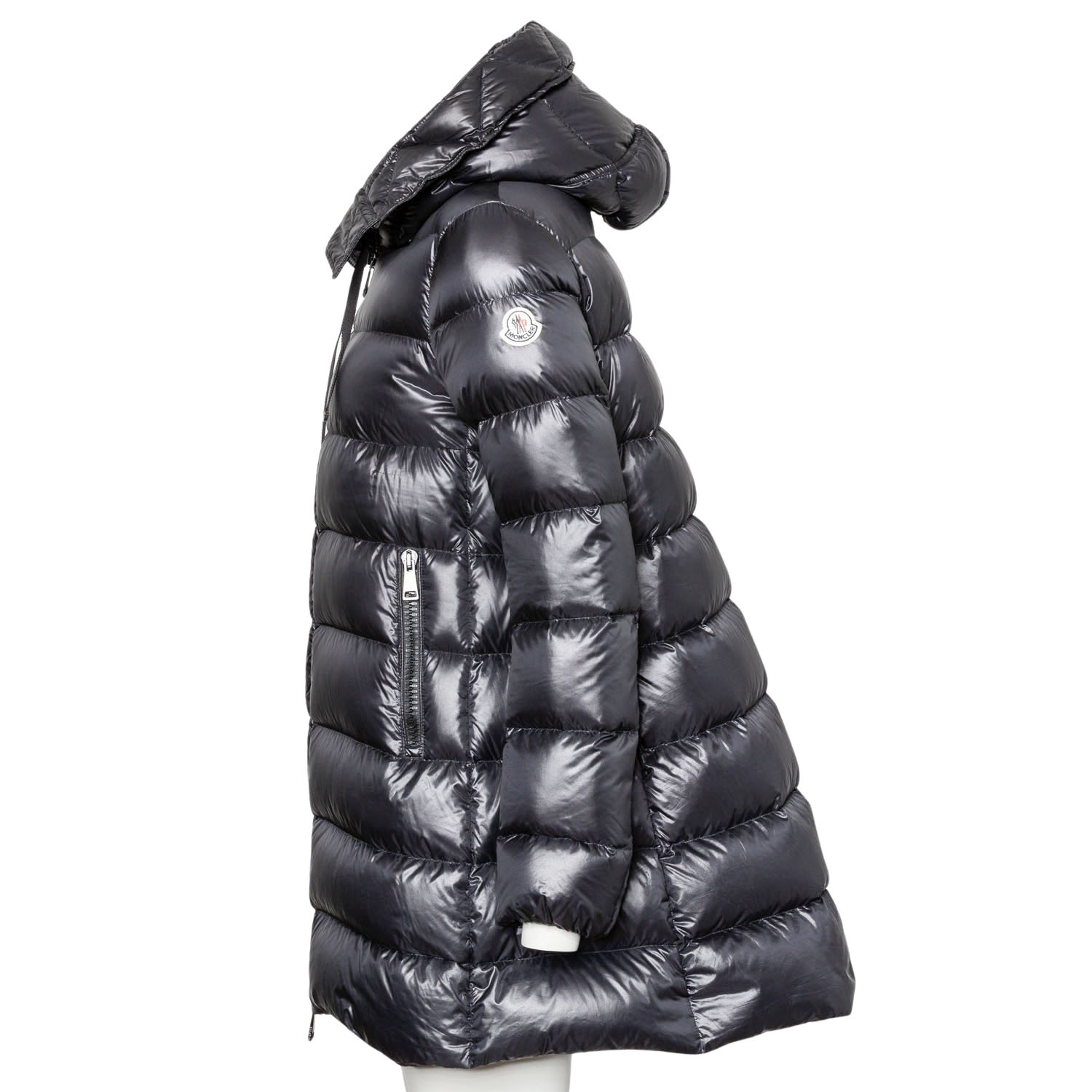 MONCLER Down quilted coat, size 2 (38). Cross-quilted down coat, mid-length in black with hood and black zippers. Very good condition.