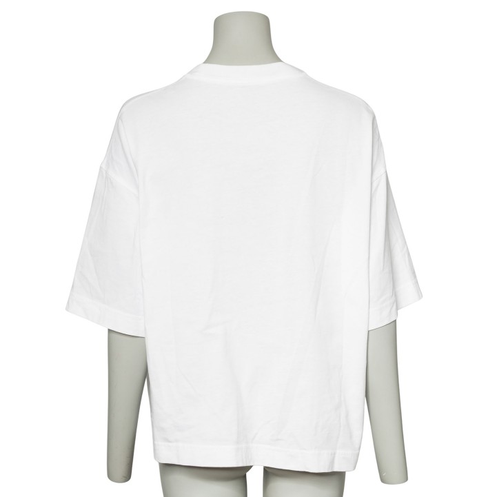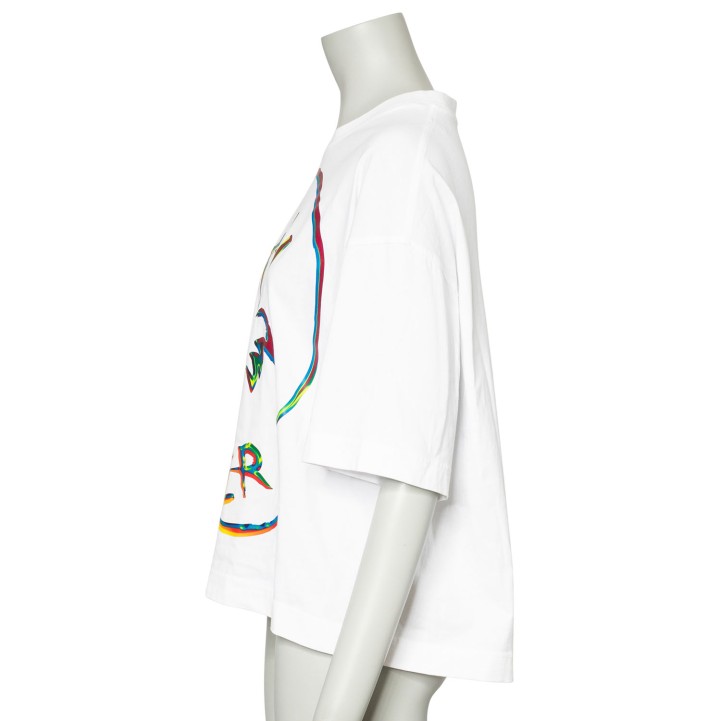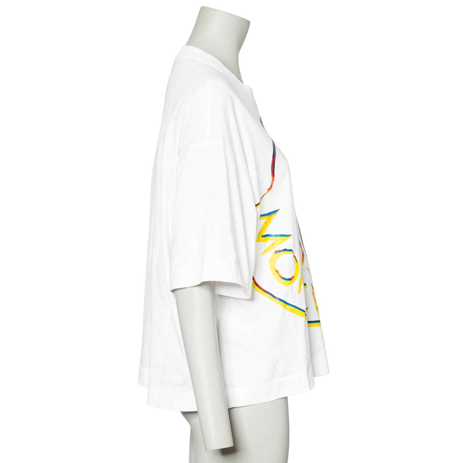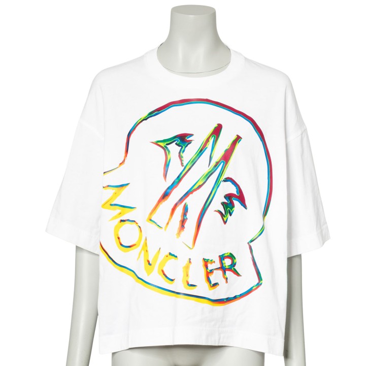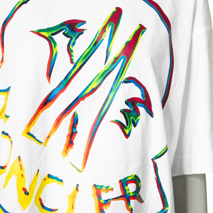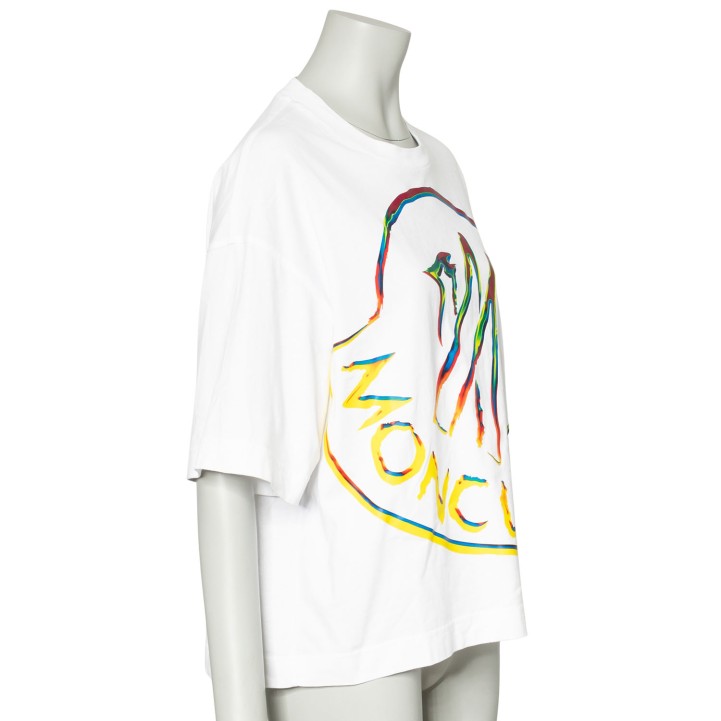 MONCLER T-Shirt, size L. White model with multicolour logo motif. Signs of wear present, laundry label removed.