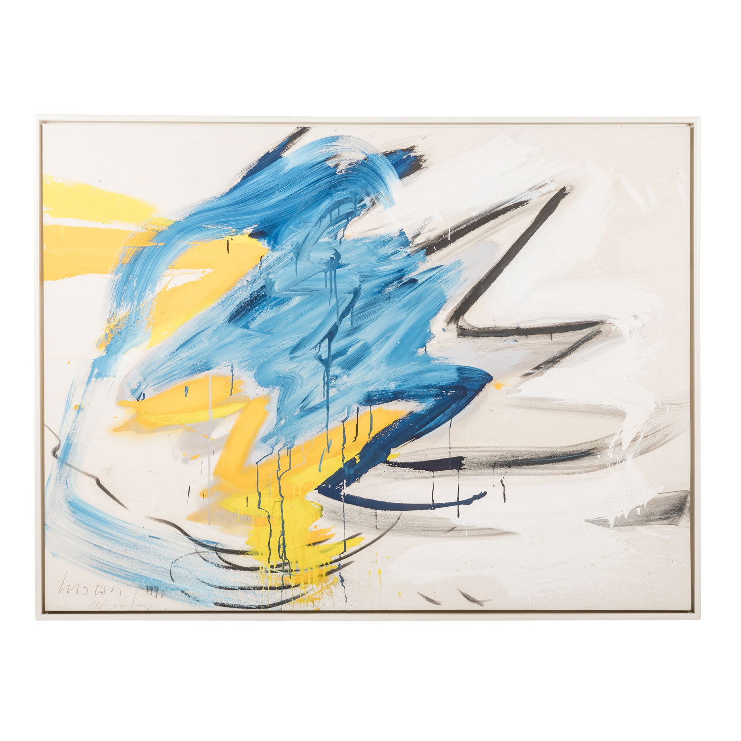 MORONTI, MARIO (born 1950), 'Schramberg', 1990, abstract composition, signed, dated and titled lower left, verso inscribed, mixed media/canvas, HxW: approx. 150x200 cm (157x206 cm with frame). Slight traces of age. Mounted in frame. SHIPPING UNFORTUNATELY NOT POSSIBLE - ONLY FOR COLLECTORS.