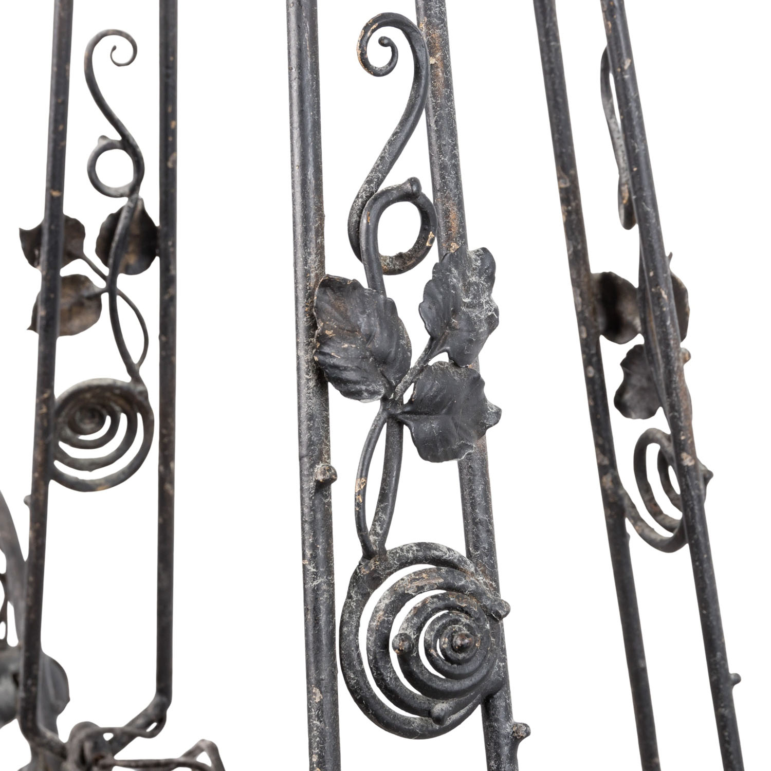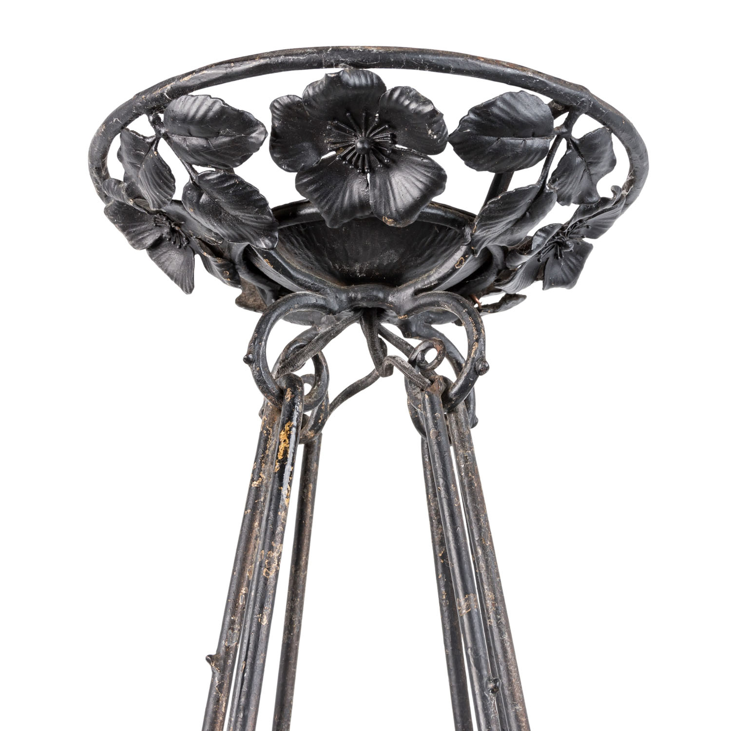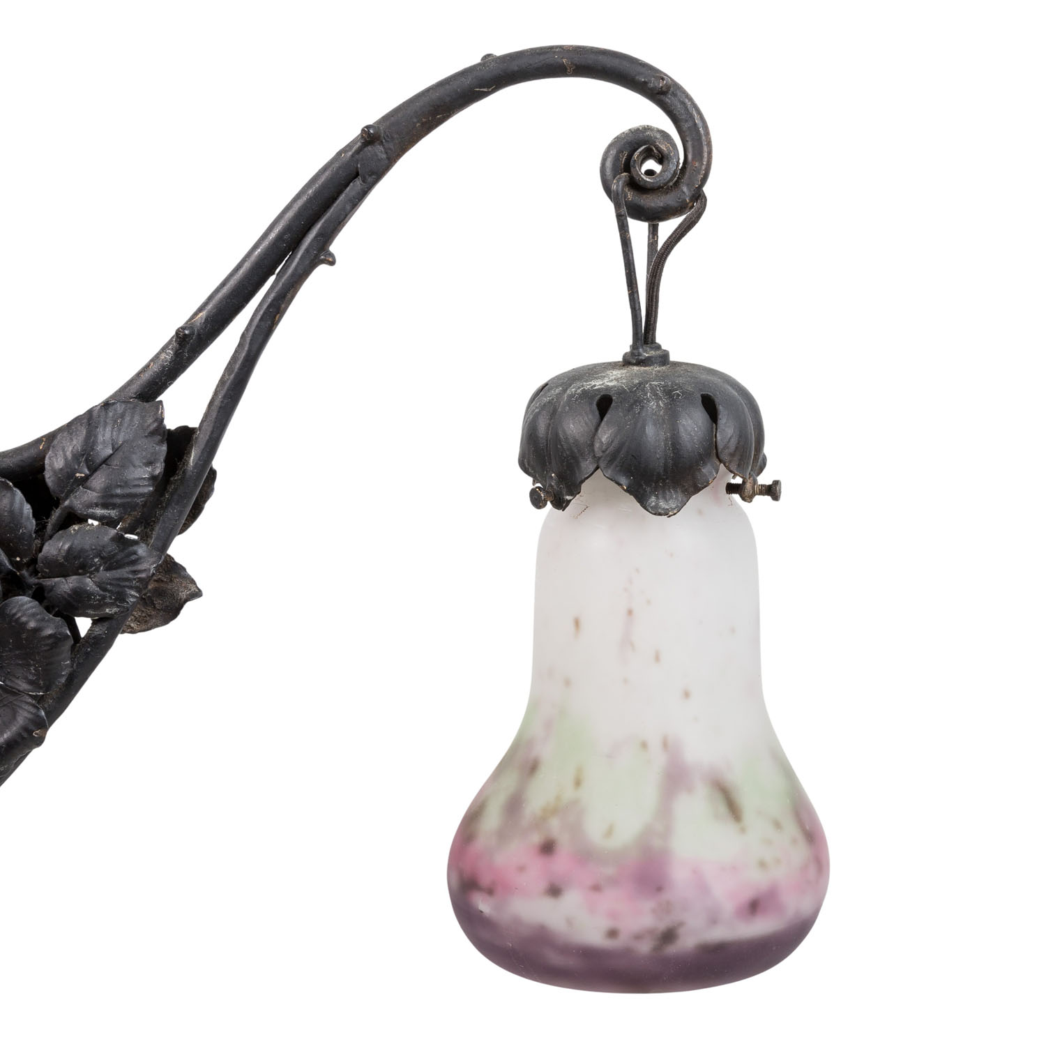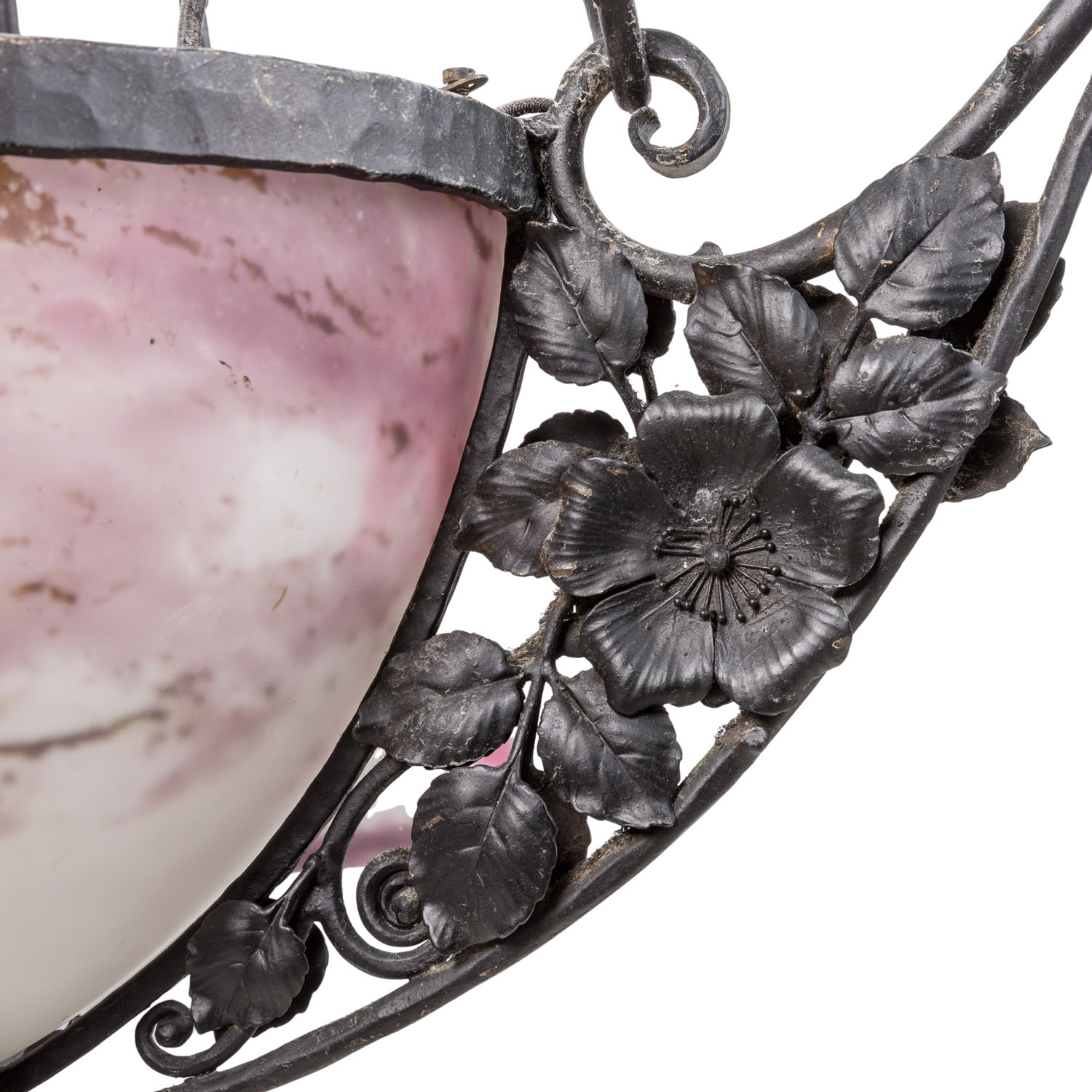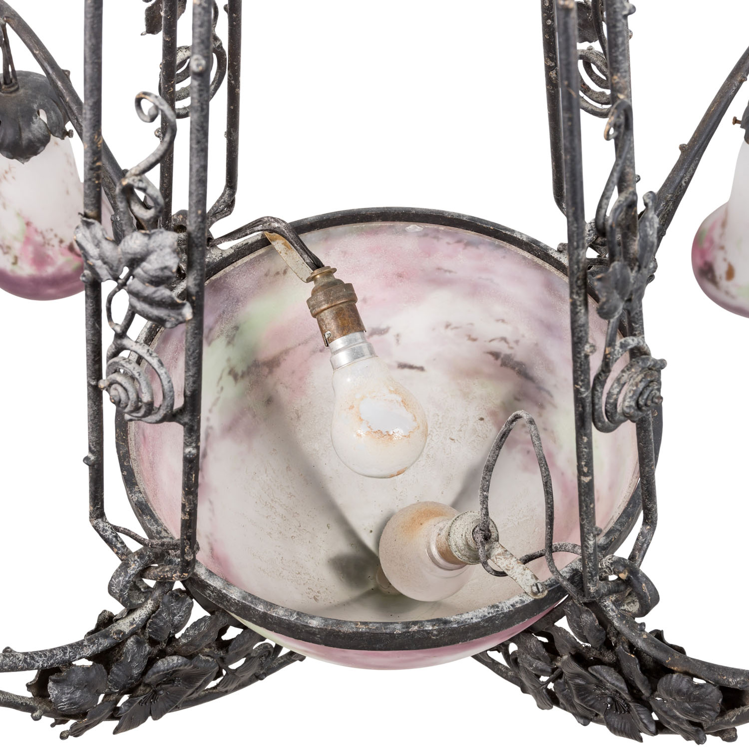 Lunéville, c. 1910/20, round hollowed central bowl with floral iron mounting and 4 flower-shaped lamp bells, marked “MULLER FILS LUNEVILLE” electrified, hxd: approx. 97/85 cm. Normal signs of age and wear.