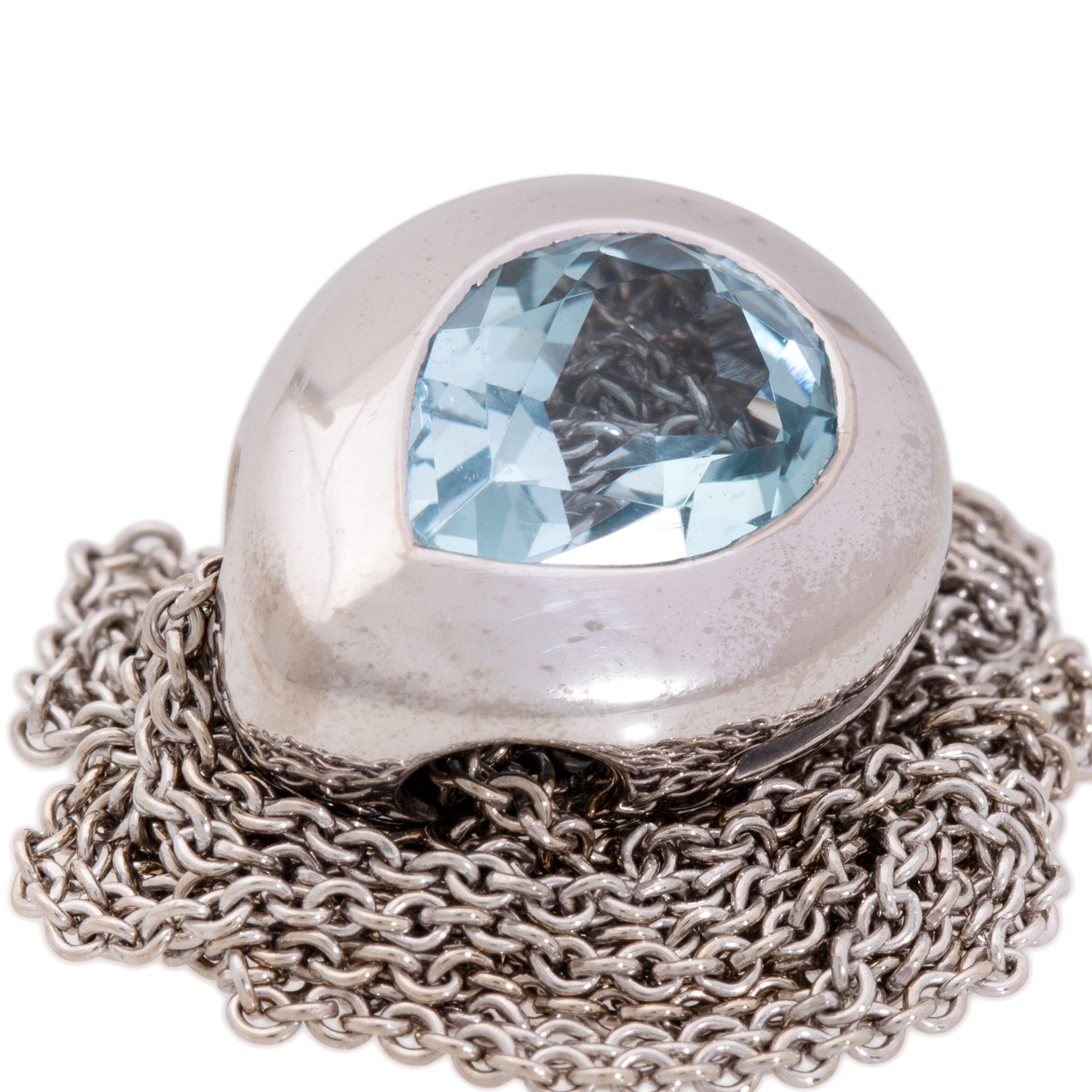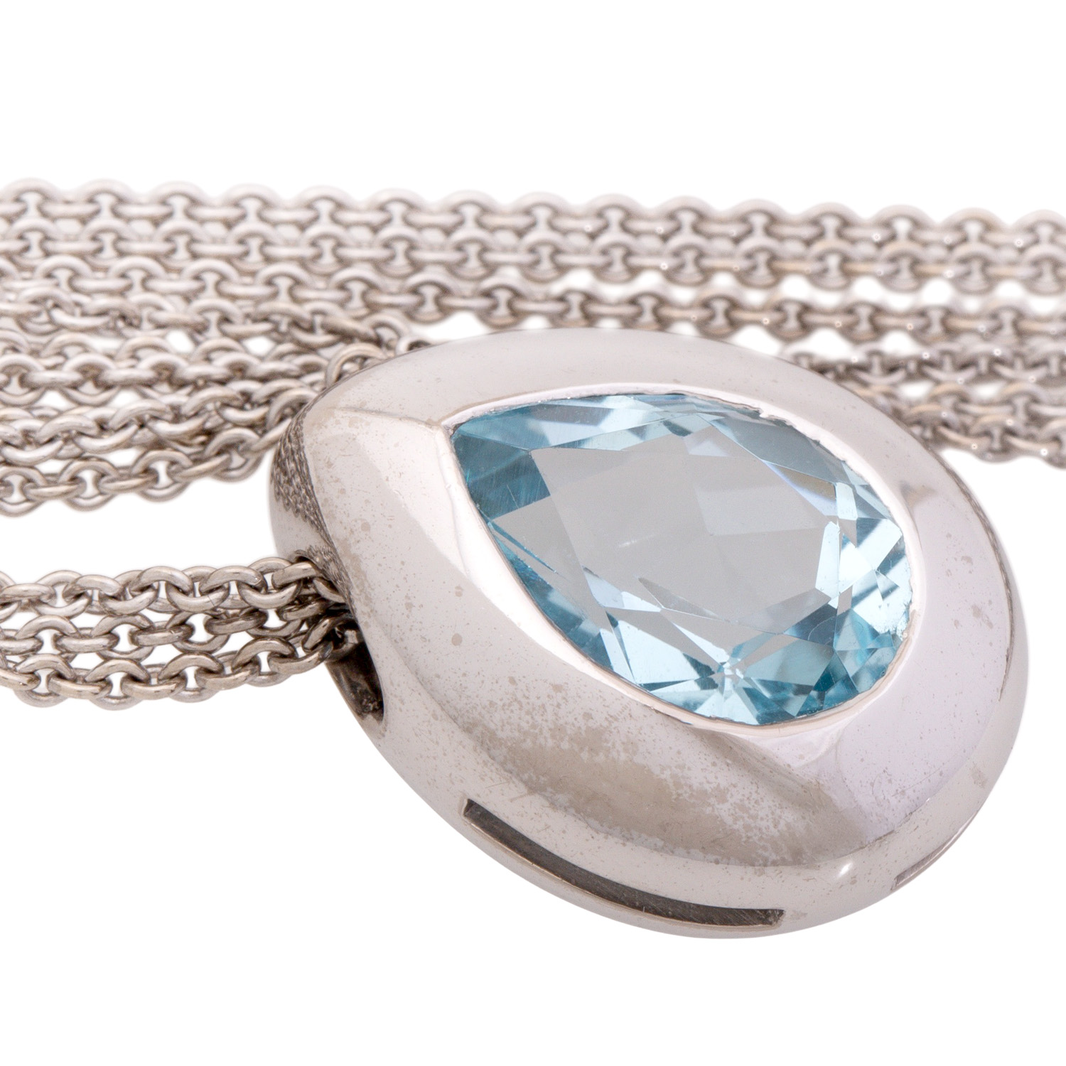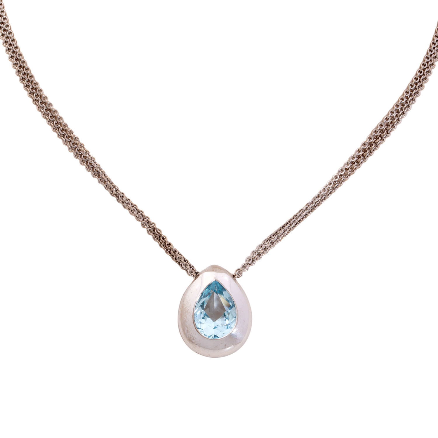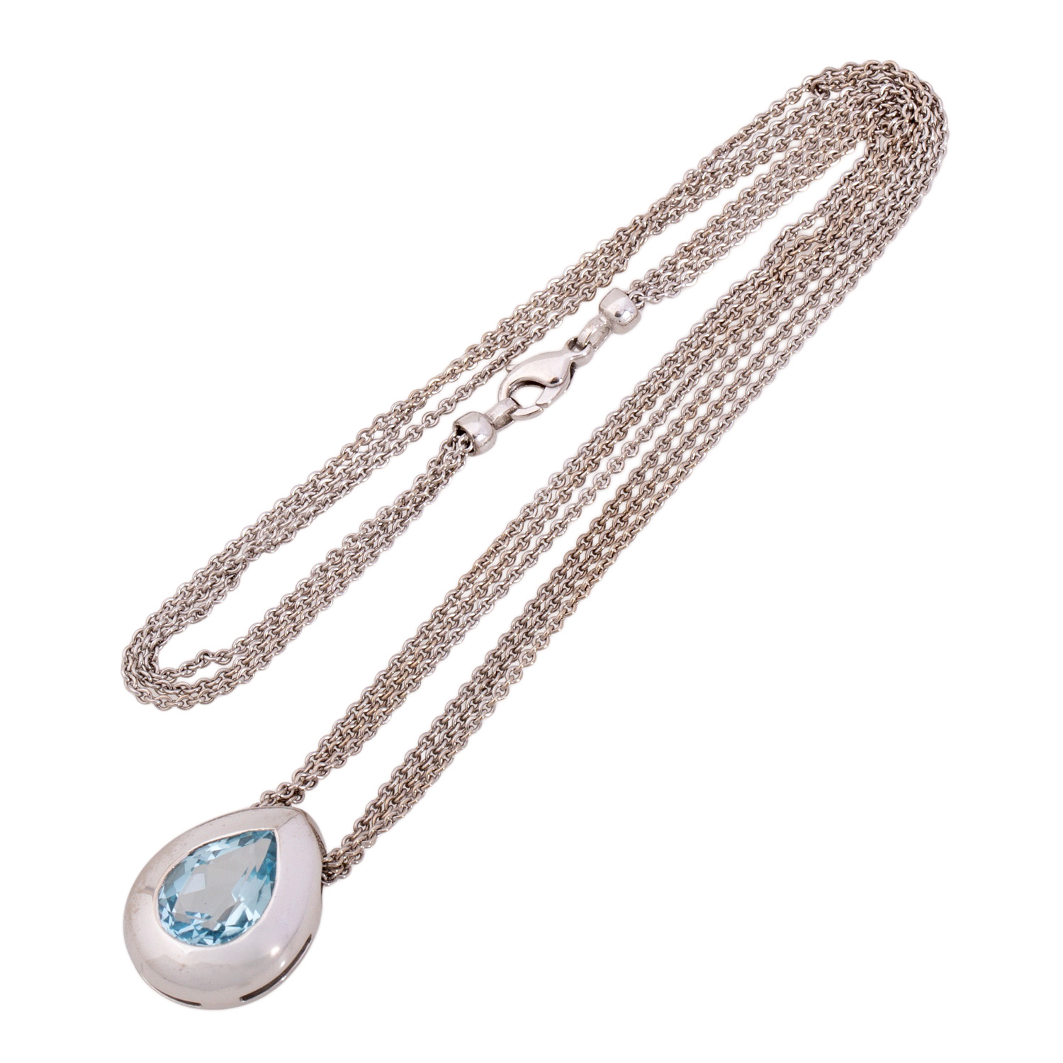 Nacklace and pendant with faceted teardrop-cut blue topaz, approx. 12.5 x 9.5 mm, 18K white gold, 20.6 g, pendant: L x W: approx. 20.8 x 16.5 mm, eyelet D: approx. 3.2 mm, triple anchor chain L: approx. 39 cm, W: approx. 1.5 mm per strand, with carabiner and eyelet D: approx. 2.7 mm, 21st century, minimal signs of wear, with hallmark.