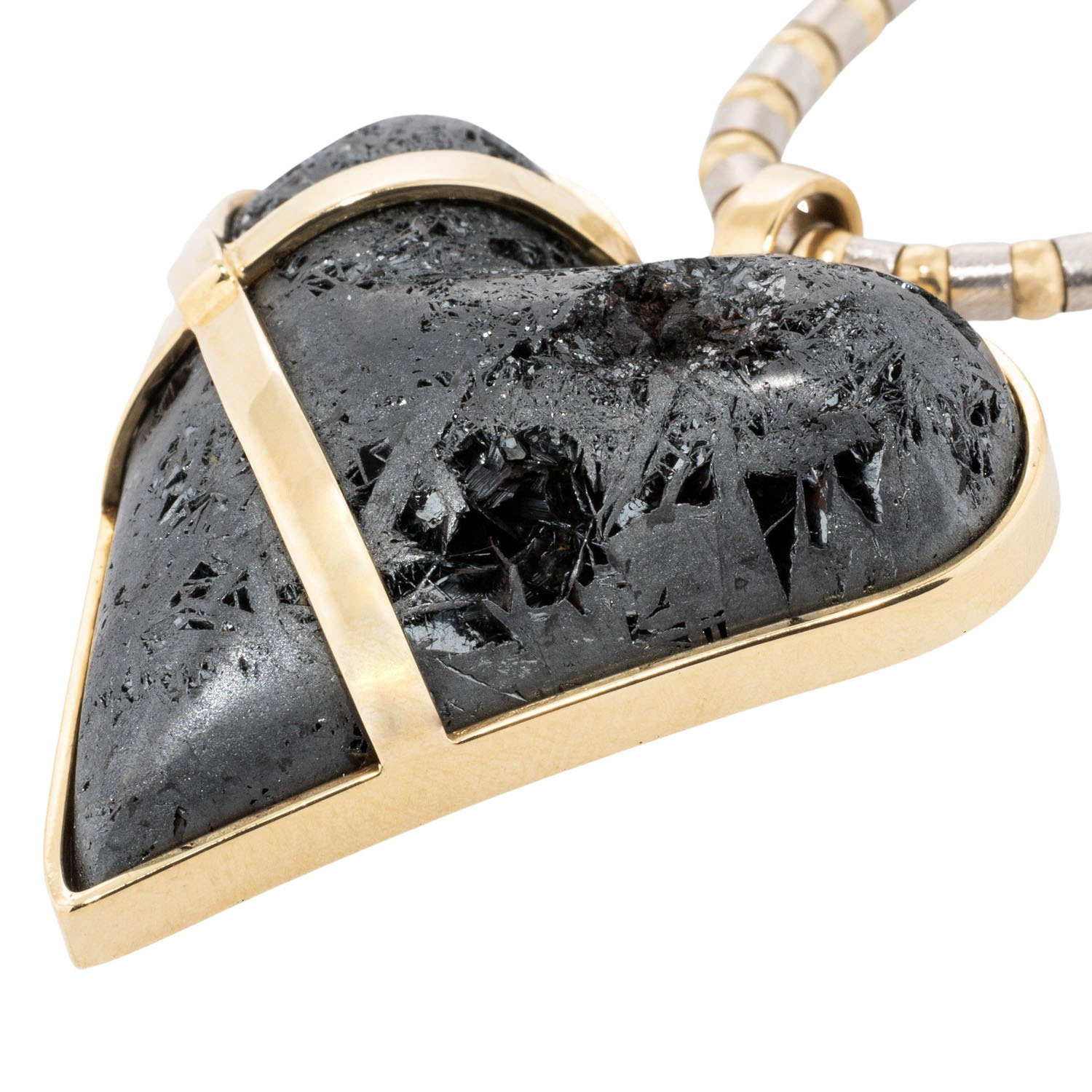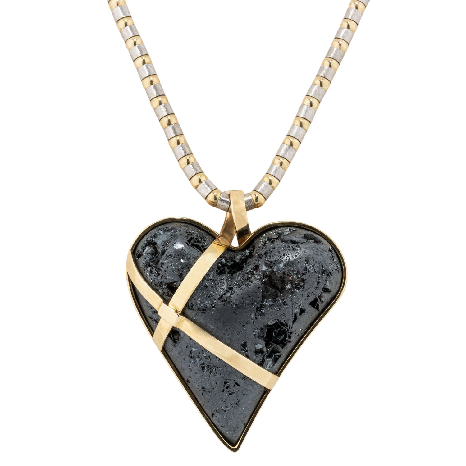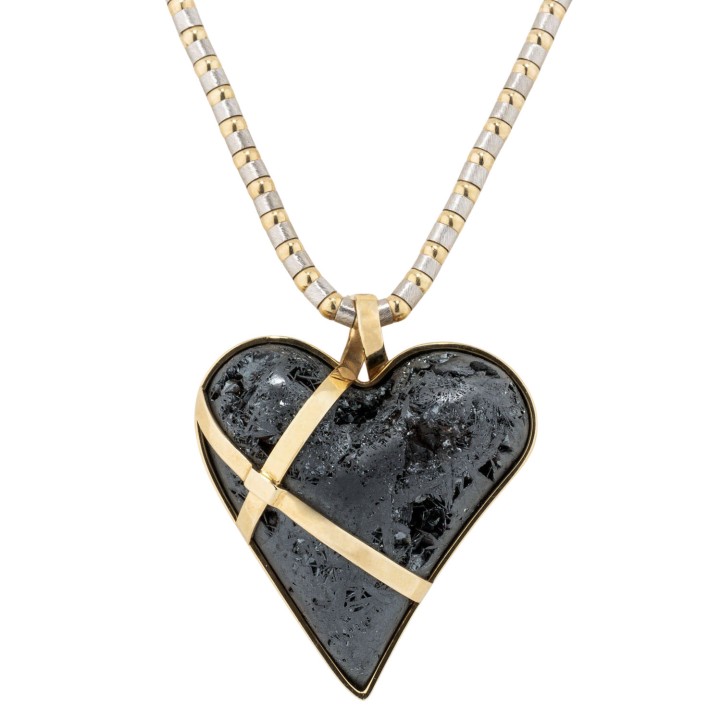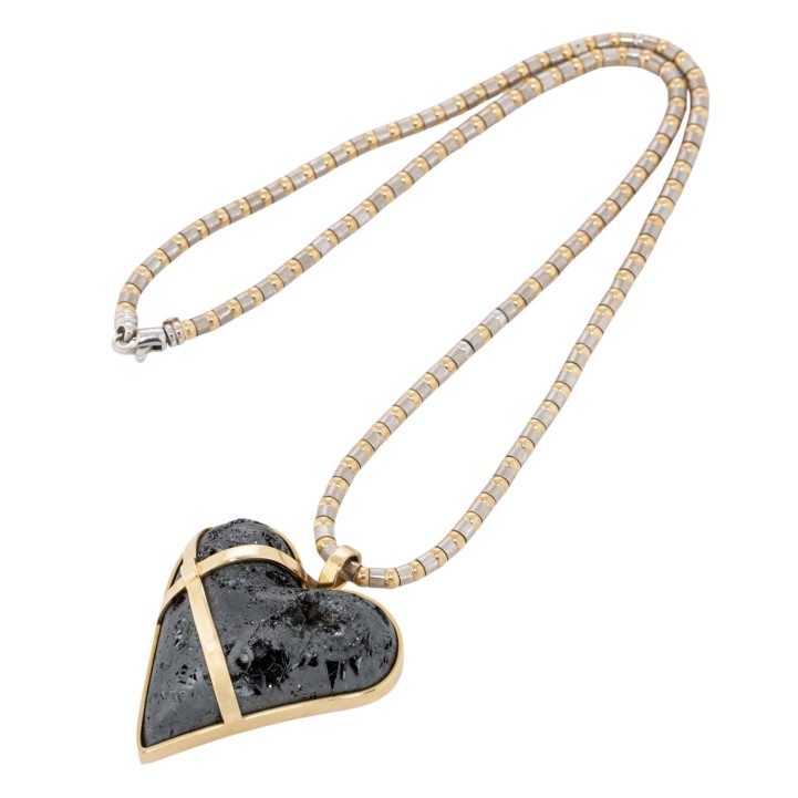 Necklace and pendant with hematite heart, pendant YG ca. 700/000, necklace 14K WG/YG, 52.9 g, necklace L: ca. 45 cm, pendant L: ca. 4.5 cm, 21st century, minor signs of wear, incl. certificate (2007).