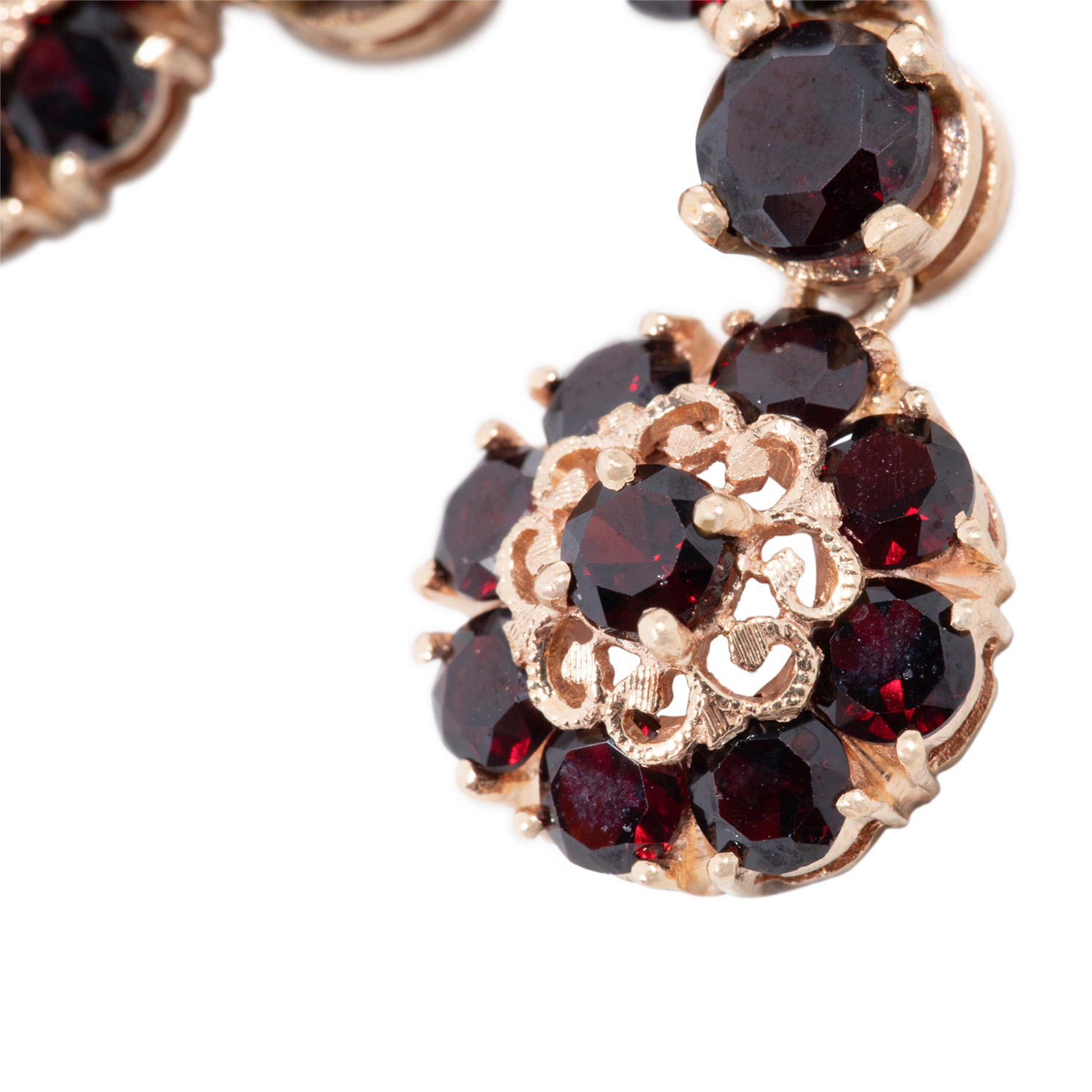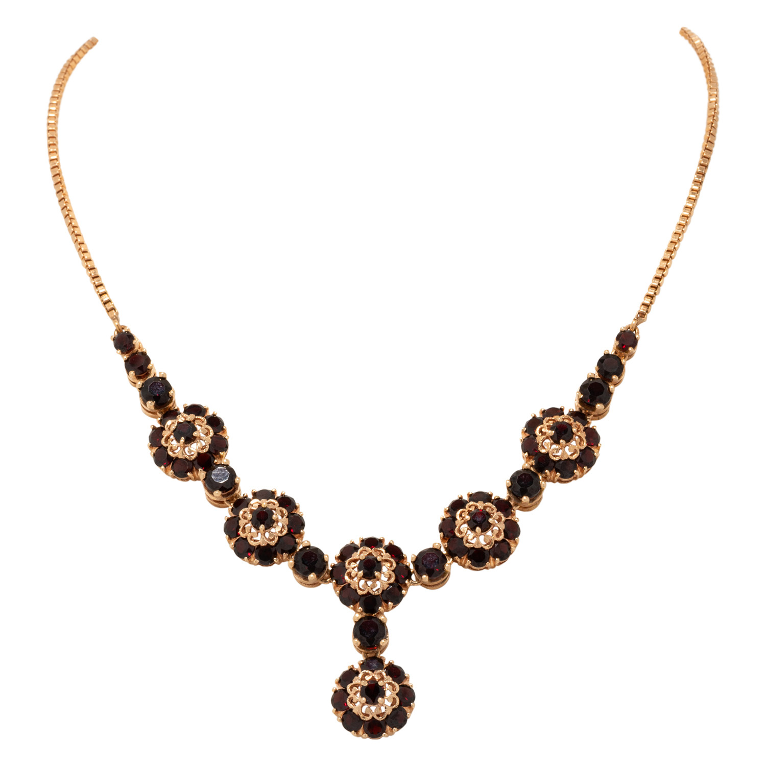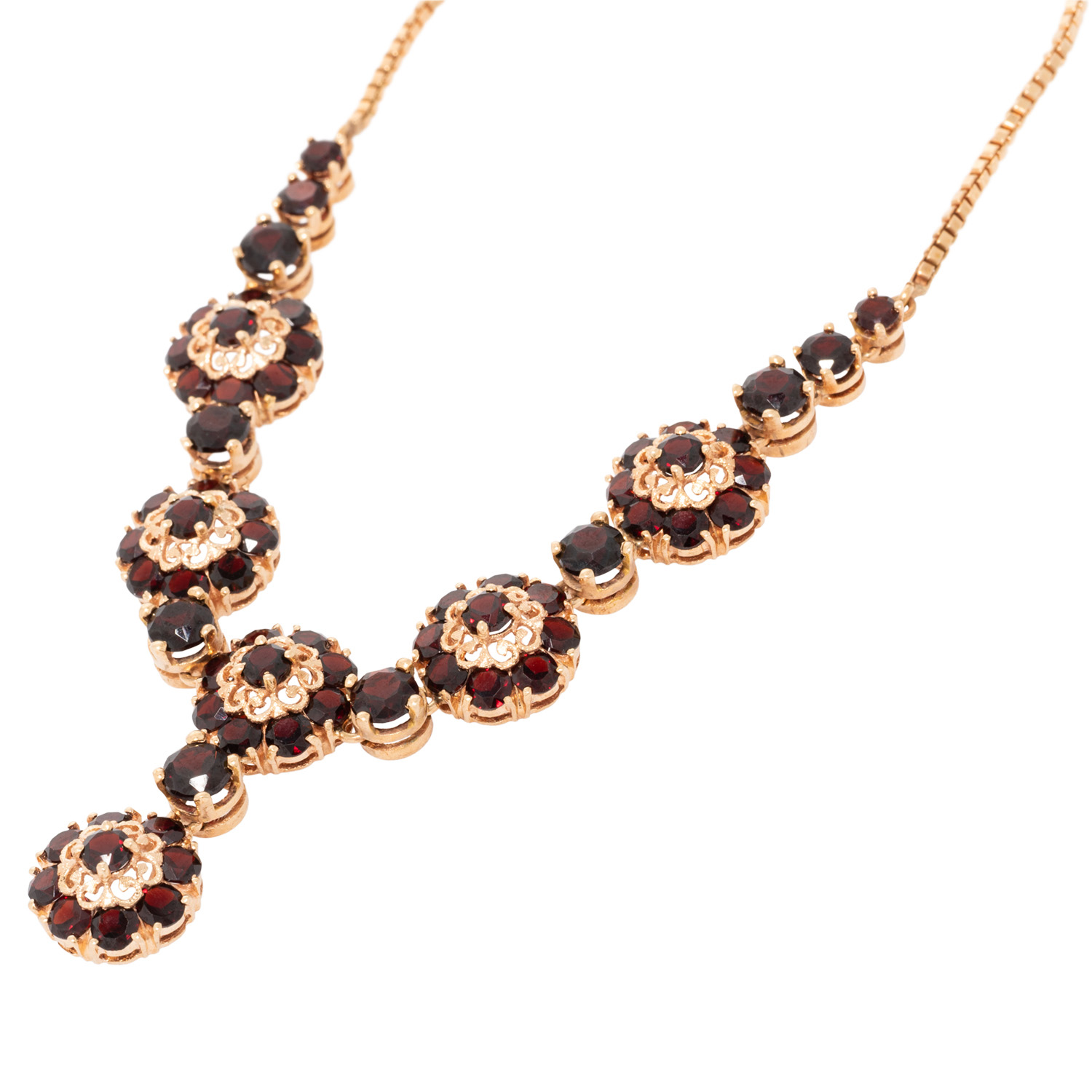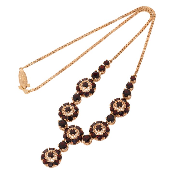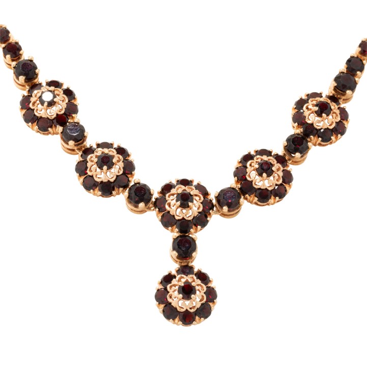 Necklace mid-section of flower rosettes set with garnet in necklace with floral clasp, 14K rose gold, 24 g, L: 44 cm, 2nd half of 20th century, good condition, solid and carefully crafted.
