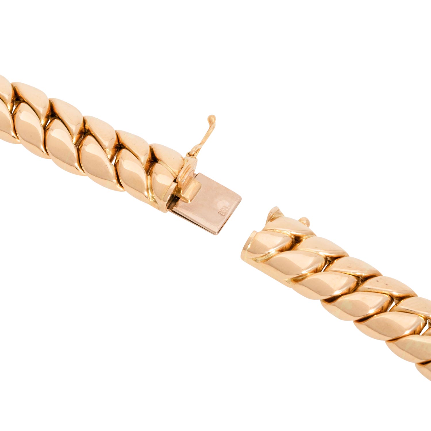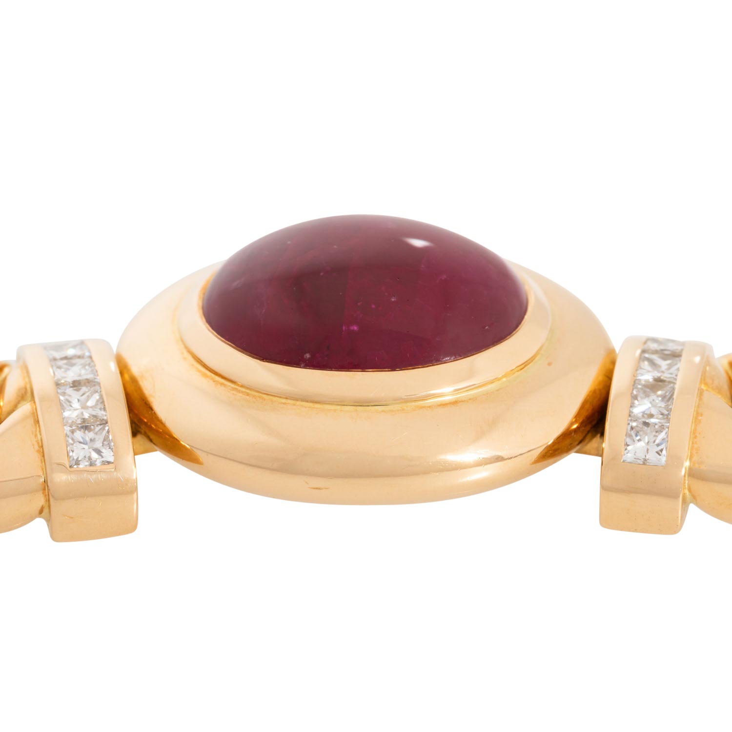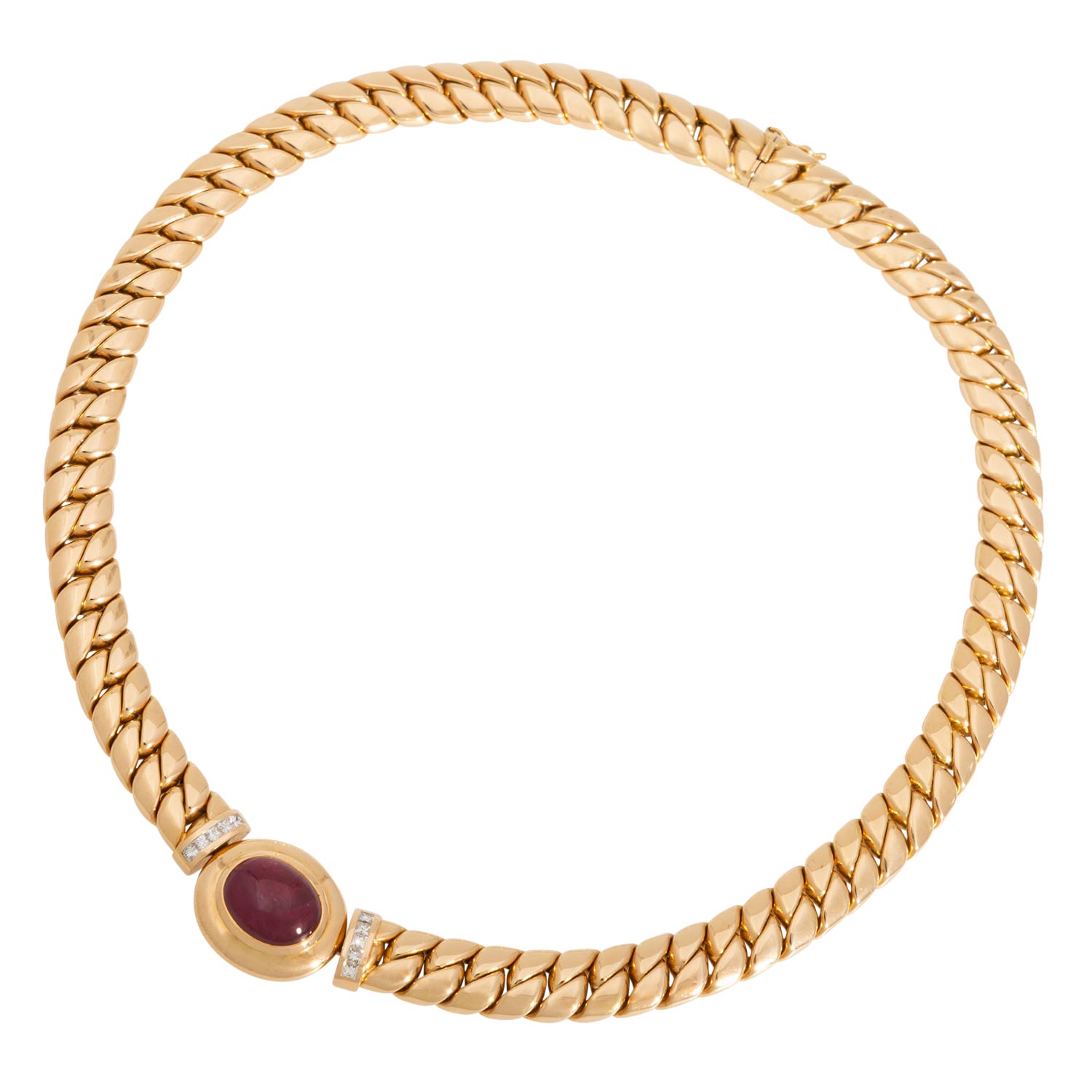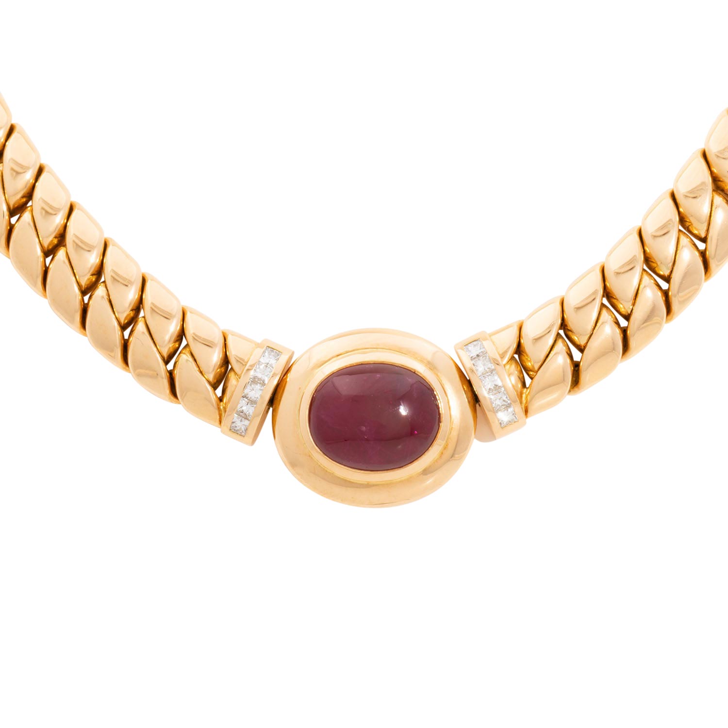 Necklace, curb link necklace with ruby cabochon and 10 diamonds, in princess-cut, totalling approx. 0.60 ct, WHITE (H)/SI, ruby cabochon approx. 9.15 ct, in oval-cut approx. 14 x 11 mm, heated, 18K yellow gold, 108.7 g, L: approx. 44 cm, W: approx. 10 - 19 mm, end of 20th century, minimal signs of wear, with hallmark and case enclosed.