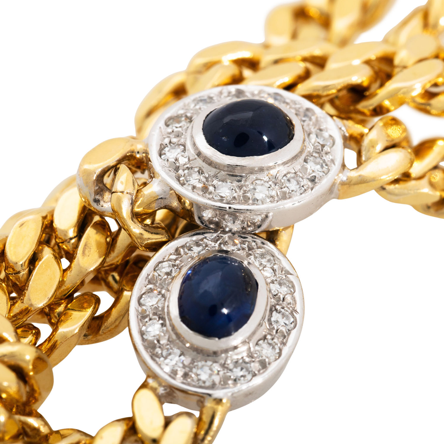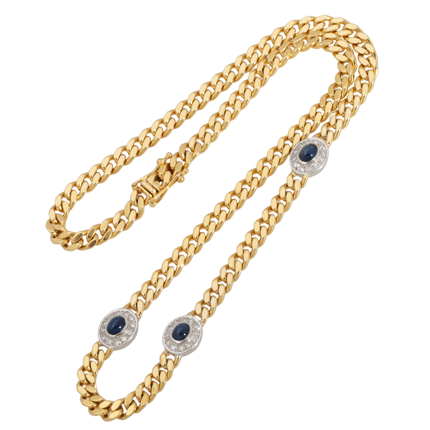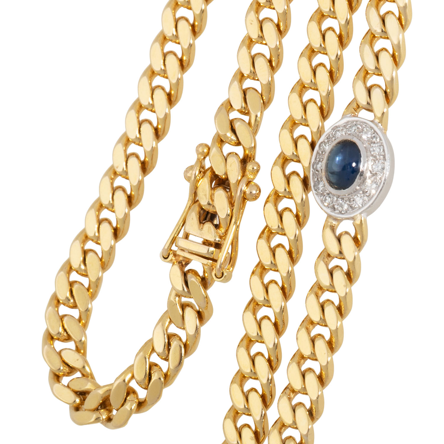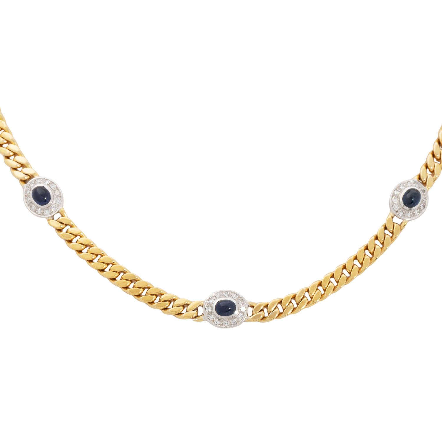Necklace, curb link chain with 3 sapphire cabochons and 36 single-cut diamonds totalling approx. 0.36 ct, good colour and clarity, oval-cut sapphire cabochons approx. 5 x 4 mm, 14K yellow gold/white gold, 32.9 g, L: approx. 42 cm, W: approx. 4.7 - 8.8 mm, end of 20th century, minor signs of wear, with hallmark.