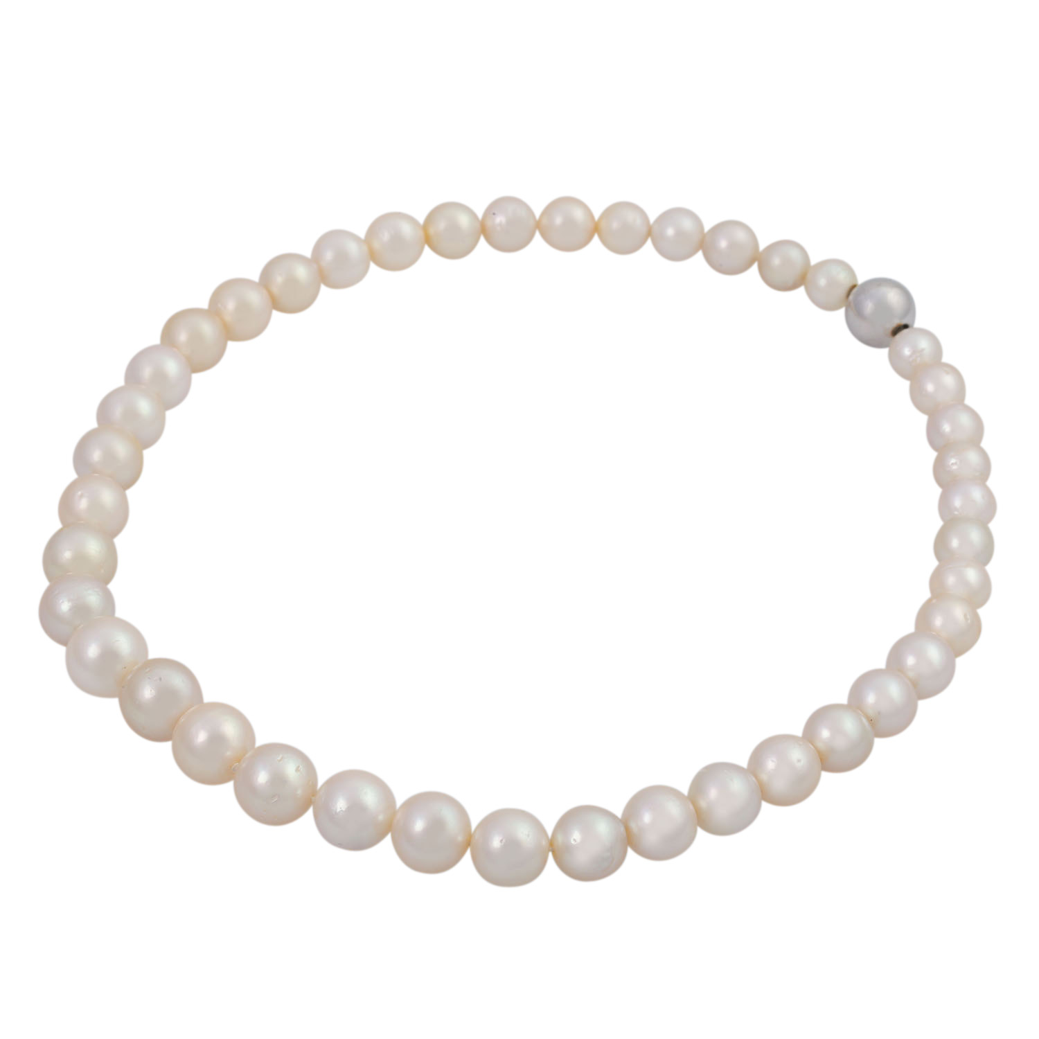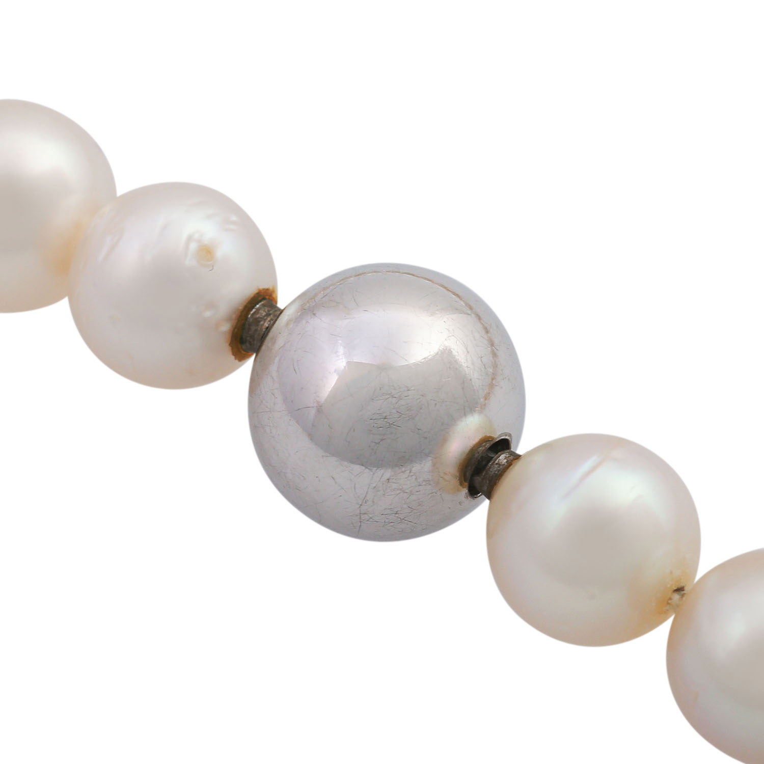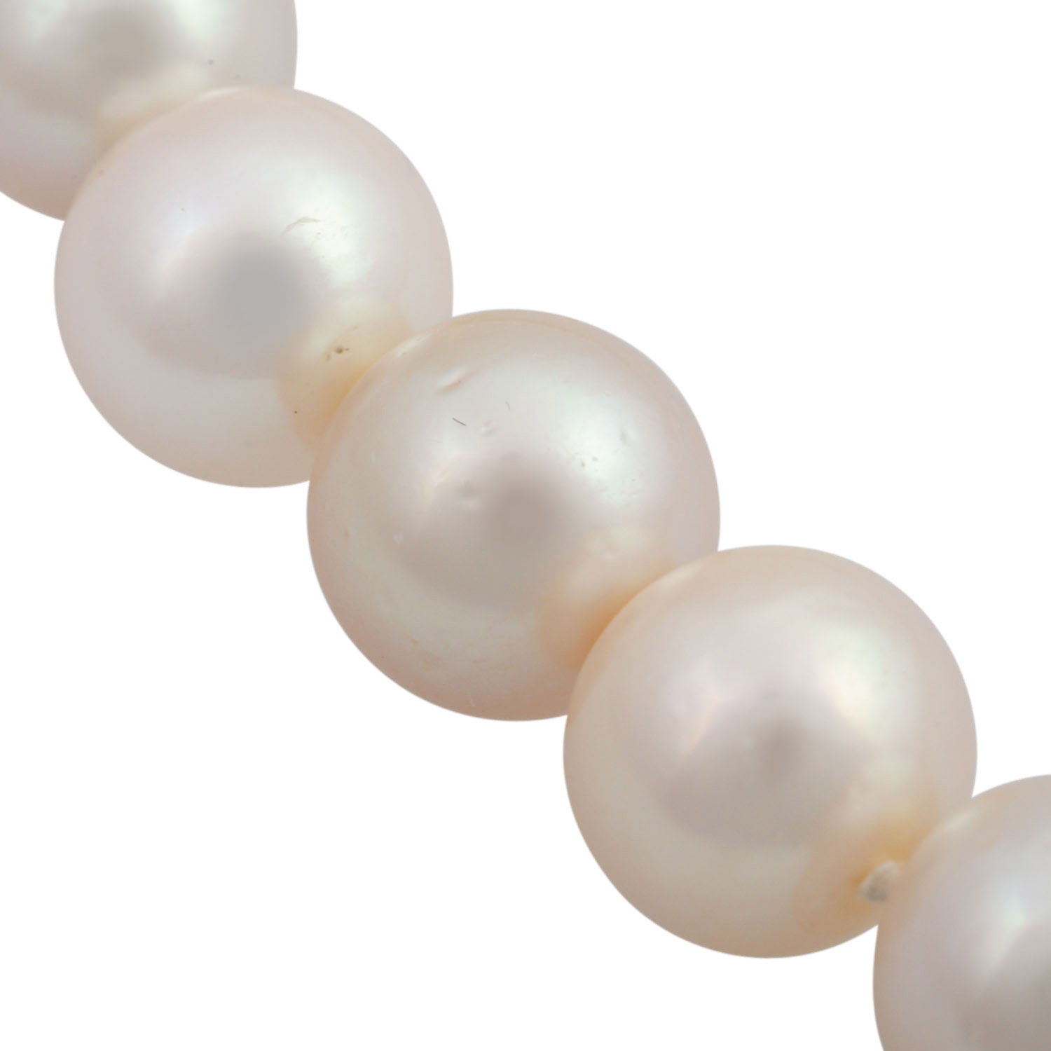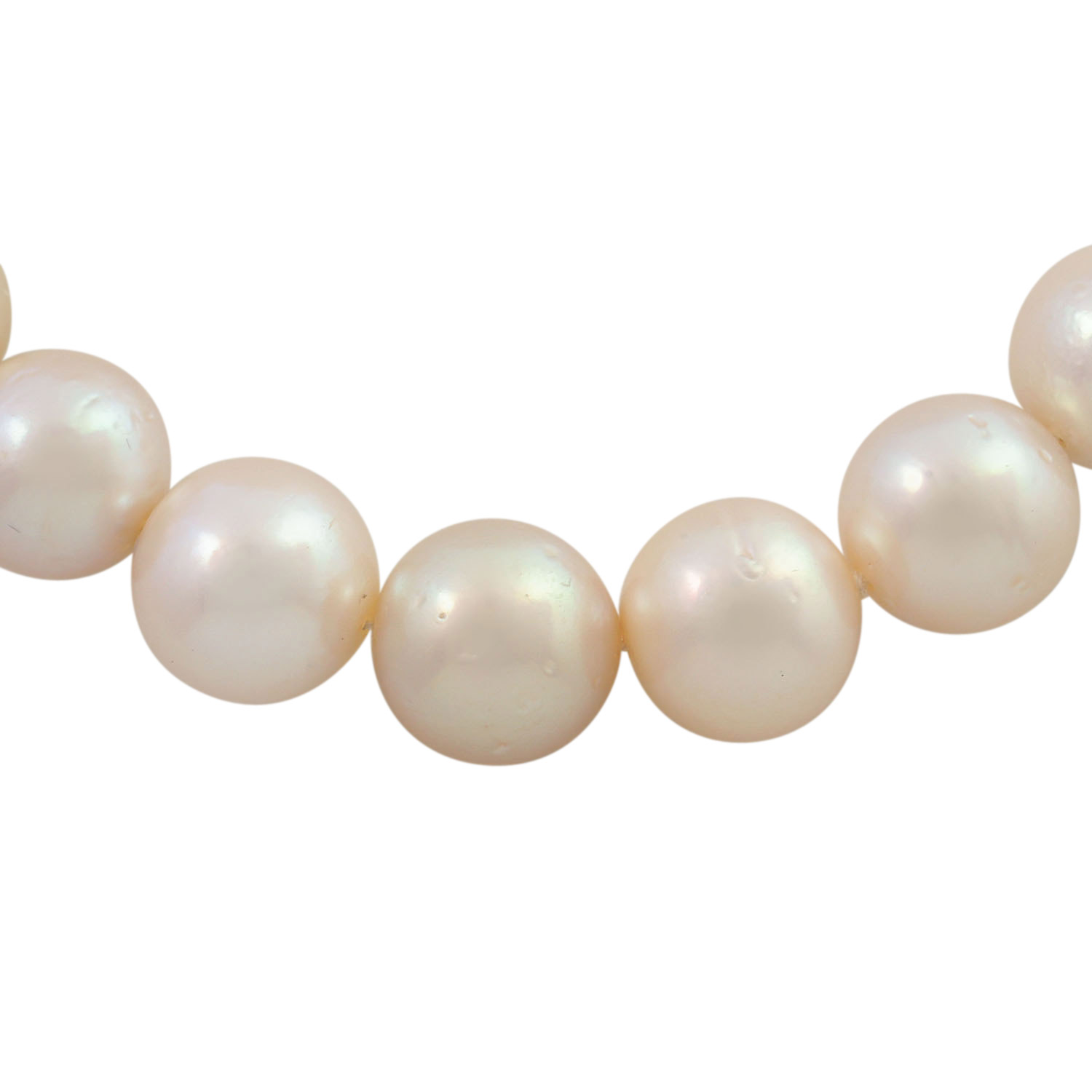 Necklace made of 41 fine white South Sea cultured pearls with light golden overtone with growth marks, graduating from 9.1-12.6 mm, clasp 18K WG, 76.2 gr, L: ca. 45 cm, around 2000, minimal signs of wear, incl. case, Wempe certificate and sales receipt (2002).