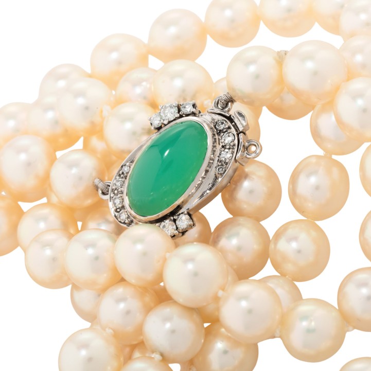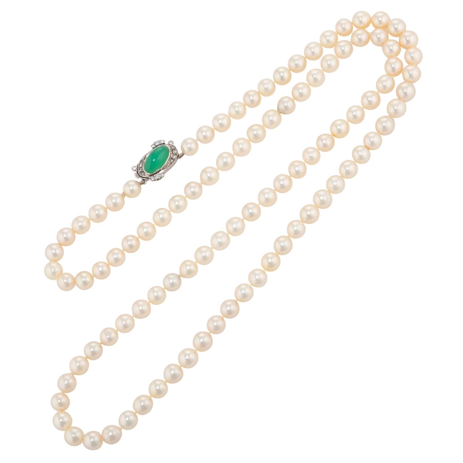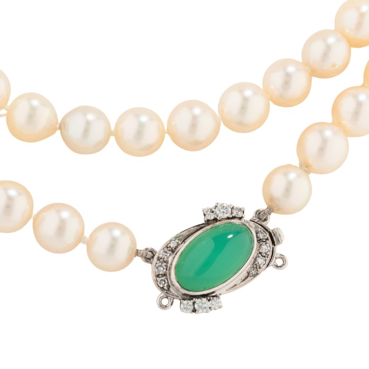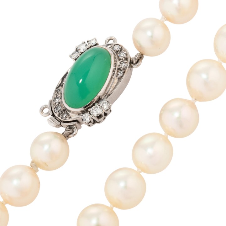 Long necklace of fine Akoya cultured pearls 8 mm with beautiful lustre, some with small chips, L: 87 cm, calsp of 18K white gold, with chrysoprase cabochon and diamonds, also usable as 2-row clasp, 2nd half of 20th century, all in all in good condition.