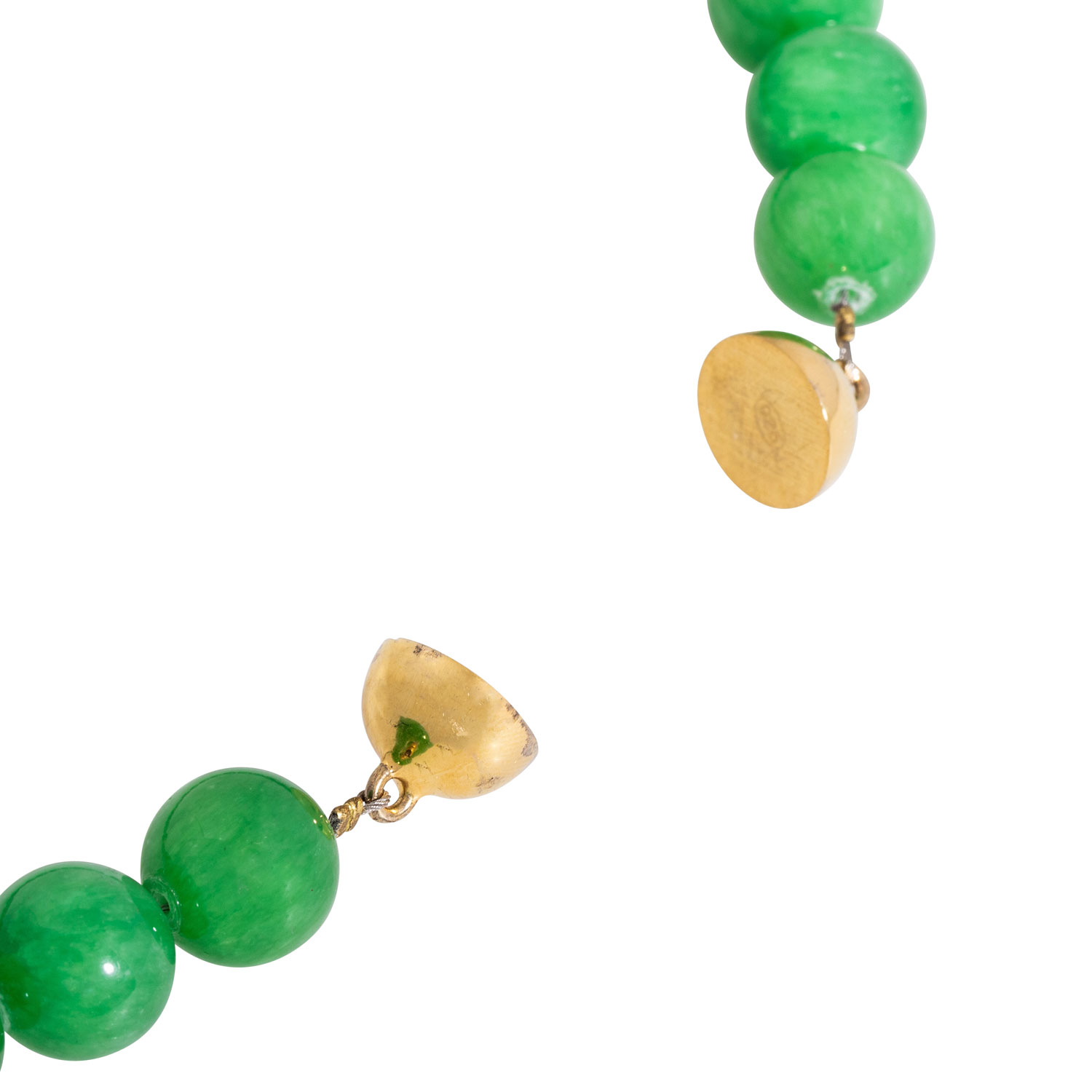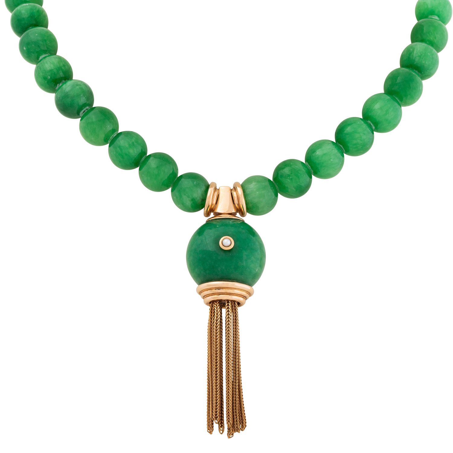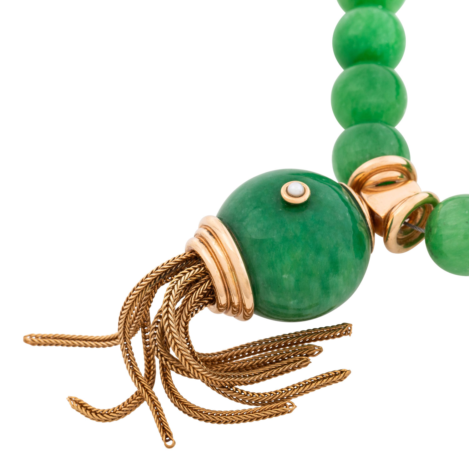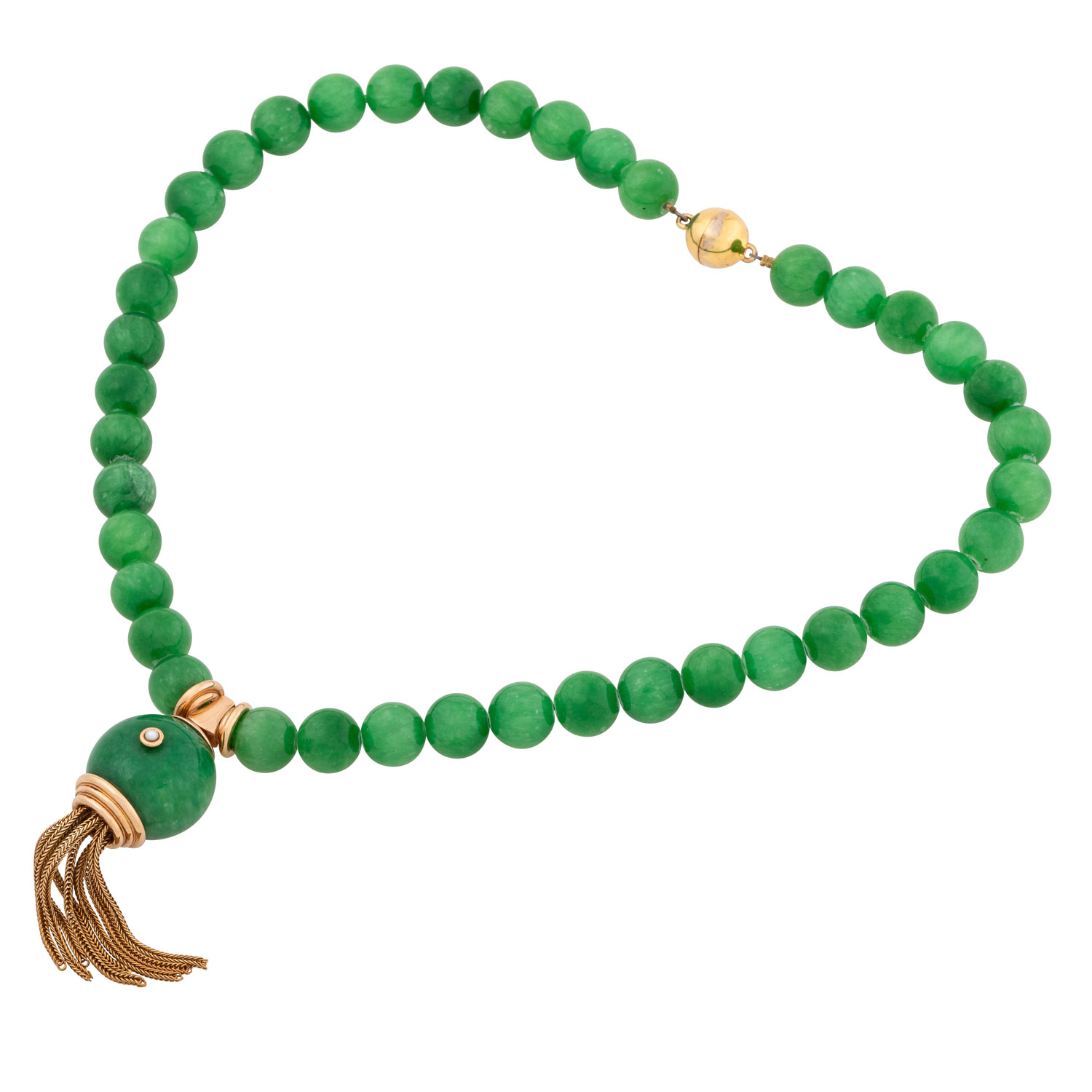 Necklace of jadeit beads with magnificent centrepiece of 18K yellow gold with small cultured pearl, beads D: 12 mm, coloured and stabilised, L: 50 cm, magnetic clasp of silver gilded, late 20th century, minor signs of wear, stabilisation at bore hole abraded, centrepiece elaborately crafted.