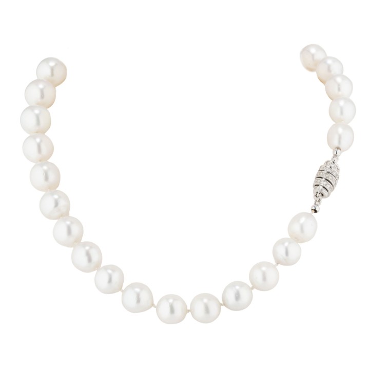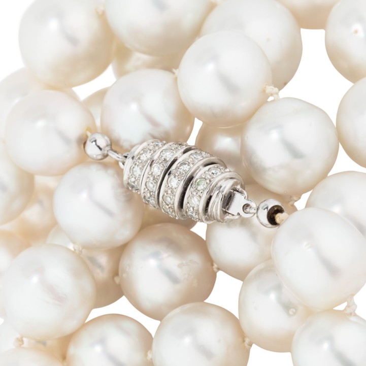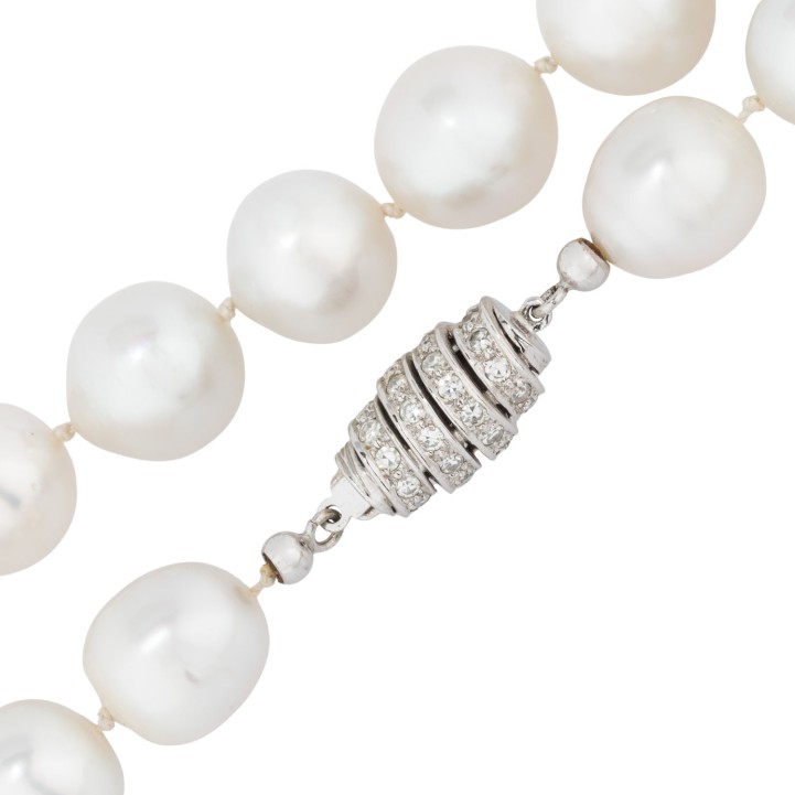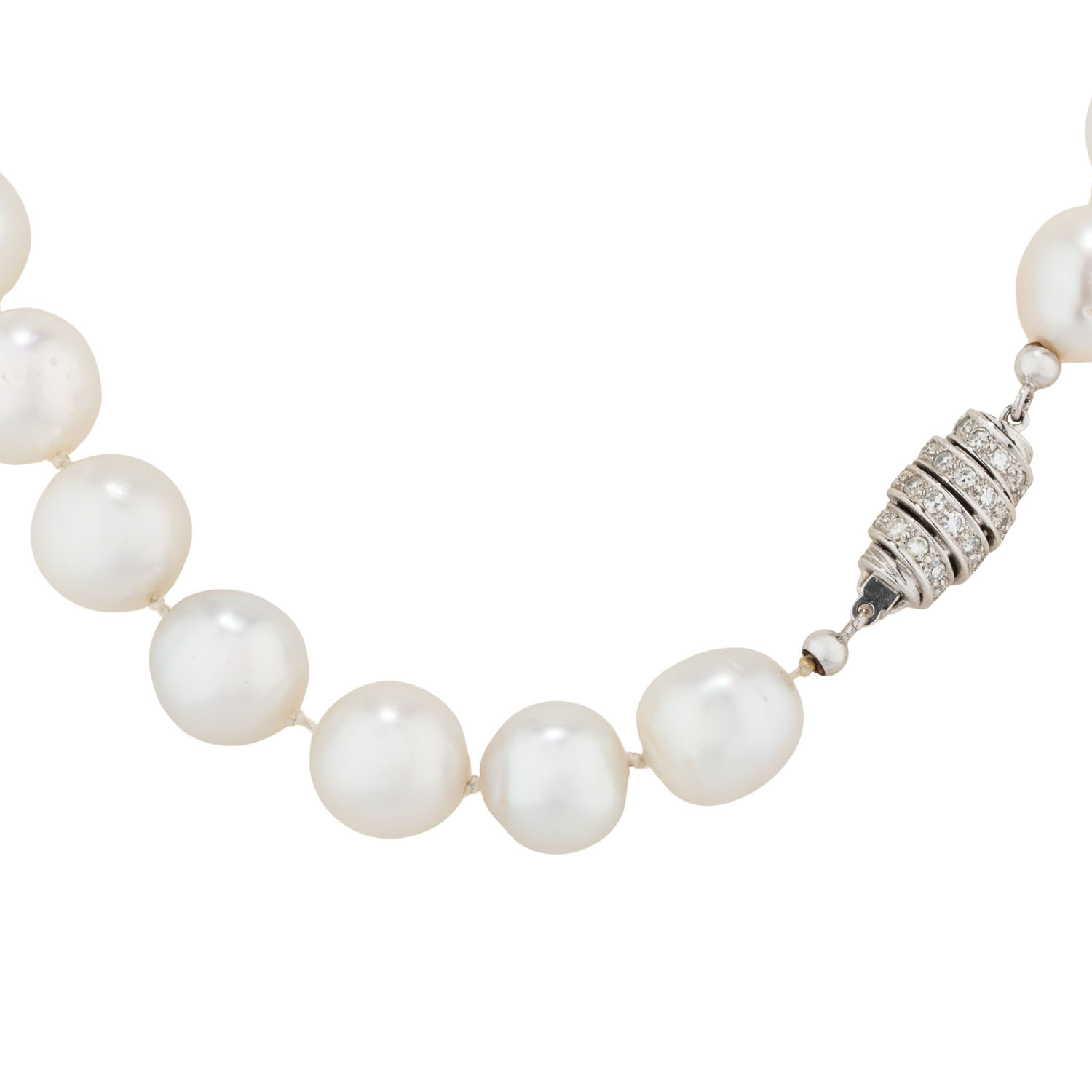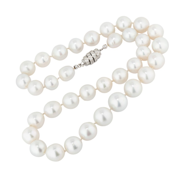 Necklace from South Sea cultured pearls graduating from 11 to 14.5 mm, partly slightly different shapes, beautiful lustre, L: 51 cm, clasp of 14K white gold with single-cut diamonds totalling ca. 0.5 ct, good colour and clarity, 20th/21st century, minor signs of wear.