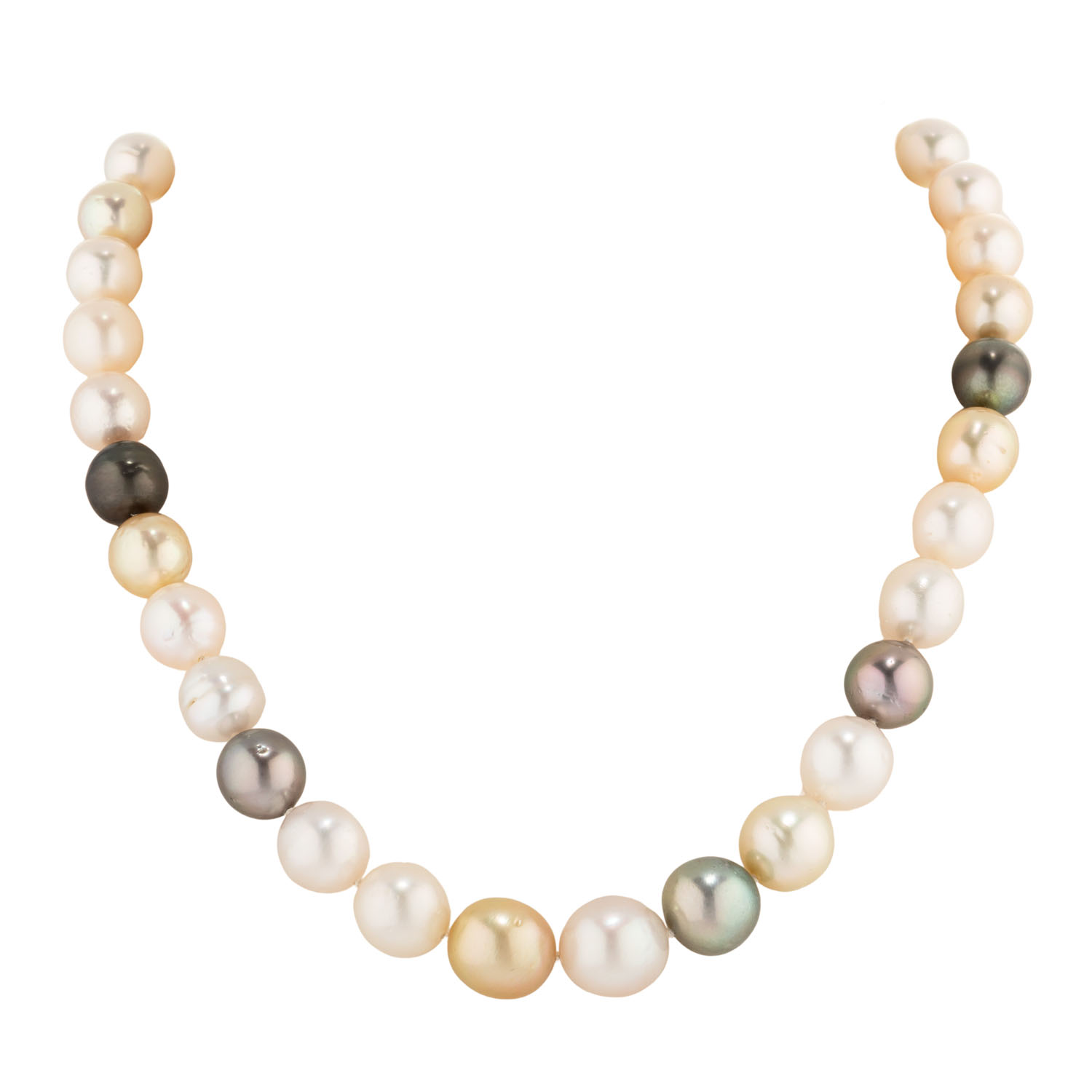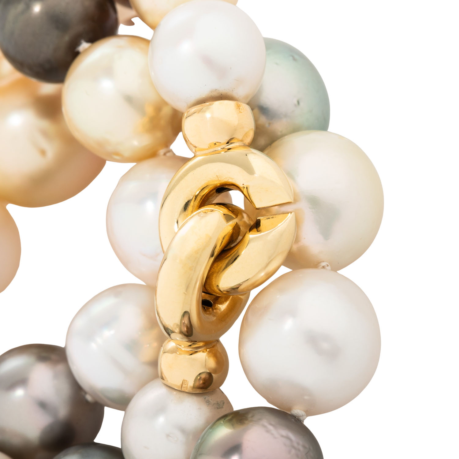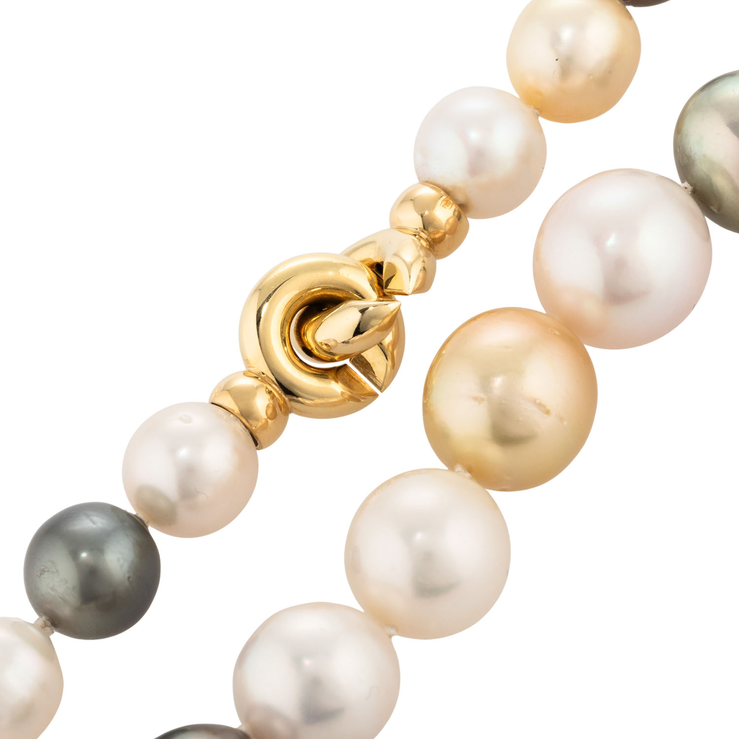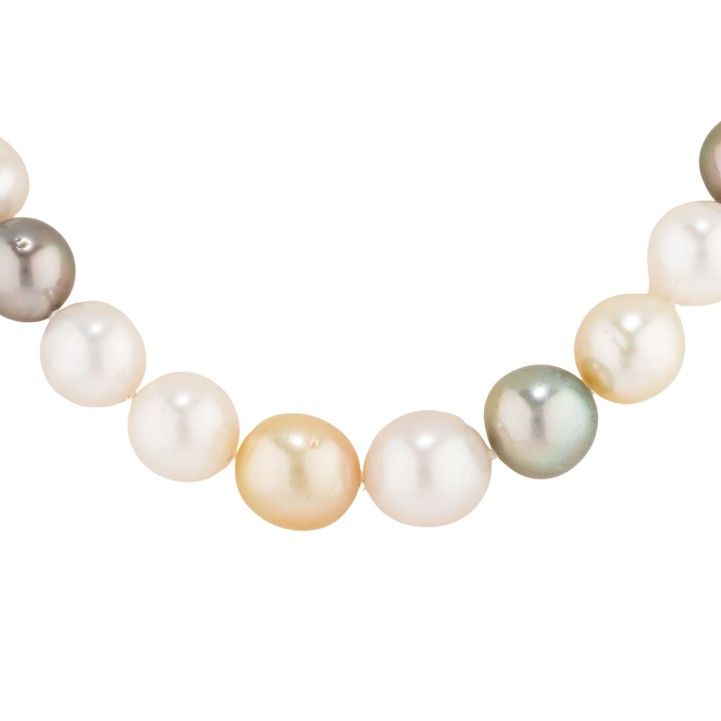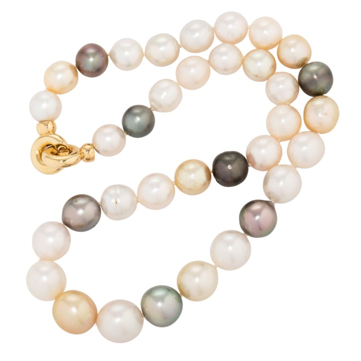 Necklace of Tahitian- and South Sea cultured pearls, multicolour, slighly graduating from 10 to 13 mm, clasp of 18K yellow gold, L: 44 cm, 20th/21st century, minor signs of wear.