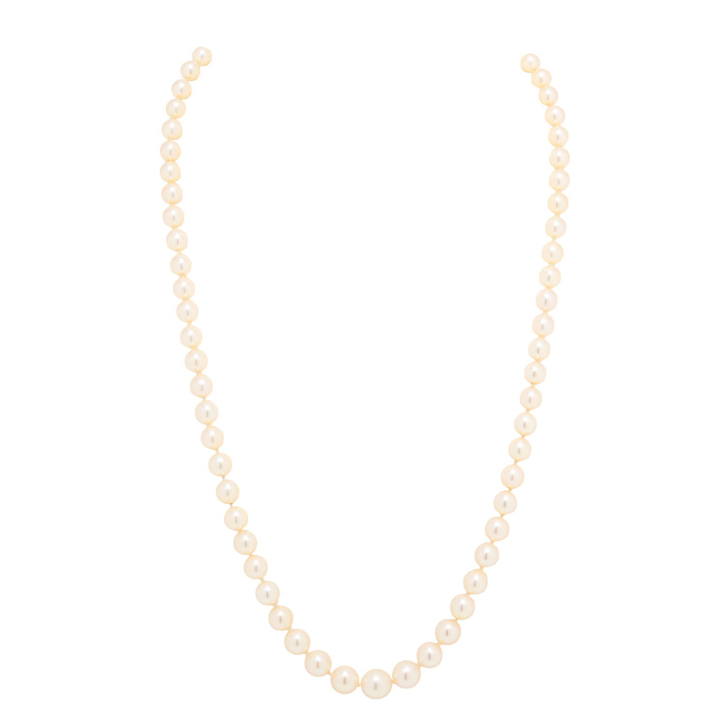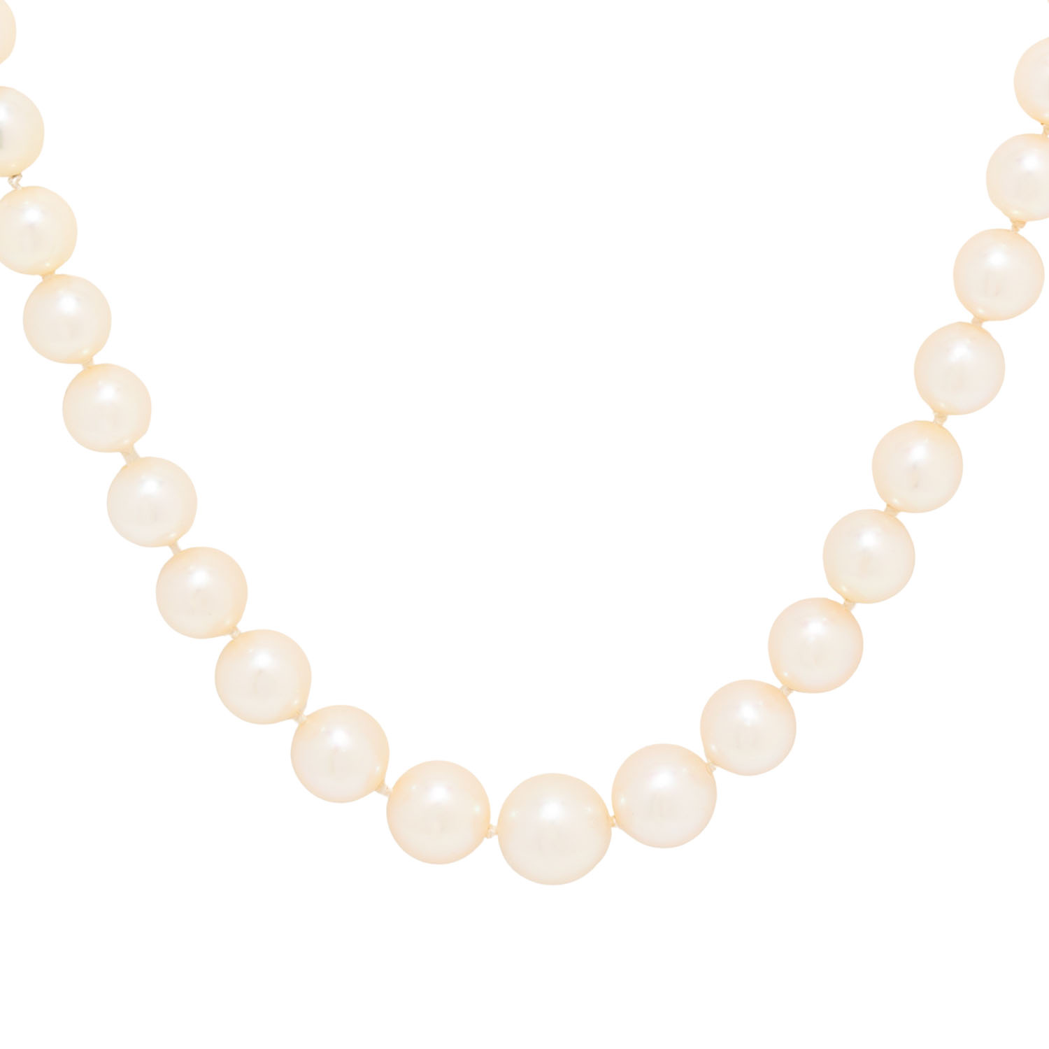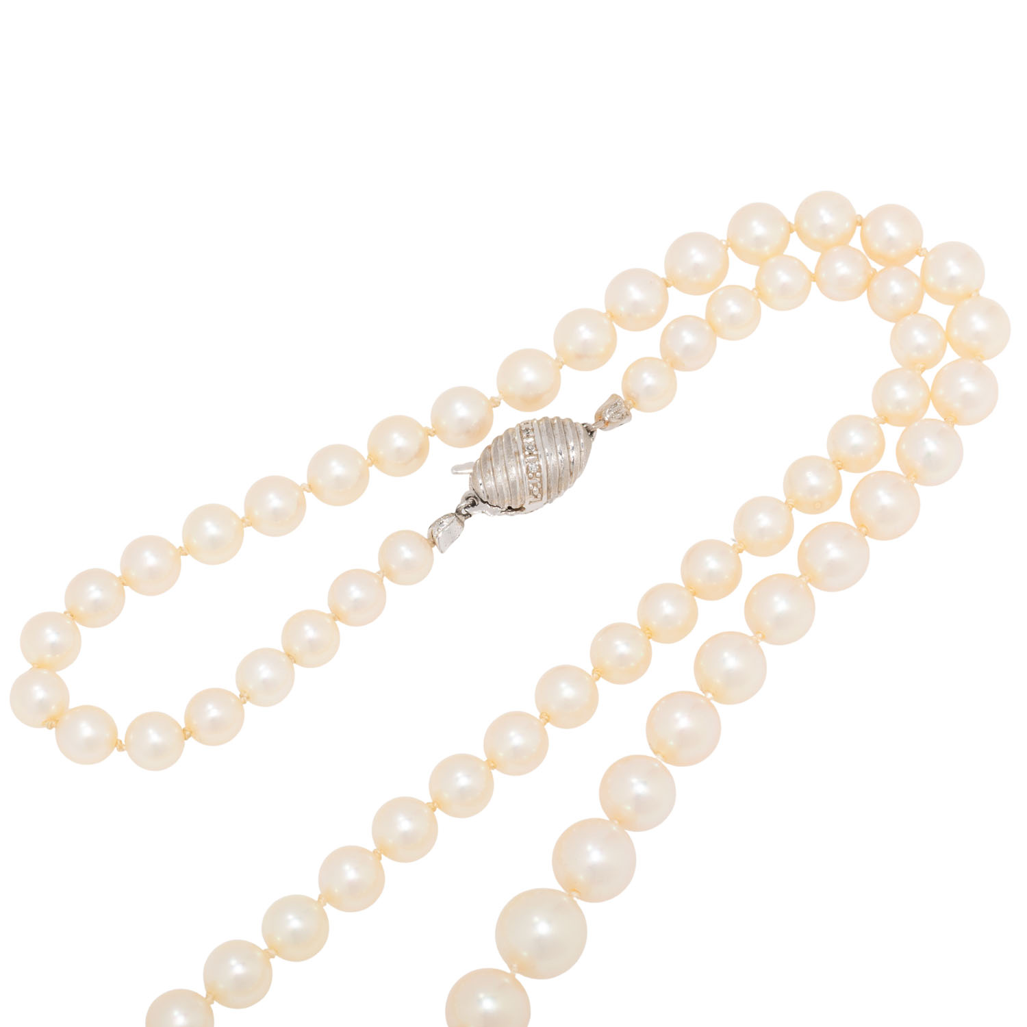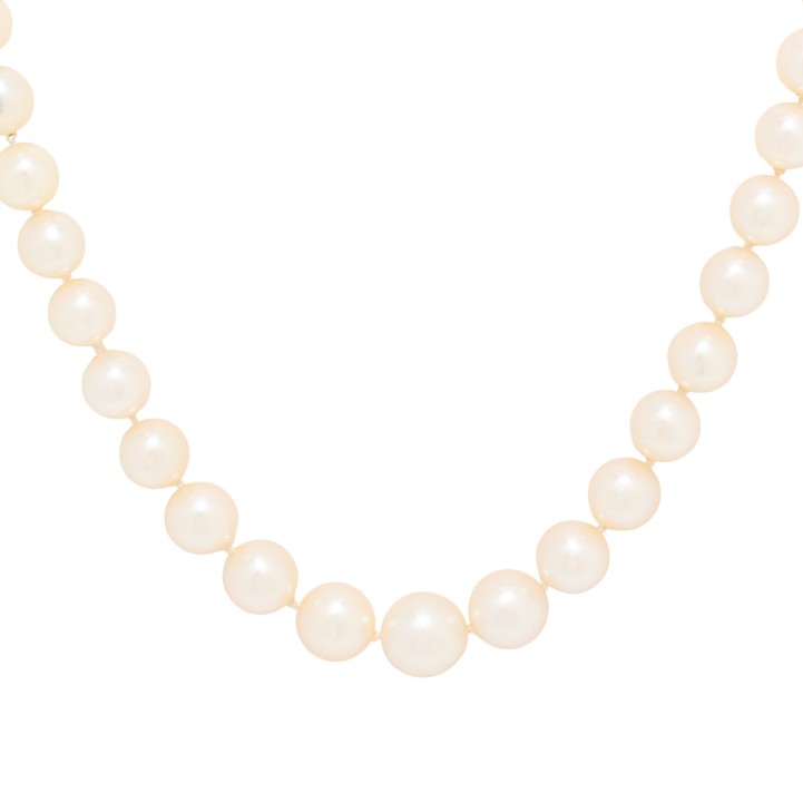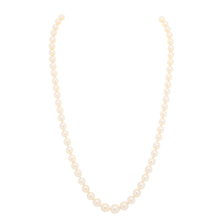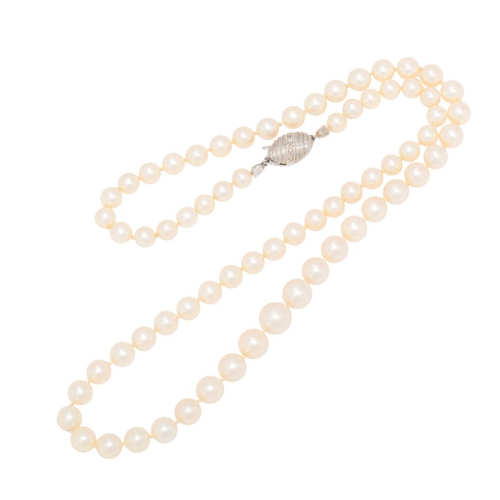 Necklace made of 69 akoya cultured pearls, shape: round, colour: white, dia.: 5.5 - 8.5 mm, WG 14K, 33.3 g, lenght: 54, 20th/21st century, slight signs of wear.