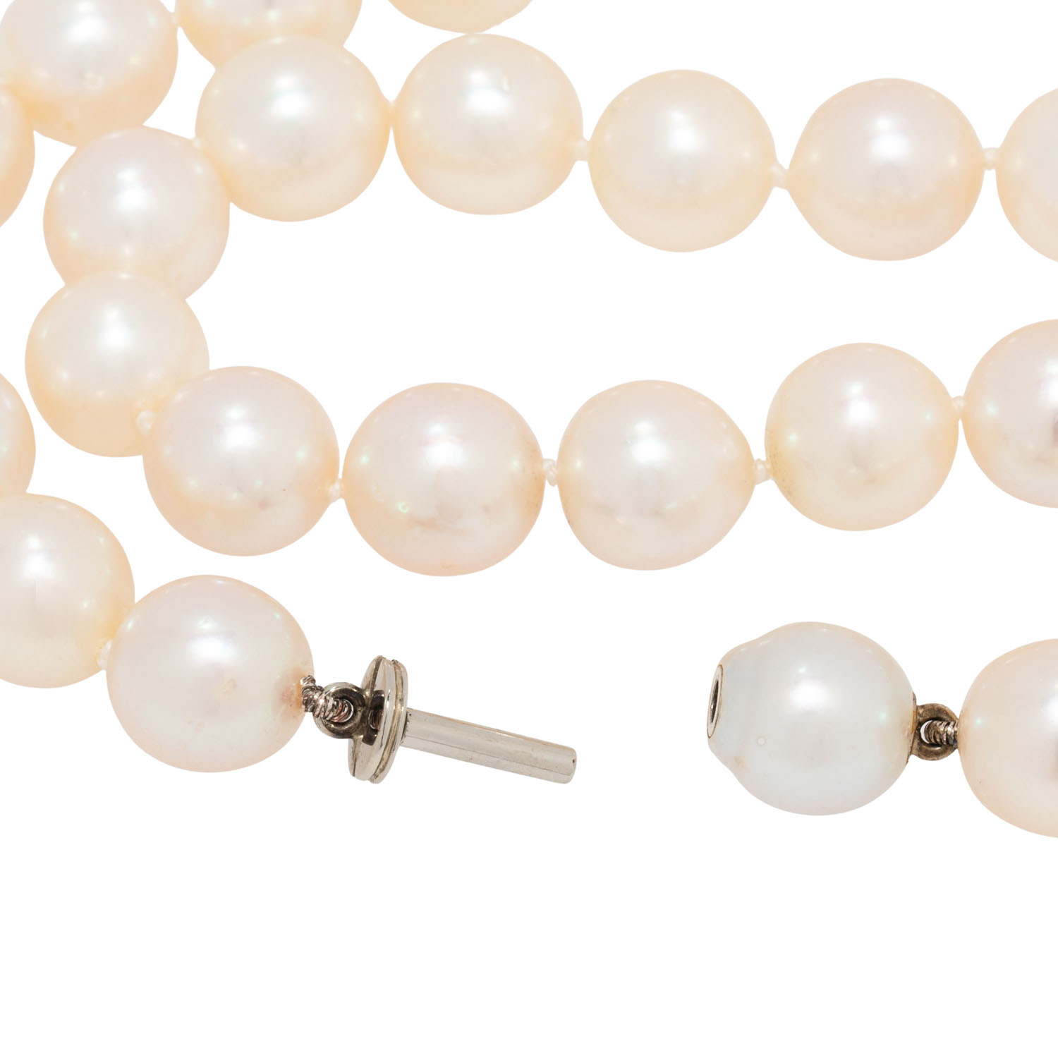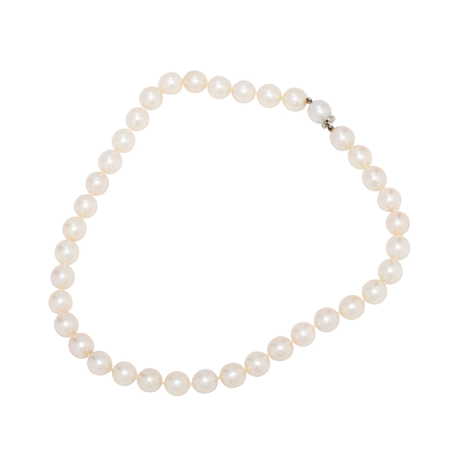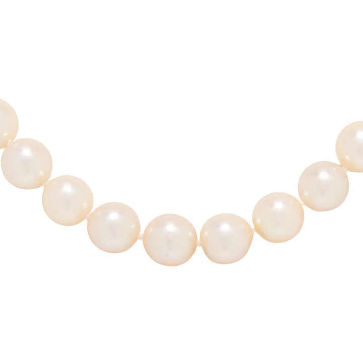 Necklace made of 37 southsea cultured pearls, shape: round to oval, colour: white, overtone: rosé/silver, dia.: 9.5 - 10 mm, clasp made of WG 18K, 59.6 g, lenght: 43 cm, 20th/21st century, slight signs of wear.