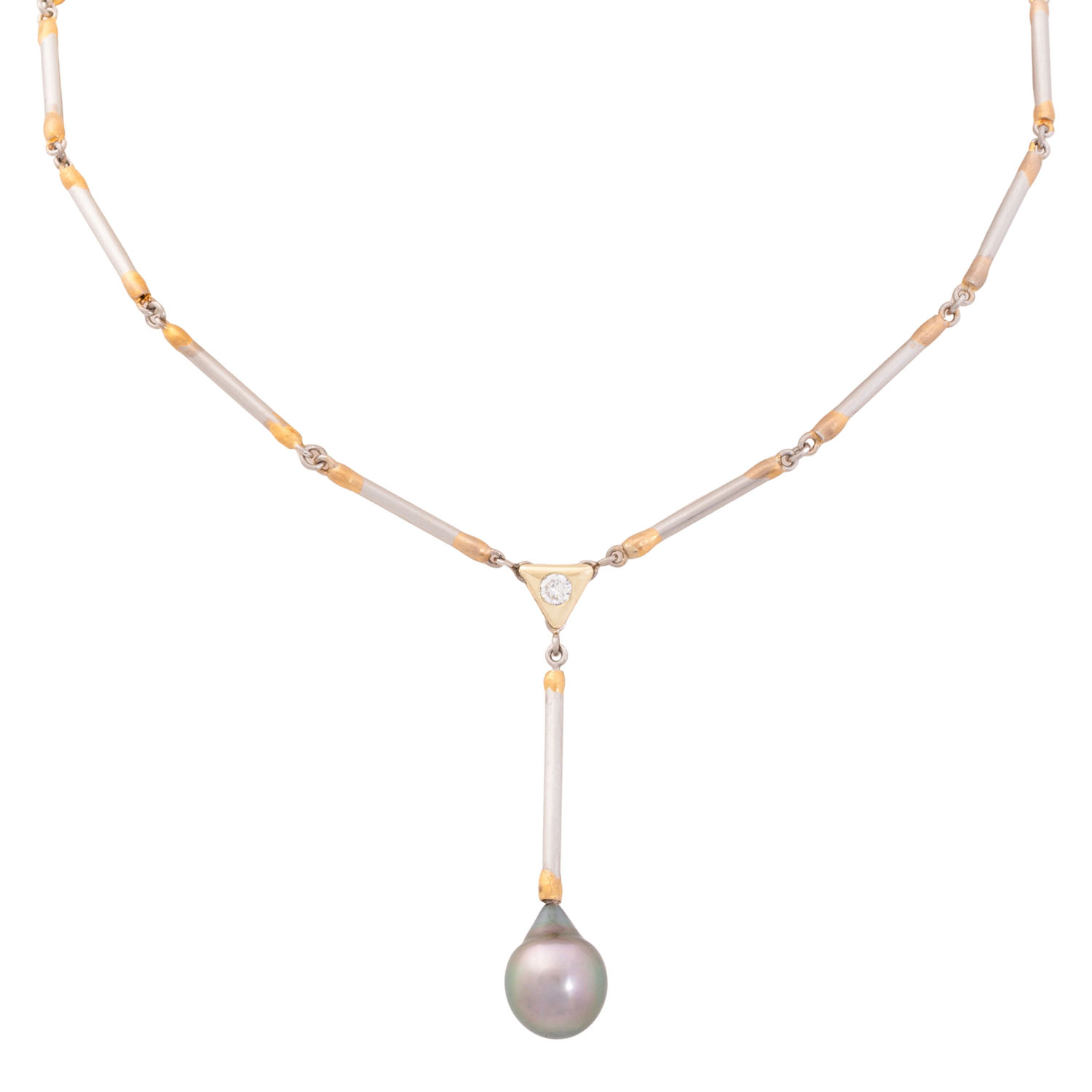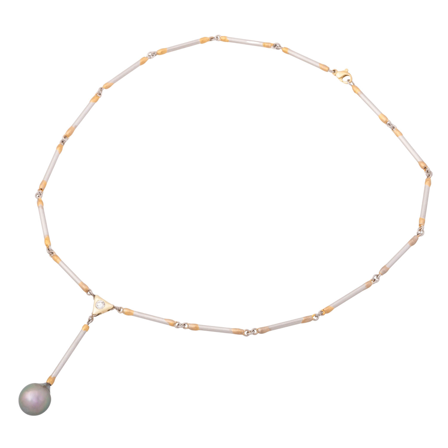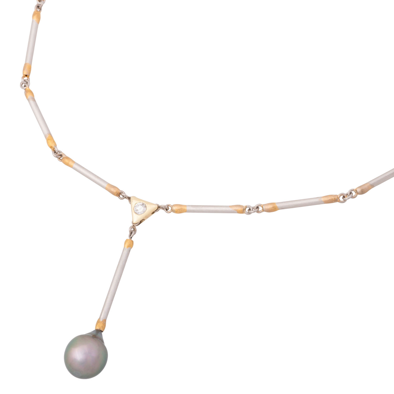 Necklace in chopsticksmotif with brilliant cut diamond, ap. 0.25 ct, STW (I-J)/VS, suspending pear-shaped cultured Tahiti pearl, ap. 14.6 x 10.8 mm, very good lustre, platinum 950 + 18K yellow gold, 18.7 g, L: 40 cm, carabiner clasp, late 20th century, minimal signs of wear.
