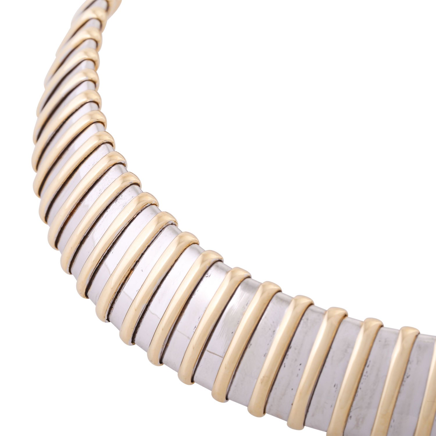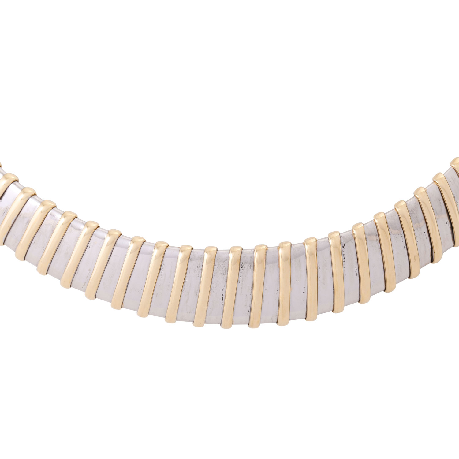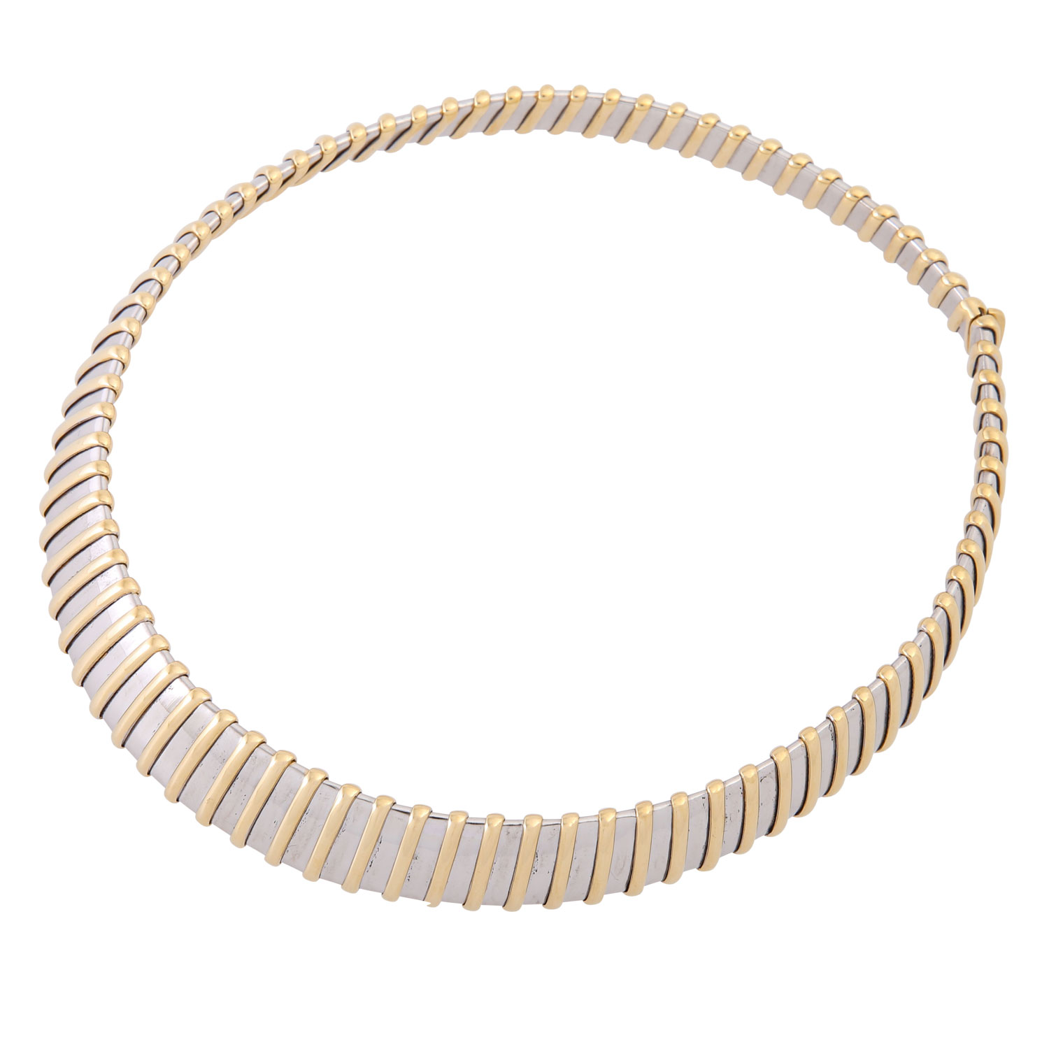 Necklace spiral winding yellow/white, 18K yellow and white gold, 103.3 g, L: 41 cm, W: according to course from 11 to 20 mm, box clasp with double catch, late 20th century, minimal signs of wear.