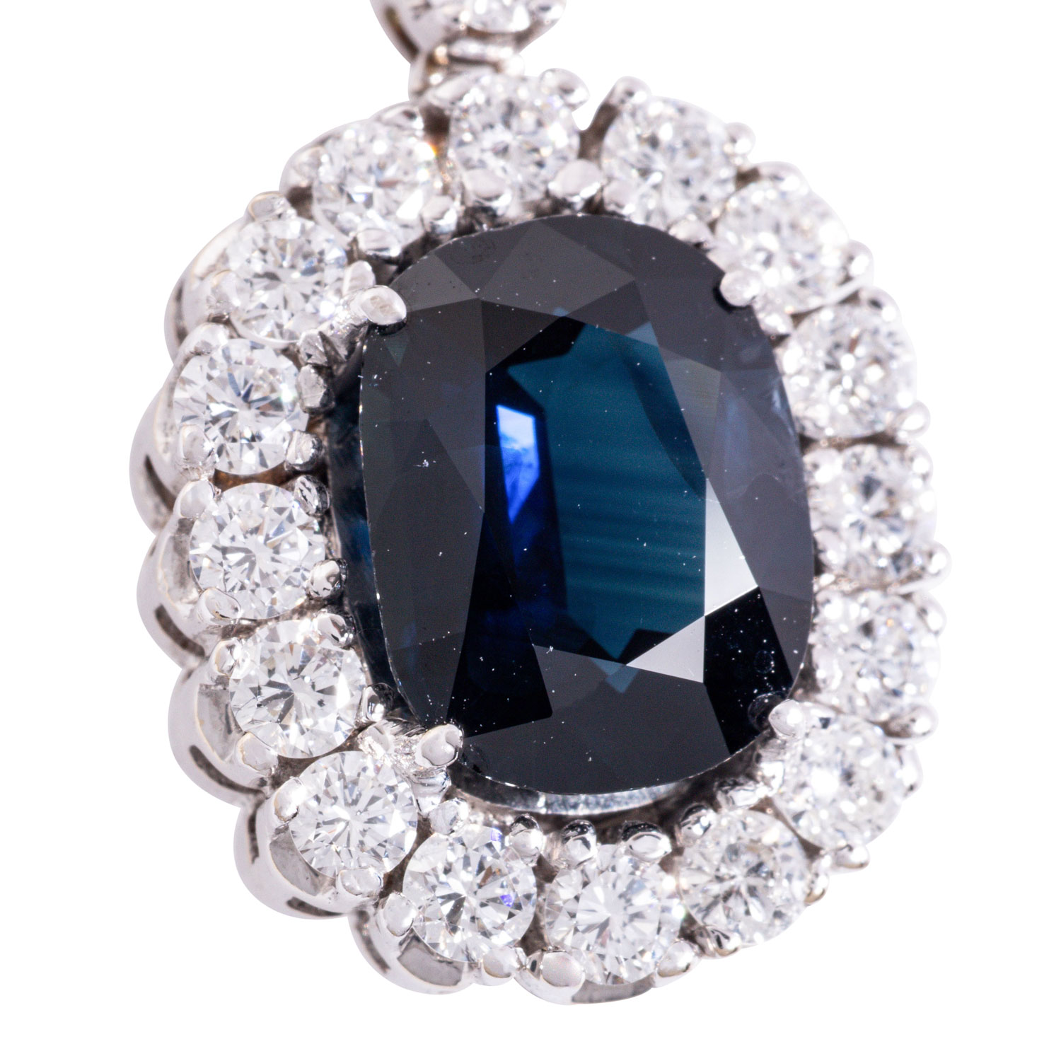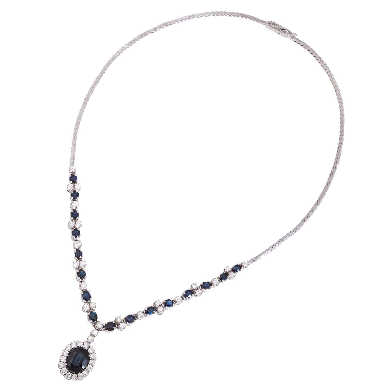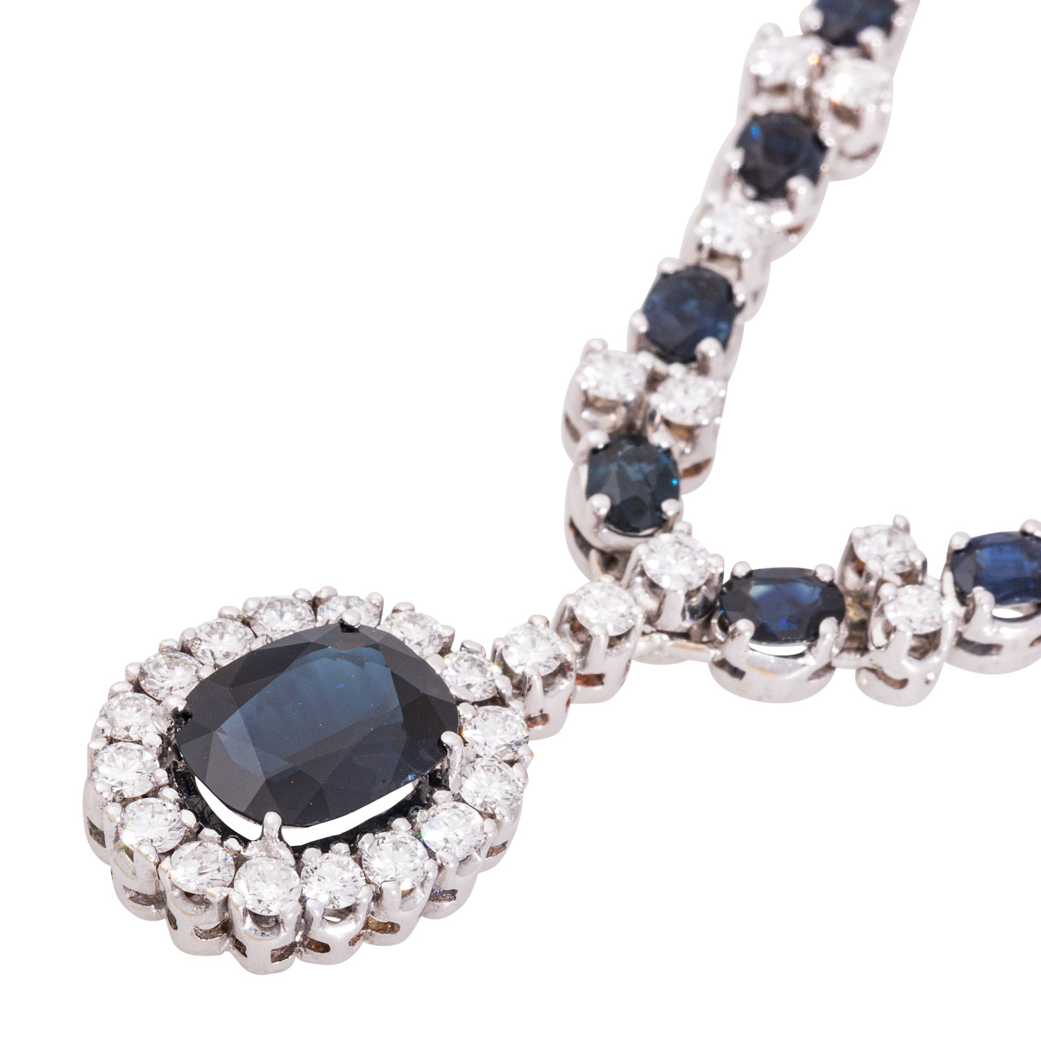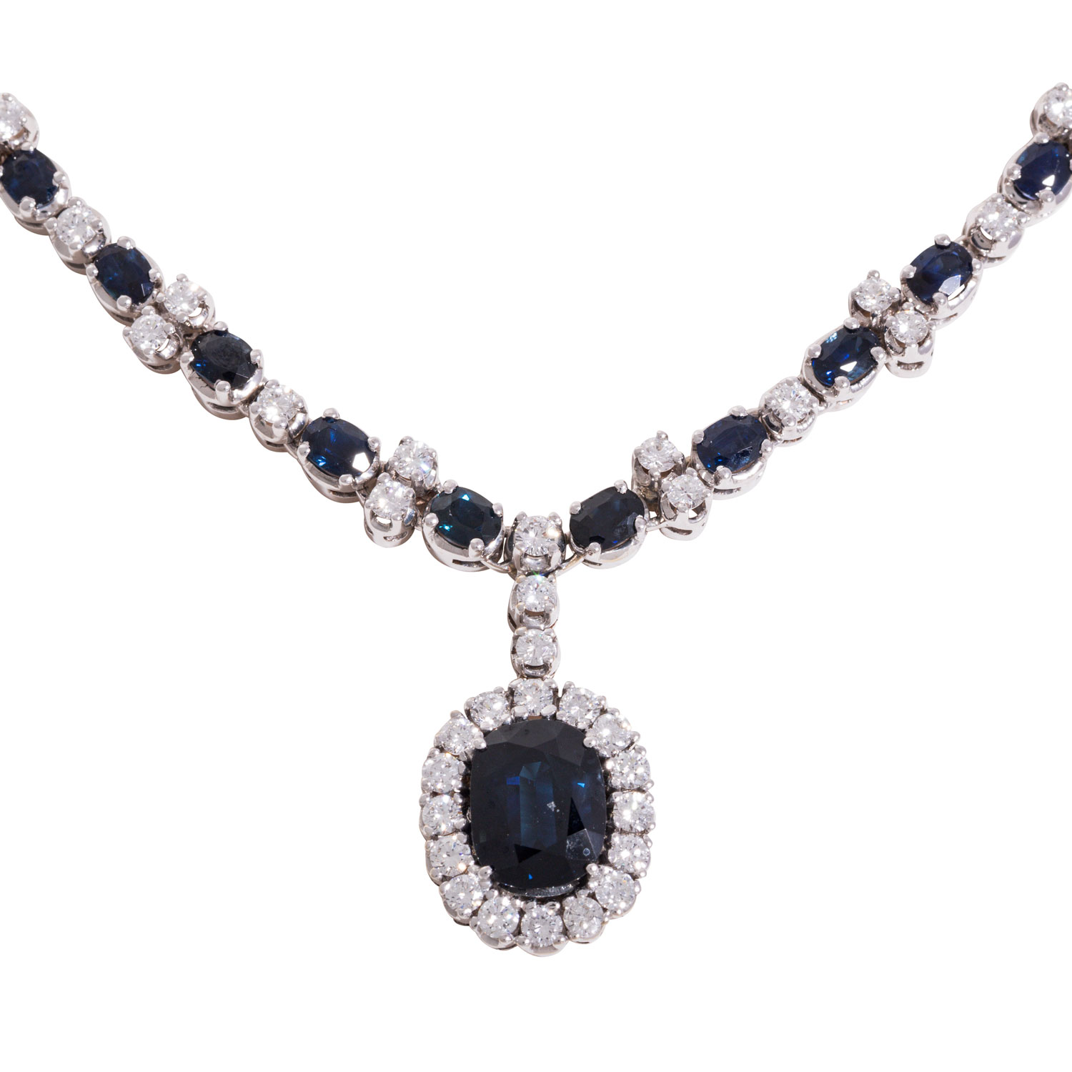 Necklace with 17 oval faceted sapphires, ap. 10 x 8 and 4.5 x 3.2 mm, 43 brilliant cut diamonds, totalling ap. 1.94 ct, good colour and clarity, 14K white gold, 24.3 g, L: 41 cm, box clasp with safety catch, 2nd half of 20th century, minimal signs of wear.