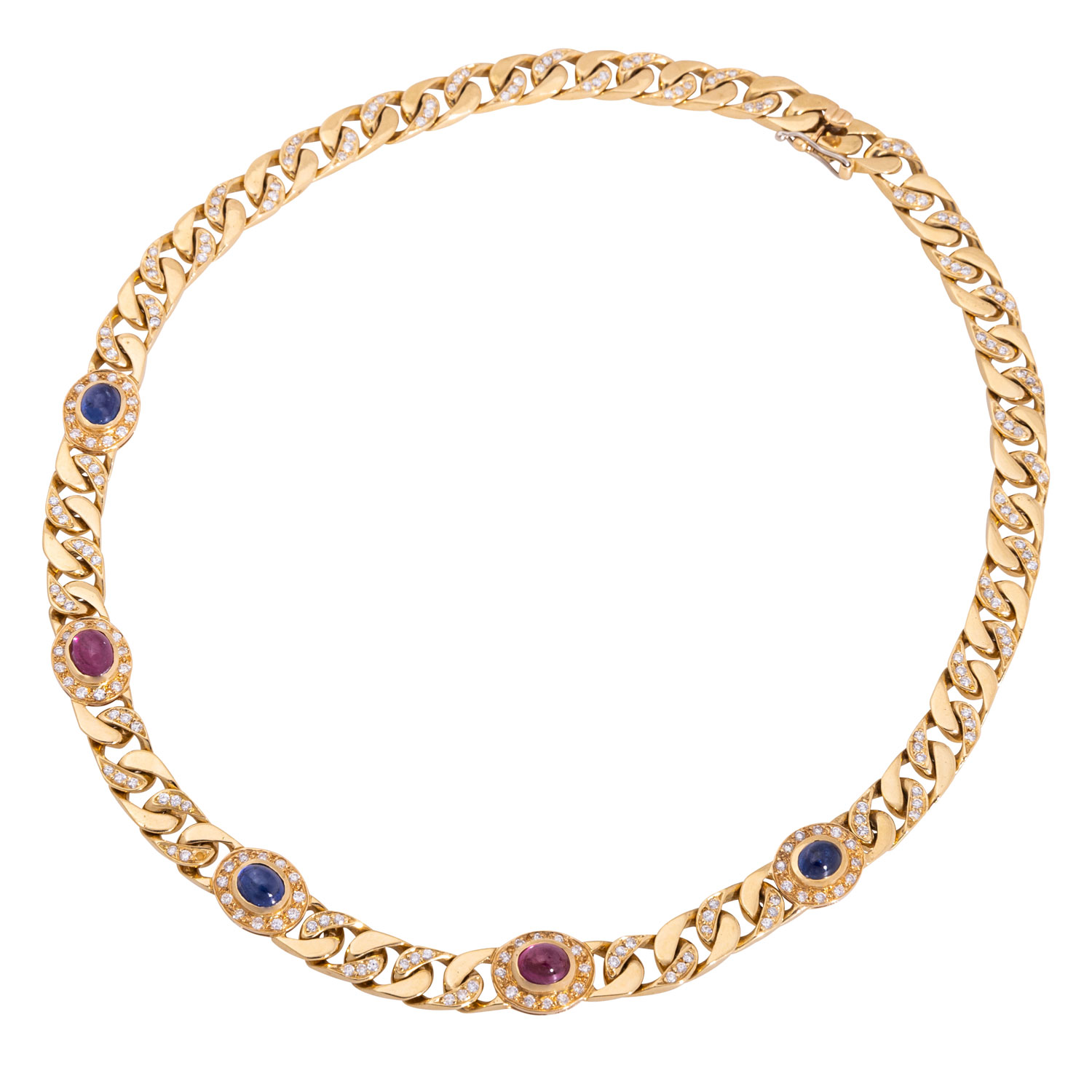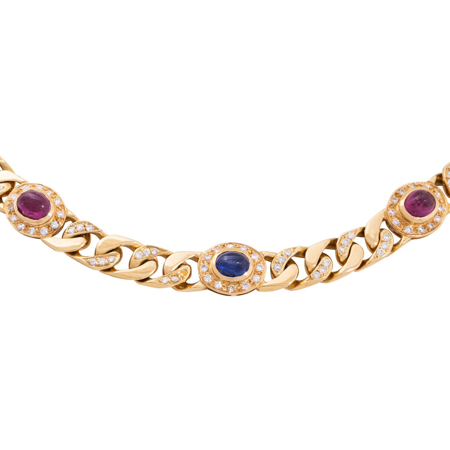 Collier with 3 sapphire and 2 ruby cabochons, oval, ap. 7 x 5 mm, 125 brilliant cut diamonds, totalling ap. 1.25 ct, 18K yellow and white gold, 60,9 g, L: 41 cm, W: 10 mm, box clasp, 1 security catch, late 20th century, minor signs of wear, 1 diamond vacancy.