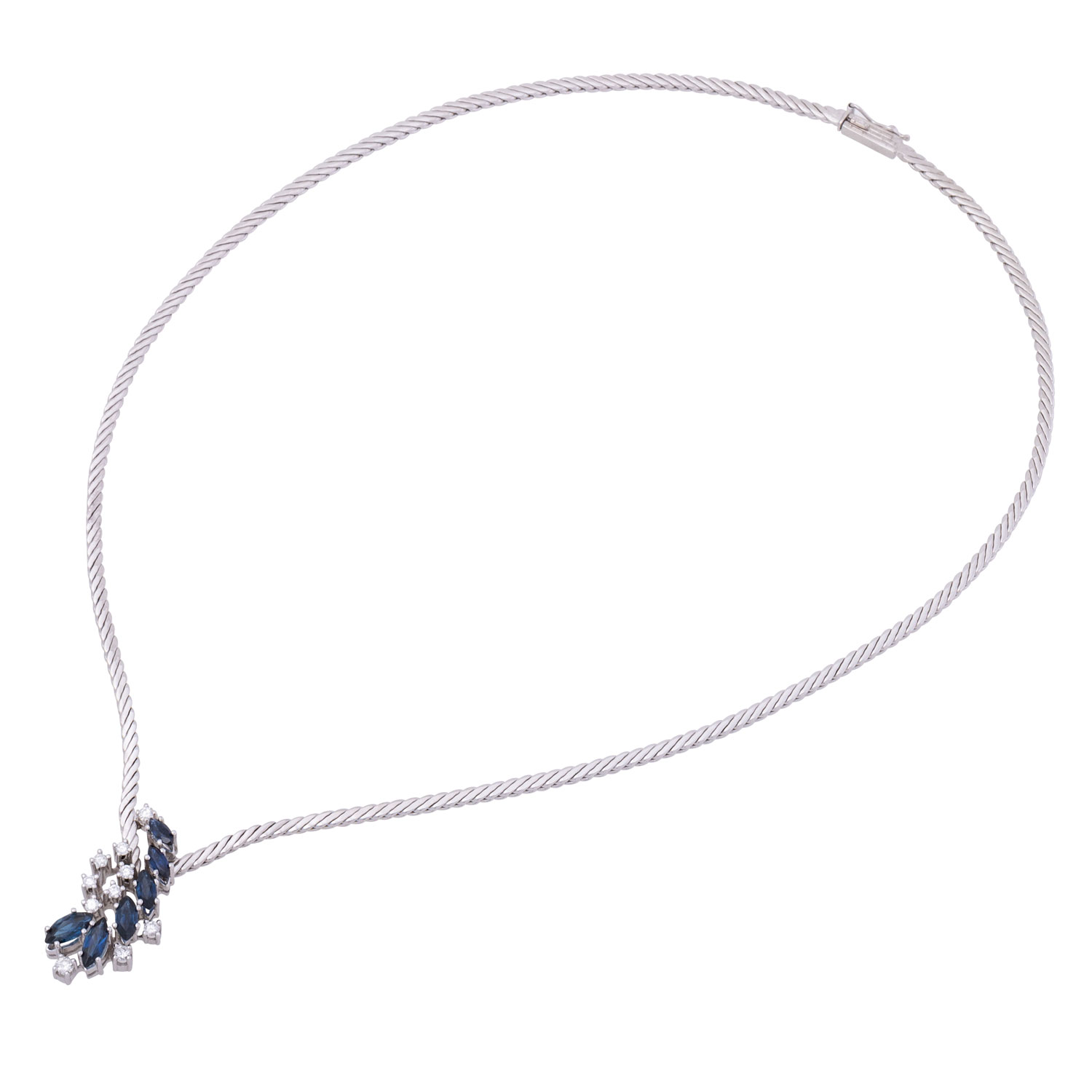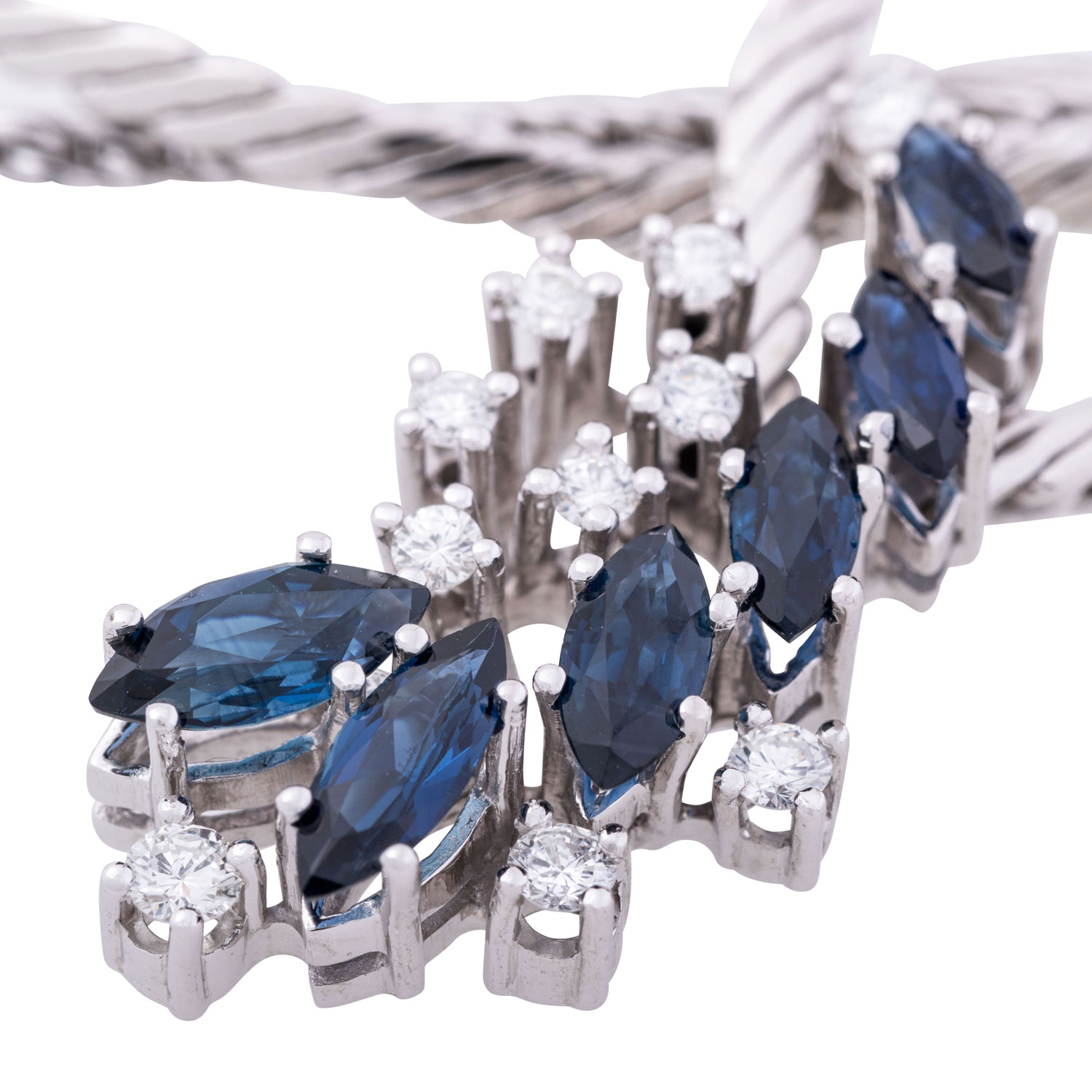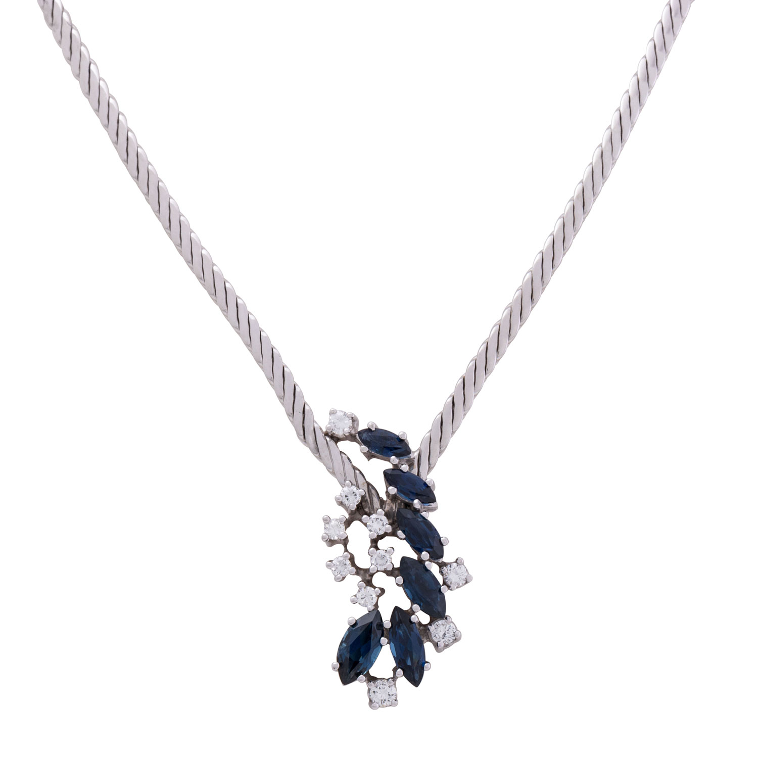 Necklace with 6 faceted sapphires and 10 brilliant-cut diamonds, totalling 0.37 ct (engraved), good colour and clarity, sapphires totalling 1.97 ct (engraved), navetten cut, 14K white gold, 21.8 g, L: ca. 41.5 cm, W: ca. 2.3 mm, pendant ca. 28.9 x 13.8 mm, 2nd half of the 20th century, minimal signs of wear, with hallmark 'BS'.