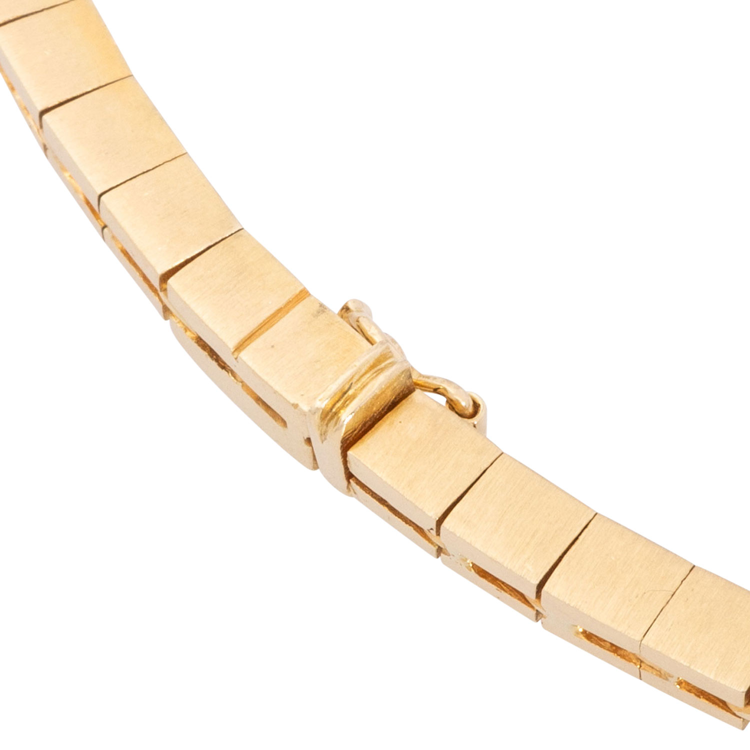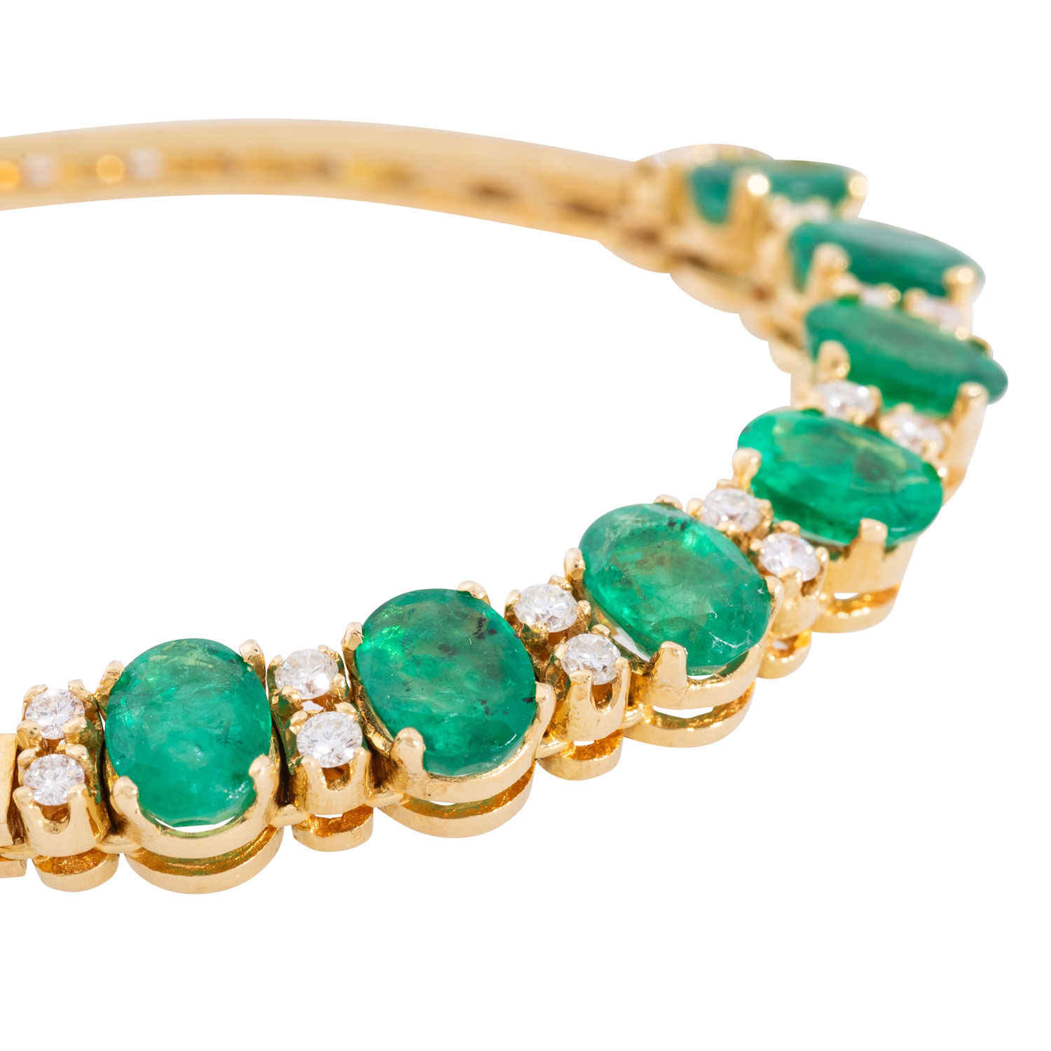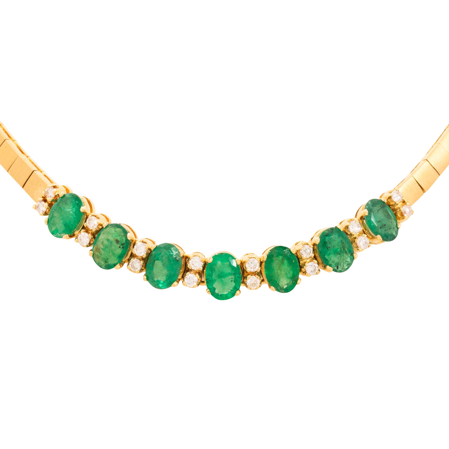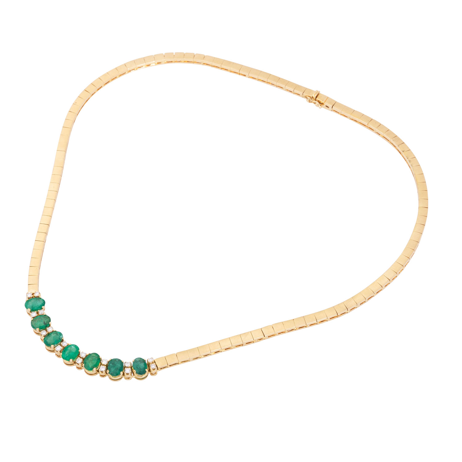 Necklace with 7 oval faceted emeralds, ap. 7 x 5 mm, 16 brilliant cut diamonds, ap. 0.5 ct, good colour and clarity, 18K yellow and white gold, 44.2 g, L: 43.5 cm, W (necklace): 3.5 mm, box clasp, safety catch, 1993, minimal signs of wear, handcrafted, accessories: manufacturer certificate.