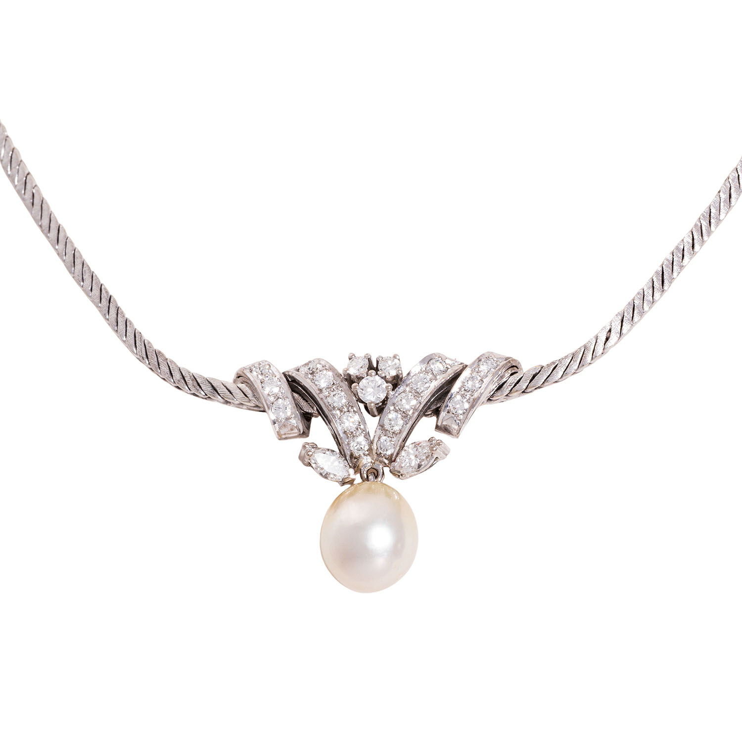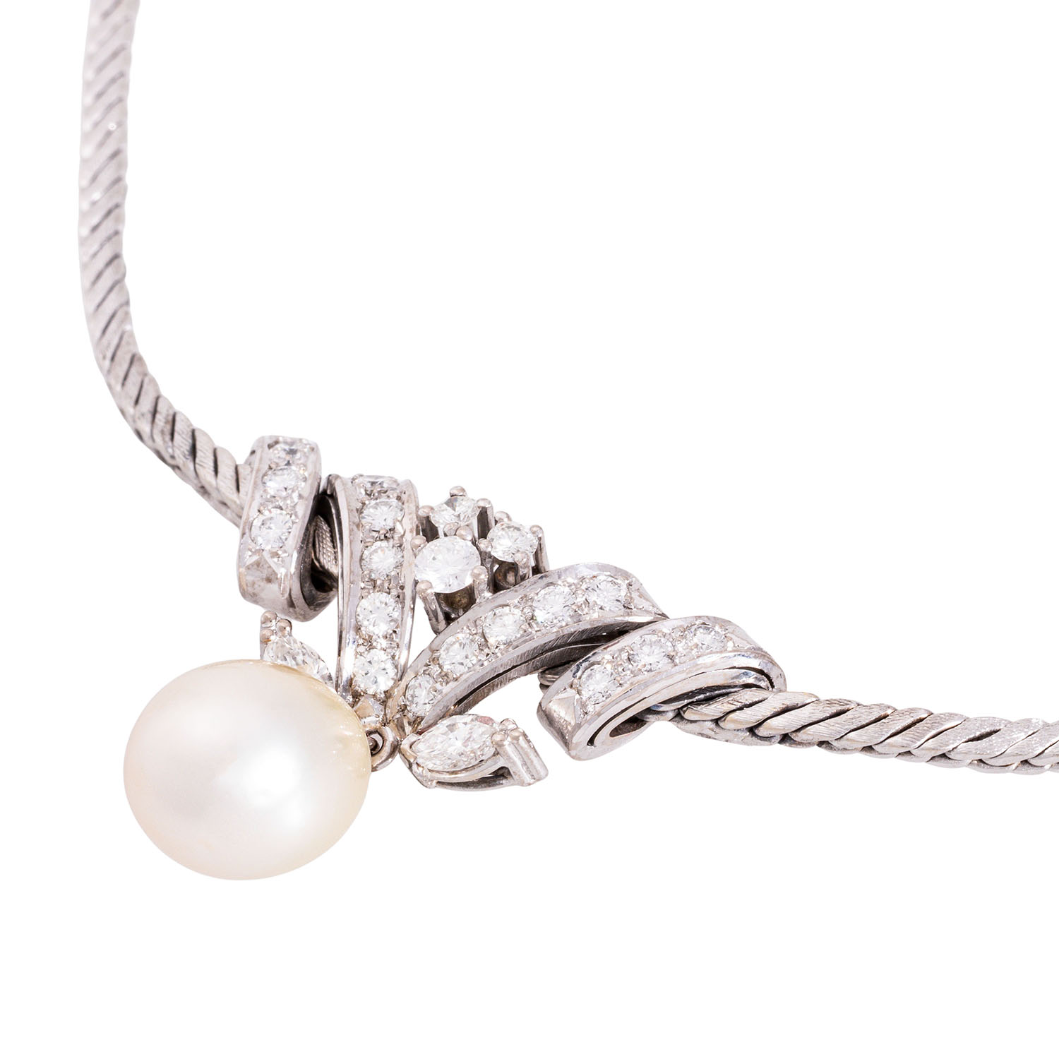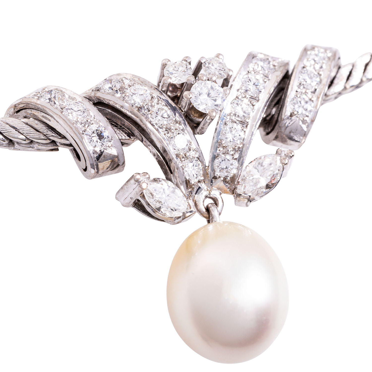 Necklace with 2 navette-cut and many brilliant-cut diamonds totalling ca. 1.2 ct, ca. WHITE (H)/SI and 1 cultured pearl 10x12 mm, 18K white gold, 30.6 g, L: 46 cm, 2nd half of 20th century, signs of wear, unknown maker's mark.