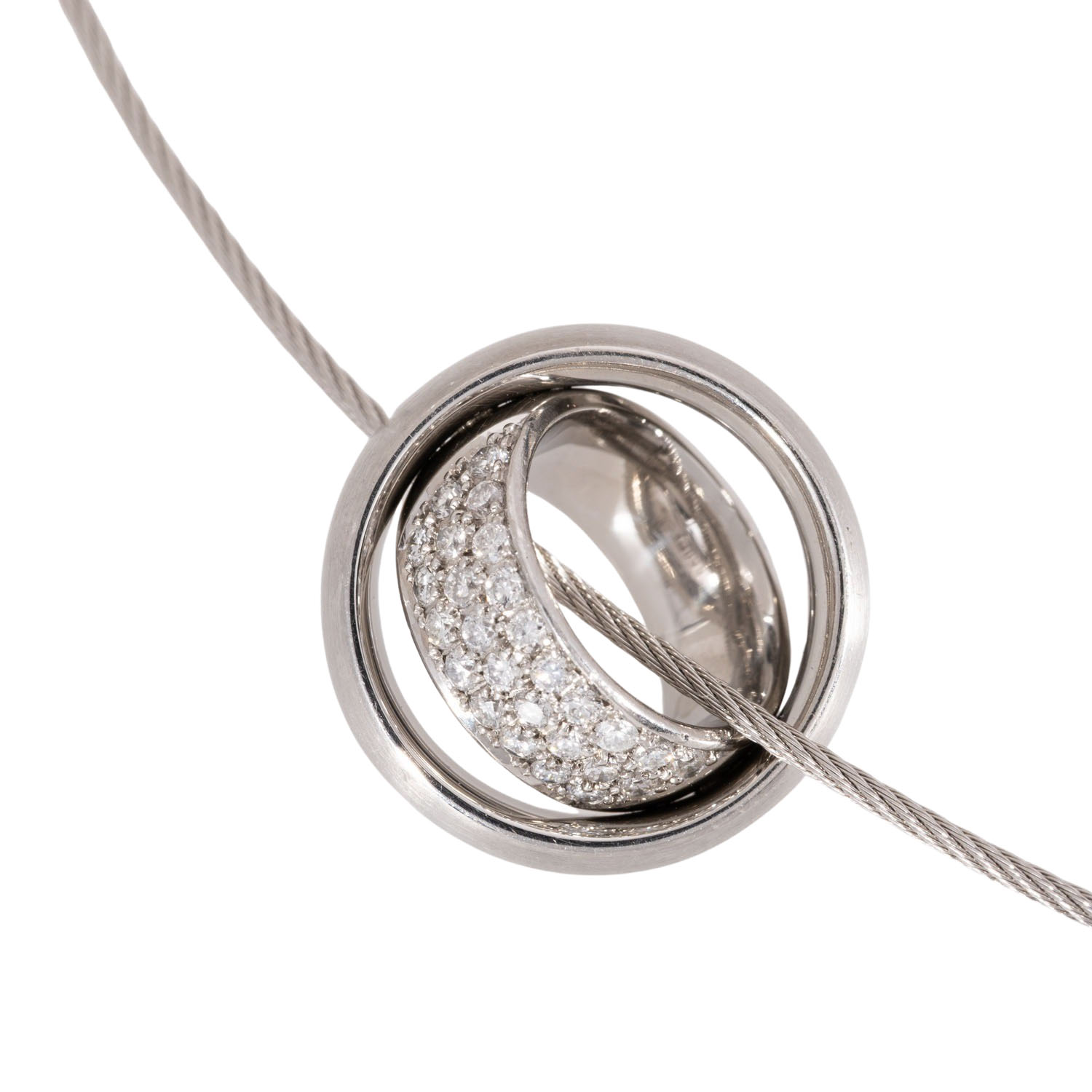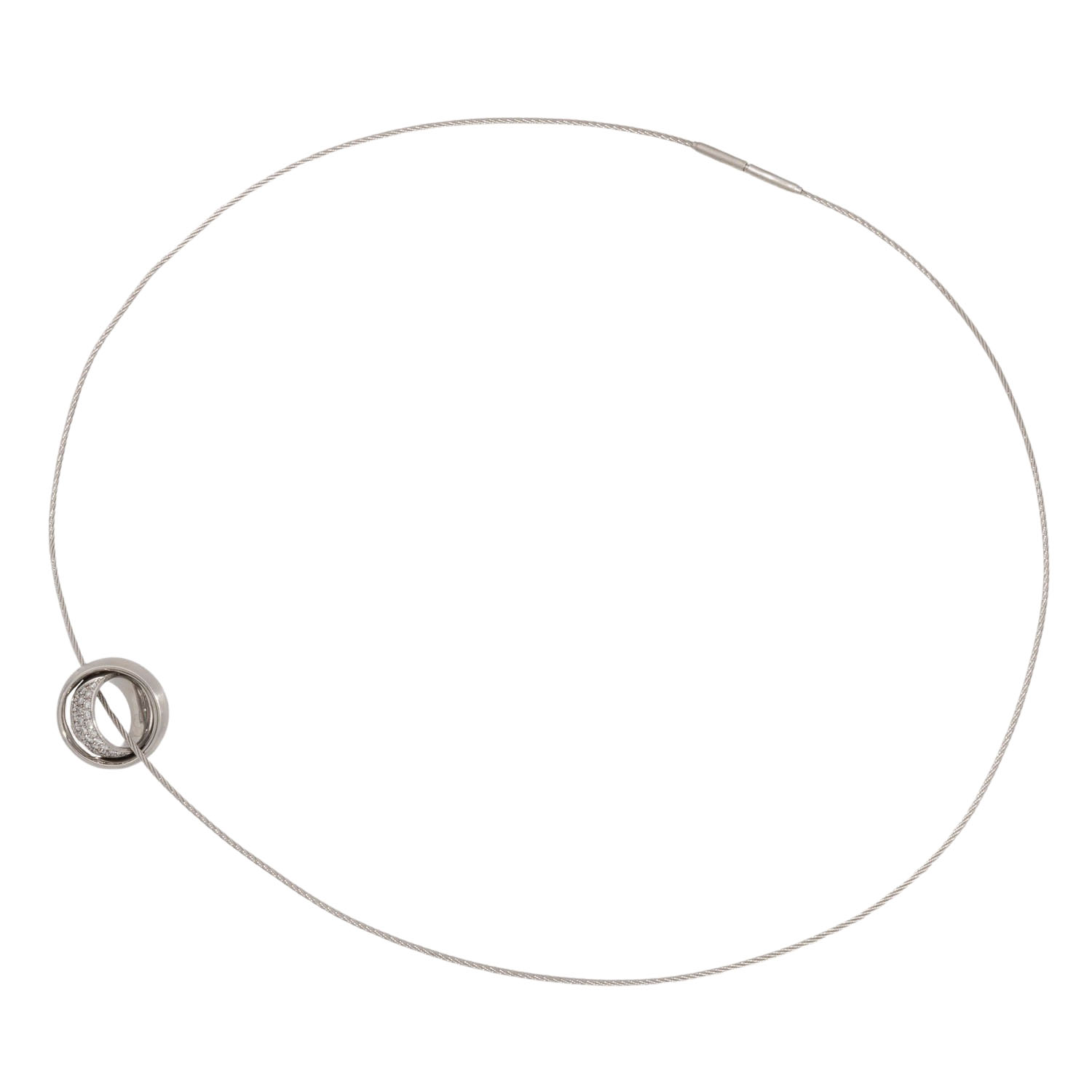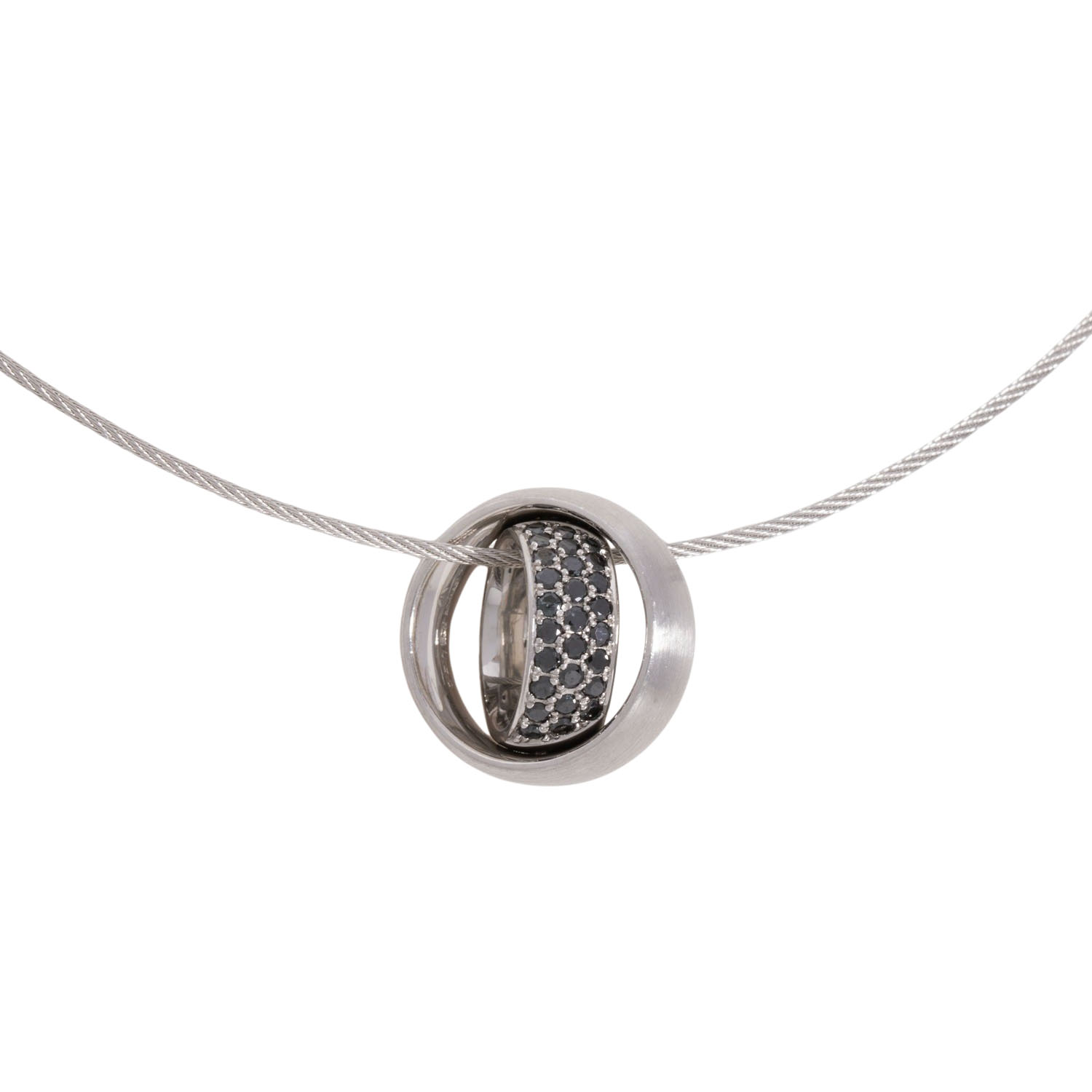 Necklace with black and colourless brilliant-cut diamonds totalling ca. 0.27 ct, colourless of good color and clarity, with necklace of platinum cord, L: 43.5 cm, pendant D: 1.5 cm, handcrafted in 2002, necklace with signs of wear, pendant in good condition, marked 'SCHWAB', including sales receipt 3,260 € and case.
