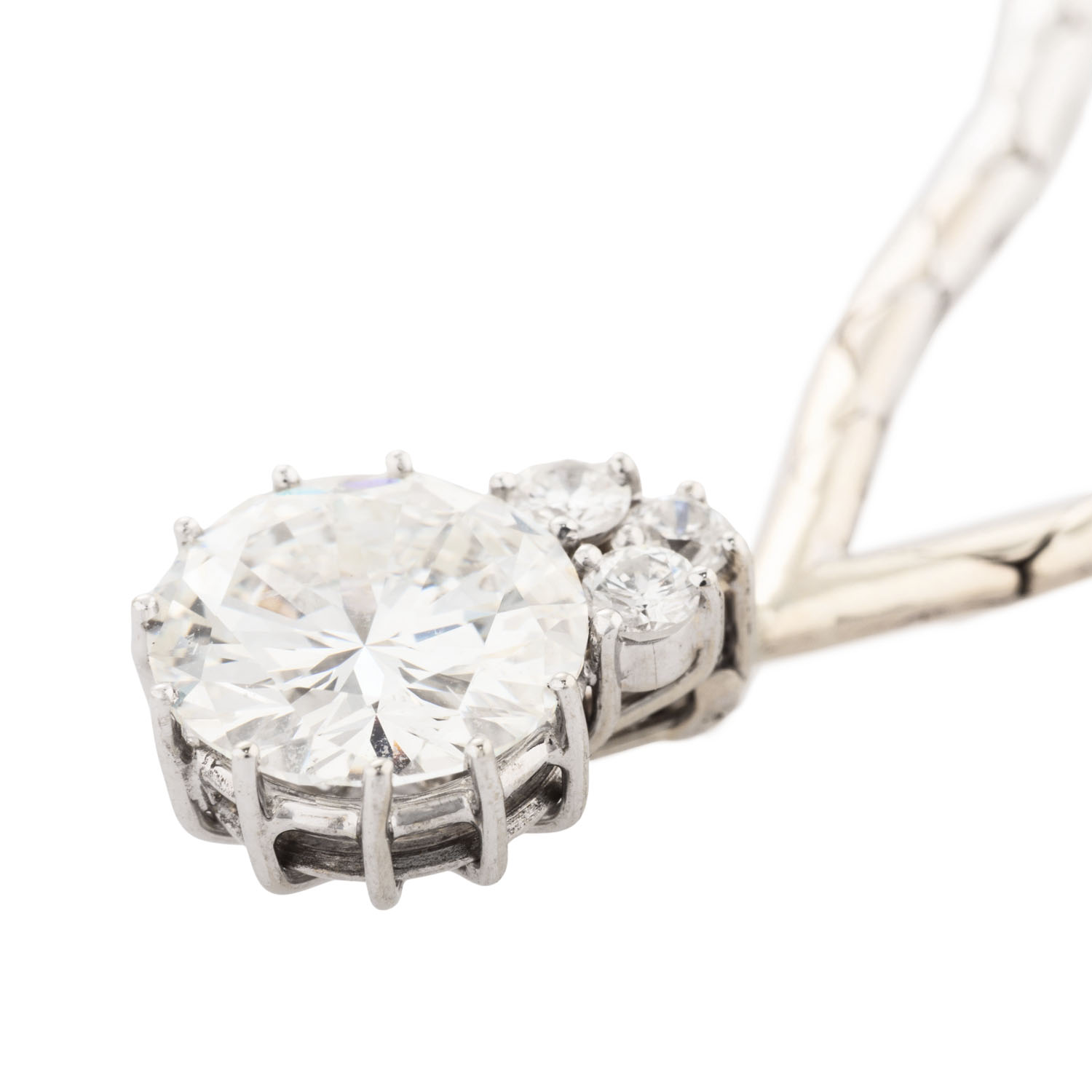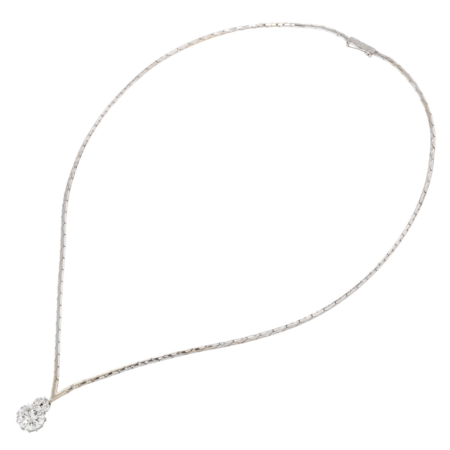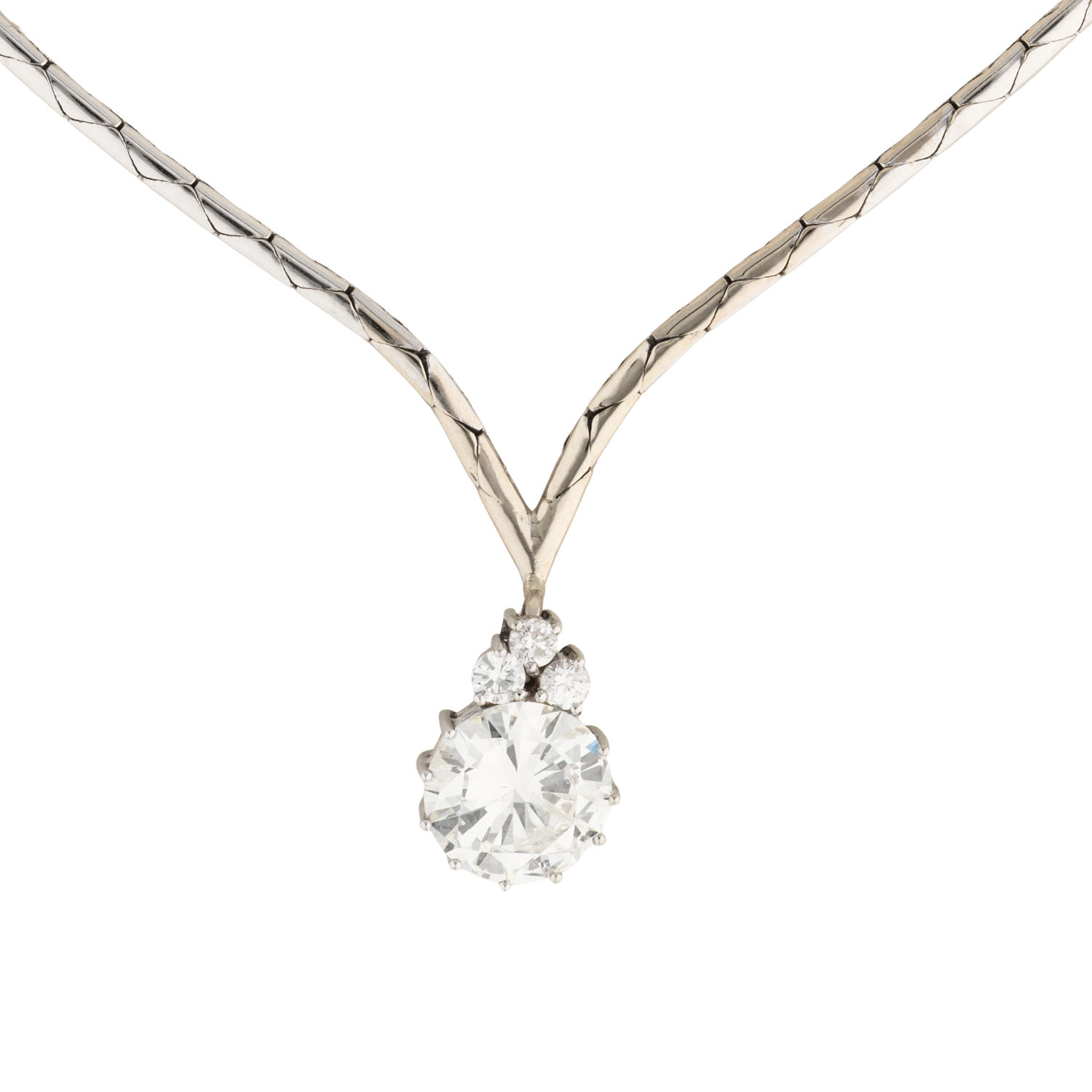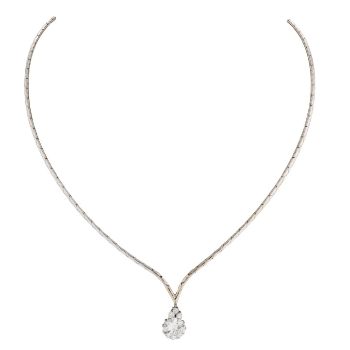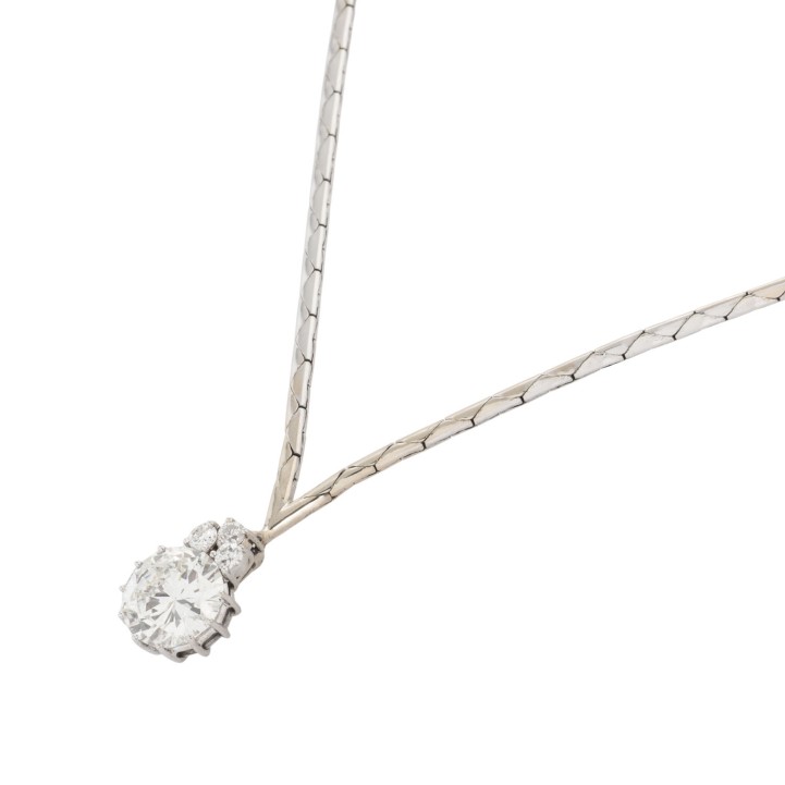 Necklace with brilliant-cut diamond ca. 2.2 ct, ca. STW (J)/I1, crowned by 3 small brilliant-cut diamonds, pendant of 18K, necklace of 14K white gold, 12.1 g, L: 42 cm, 2nd half of 20th century, minor signs of wear.