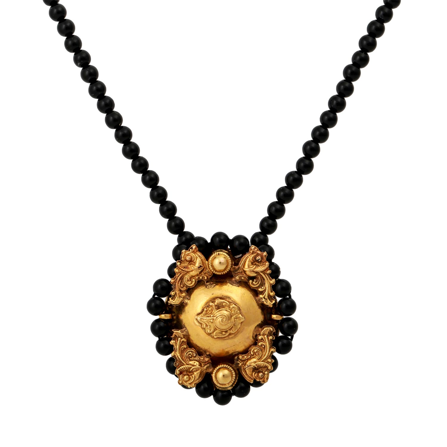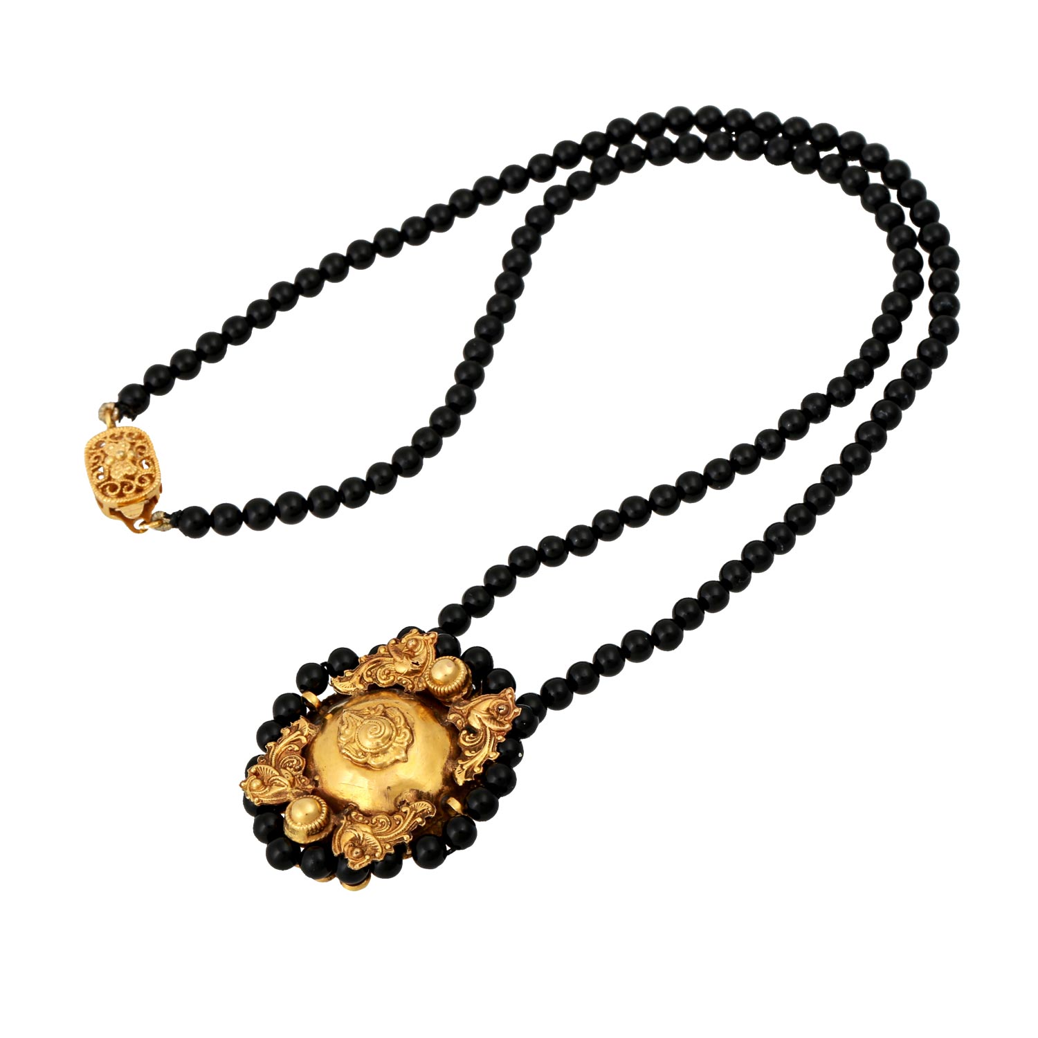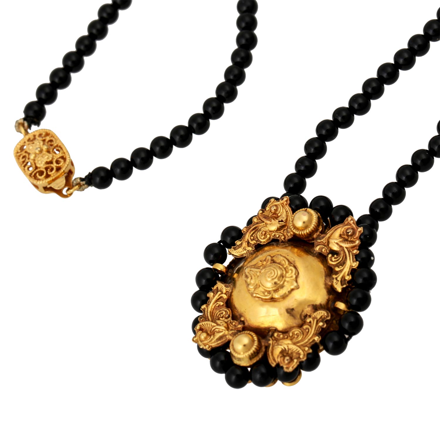 Necklace with mid section made of 18K yellow gold, prob. antique clasp, reworked with onyx beads, ca. 3.5 mm, L. ca. 48 mm, clasp metal gilded, 19th/20th century, distinct damages.