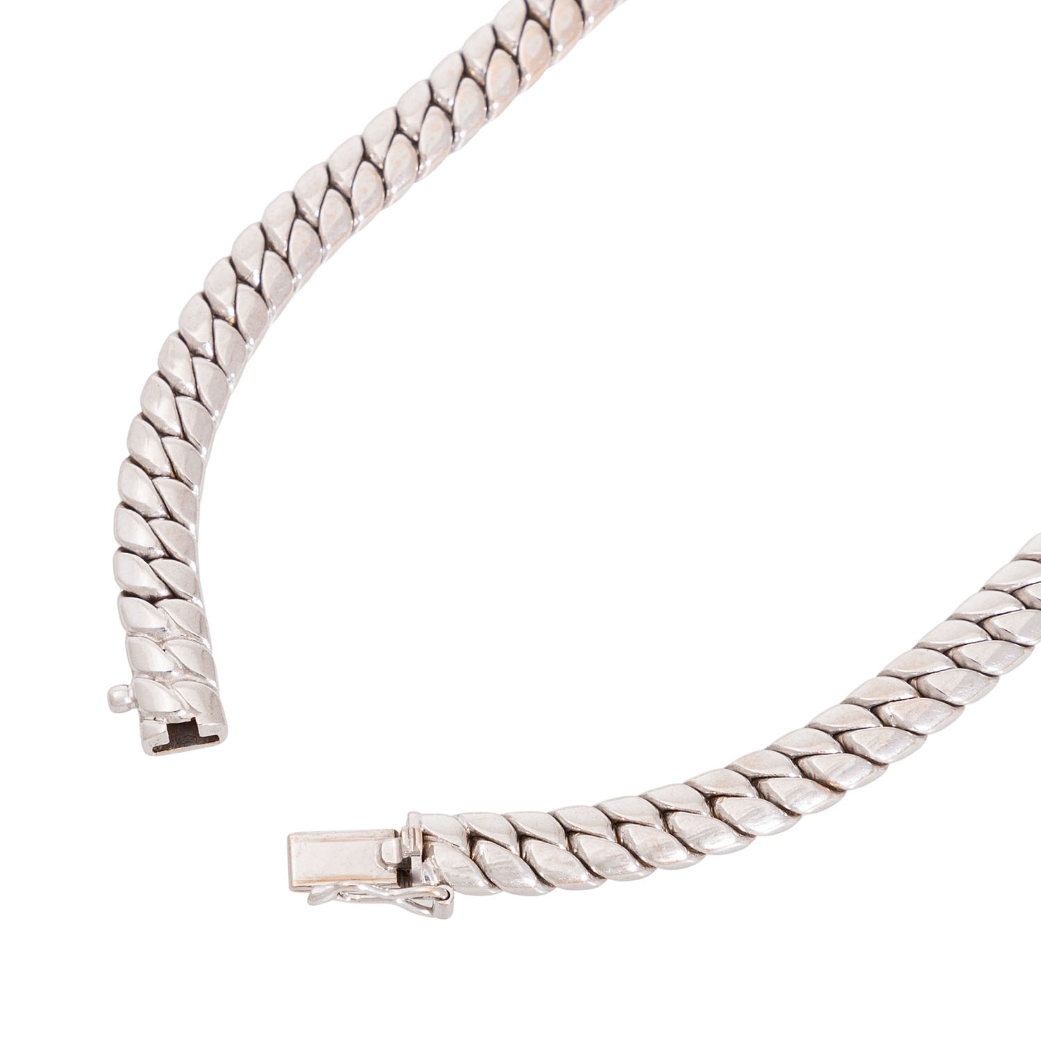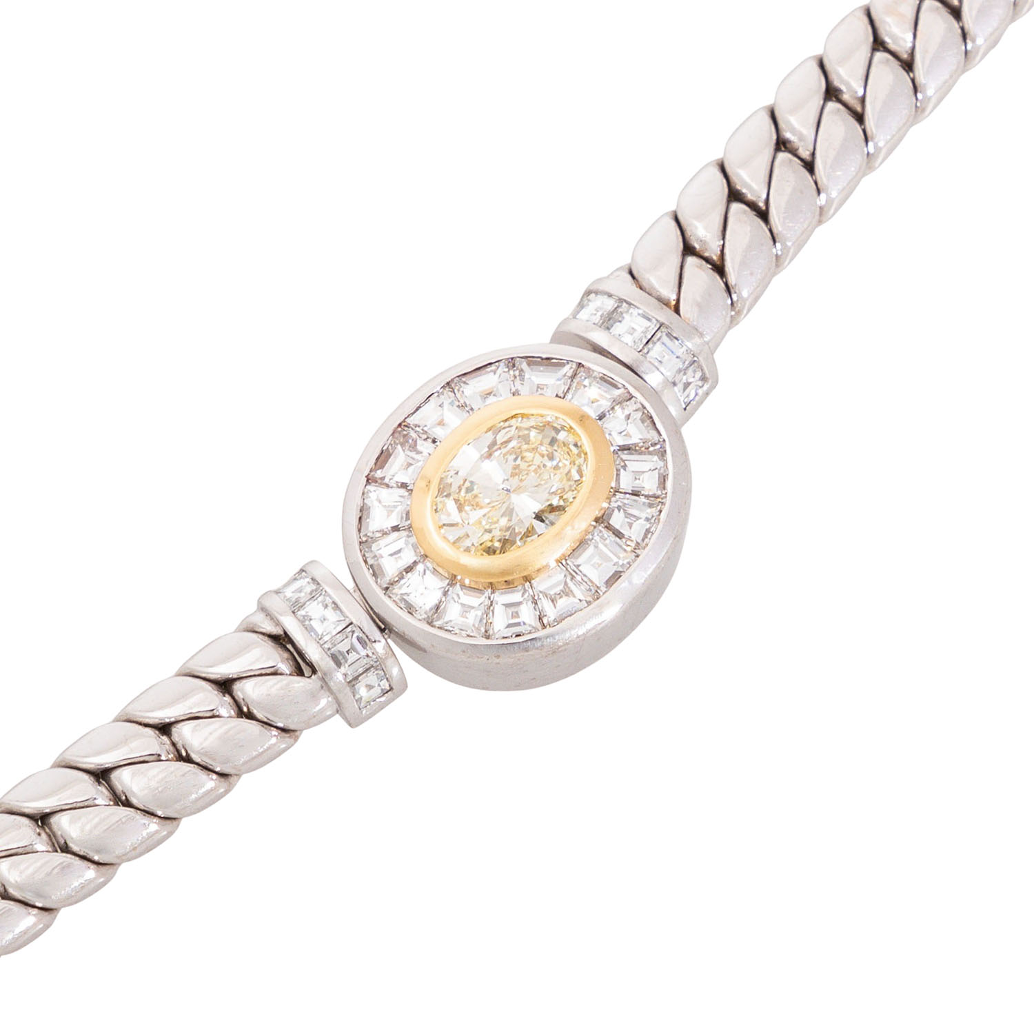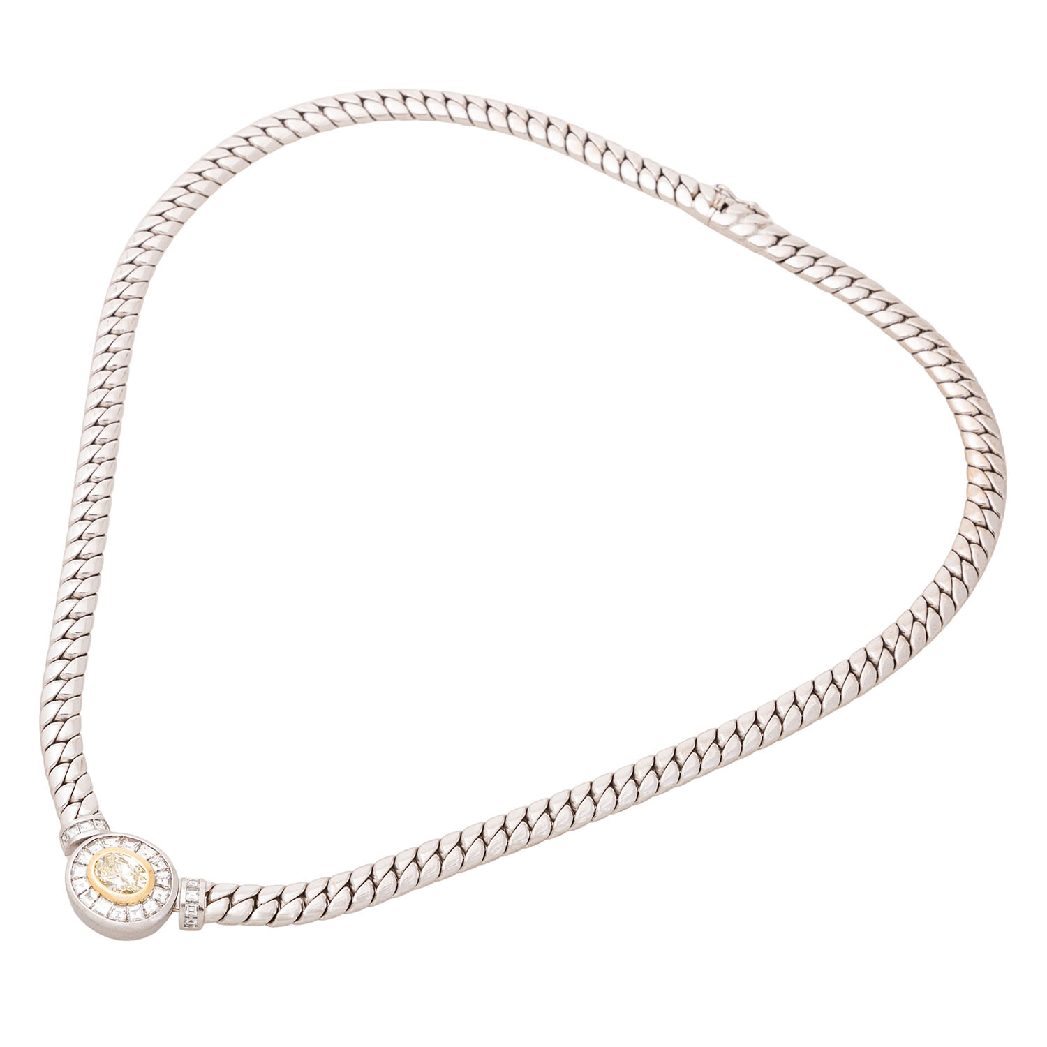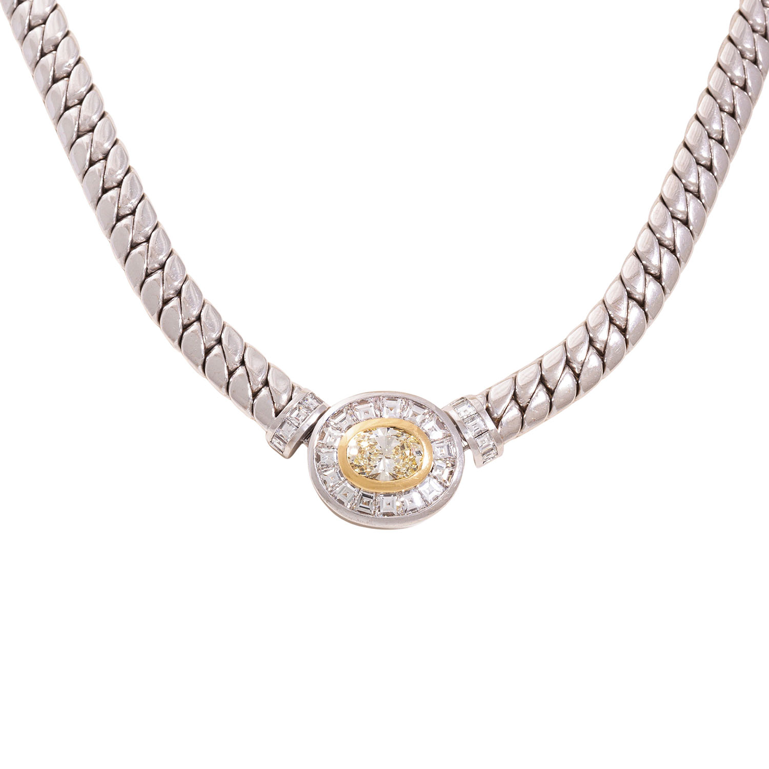 Necklace with centrally positioned oval facetted light yellow diamond, 1.0 ct (cert.), SI, surrounded by 15 trapezoid and 10 caré cut diamonds, totalling ap. 0.9 ct (cert.). W-LGH (H-J)/SI, 18K white and yellow gold, 55.1 g, L: 45 cm, curb link chain W: 6 mm, box clasp with safety catch, 21st century, minimal signs of wear, accessories: cetrtificate of sale.