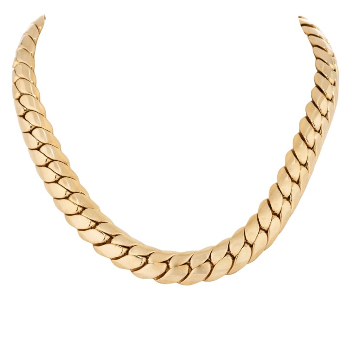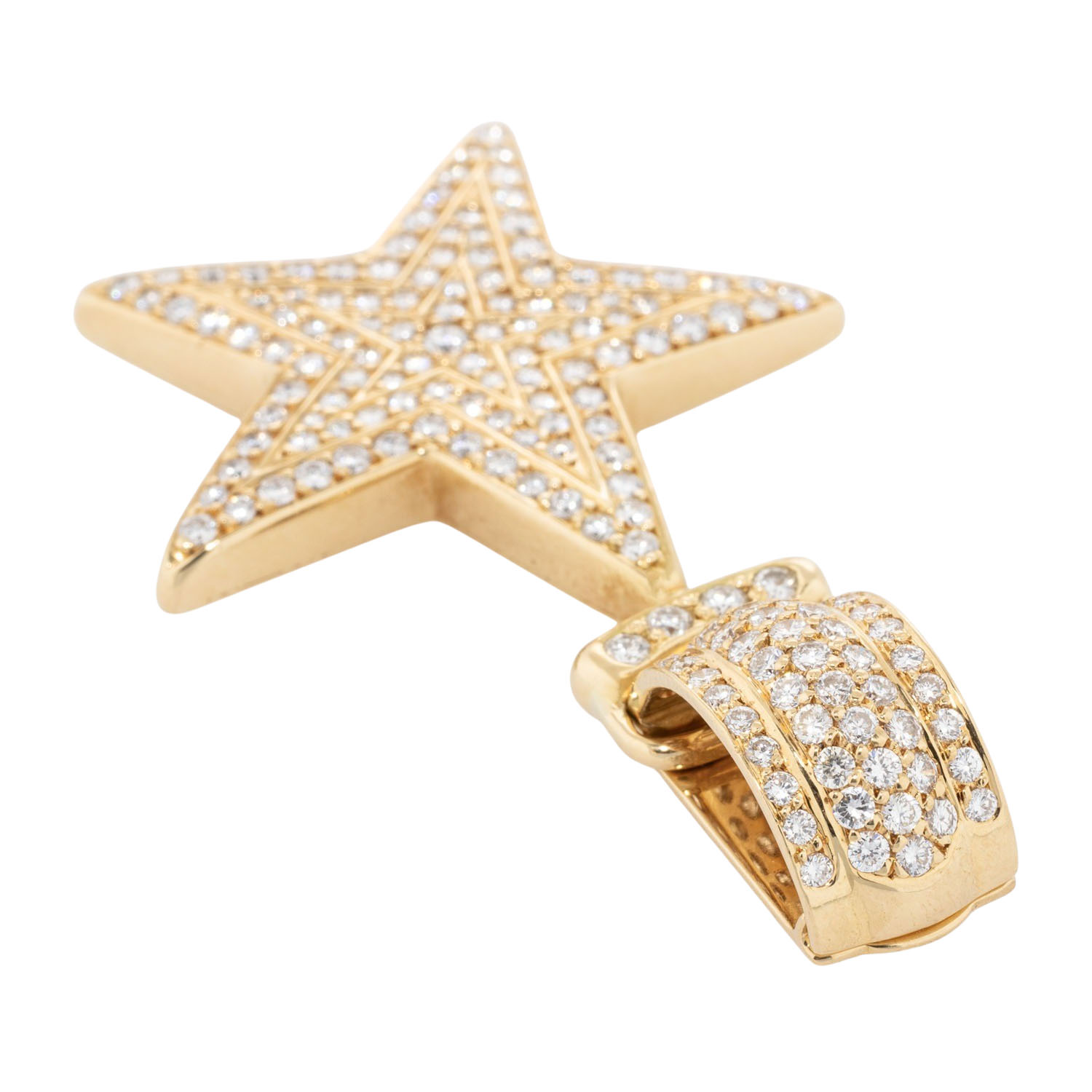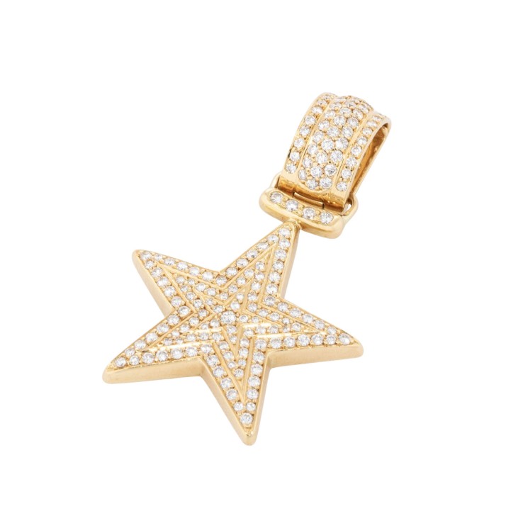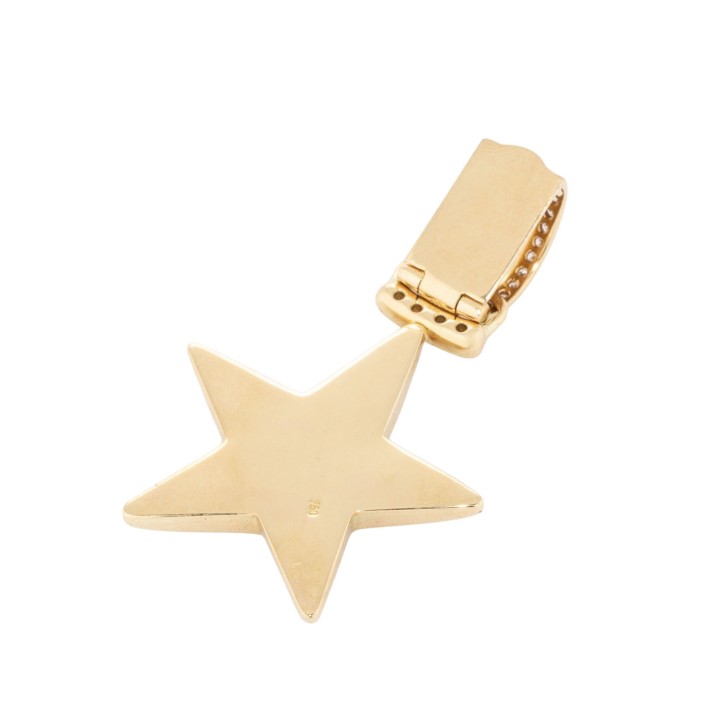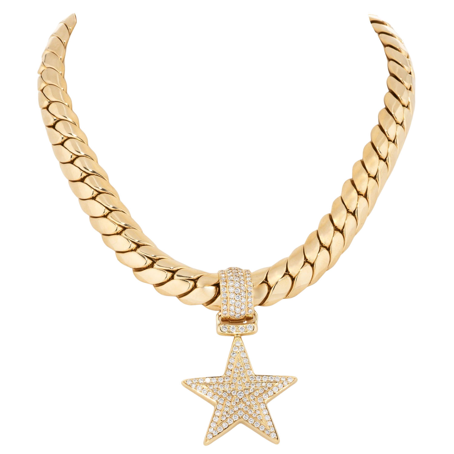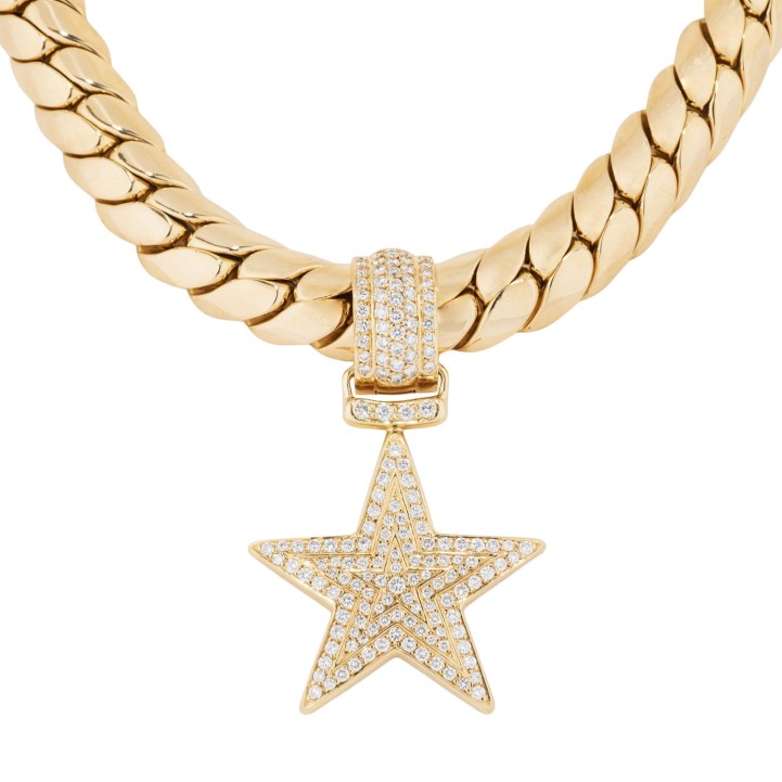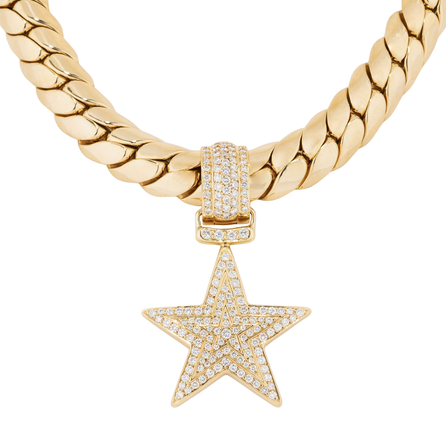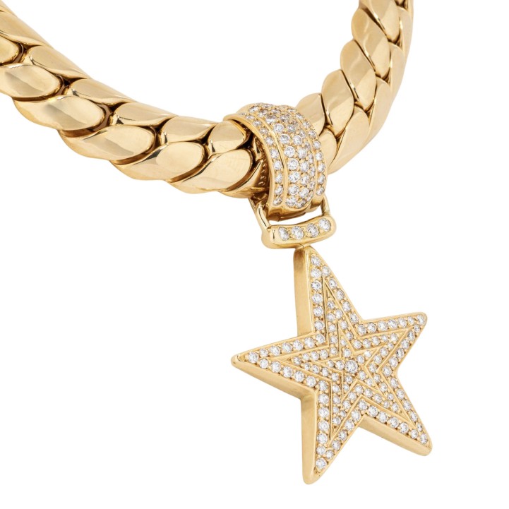 Necklace with clip-pendant 'Brilliant-Star' set with ca. 2.8 ct, good colour and clarity, 18K yellow gold, 101.1 g, L: 39.5 cm, W: 1.2 cm, pendant 5.5x3.5 cm, late 20th century, good condition.