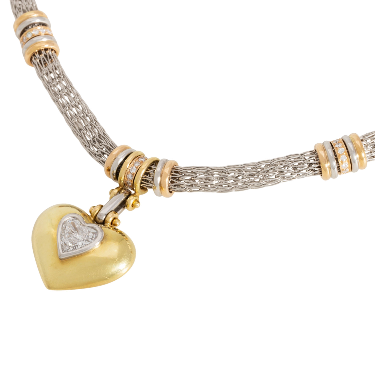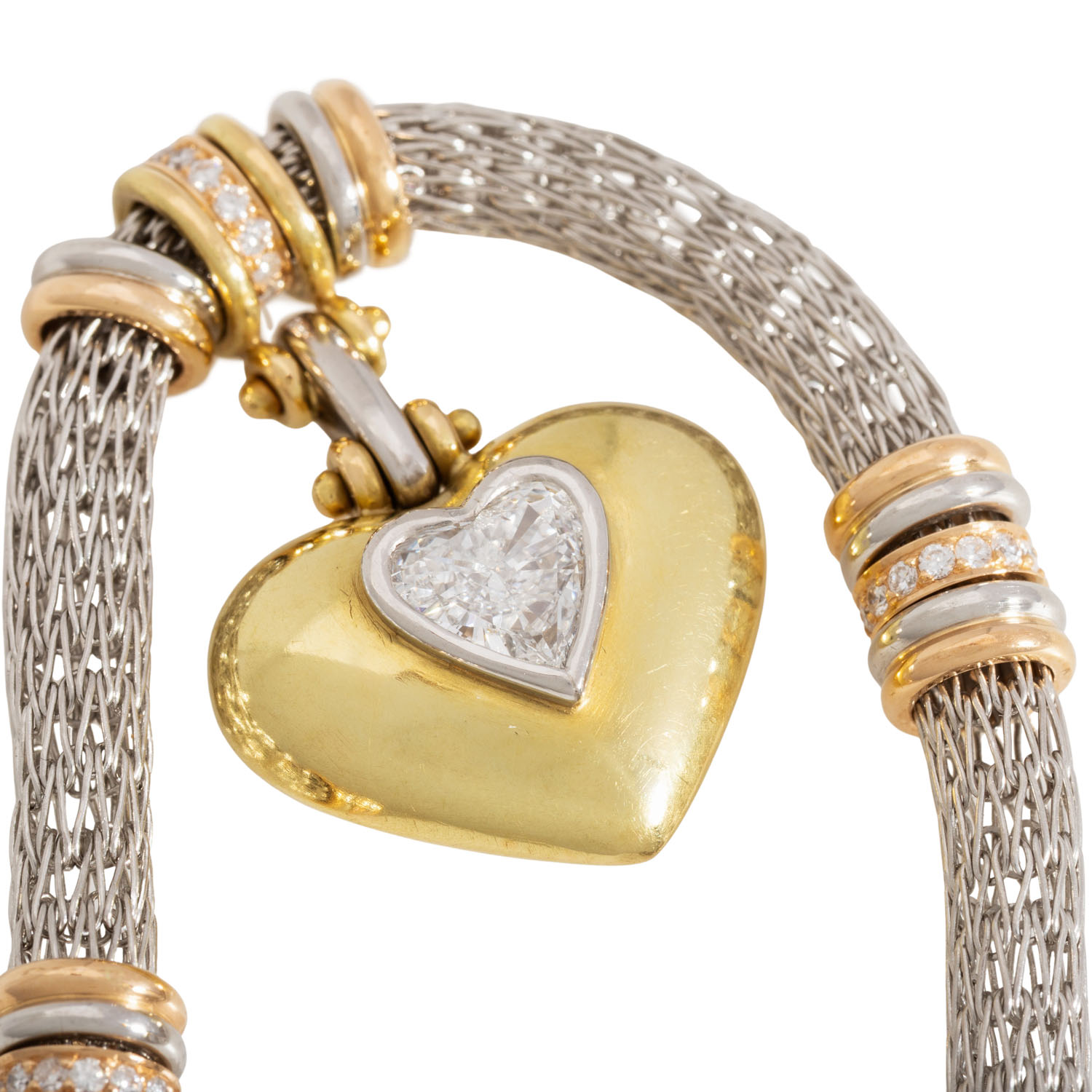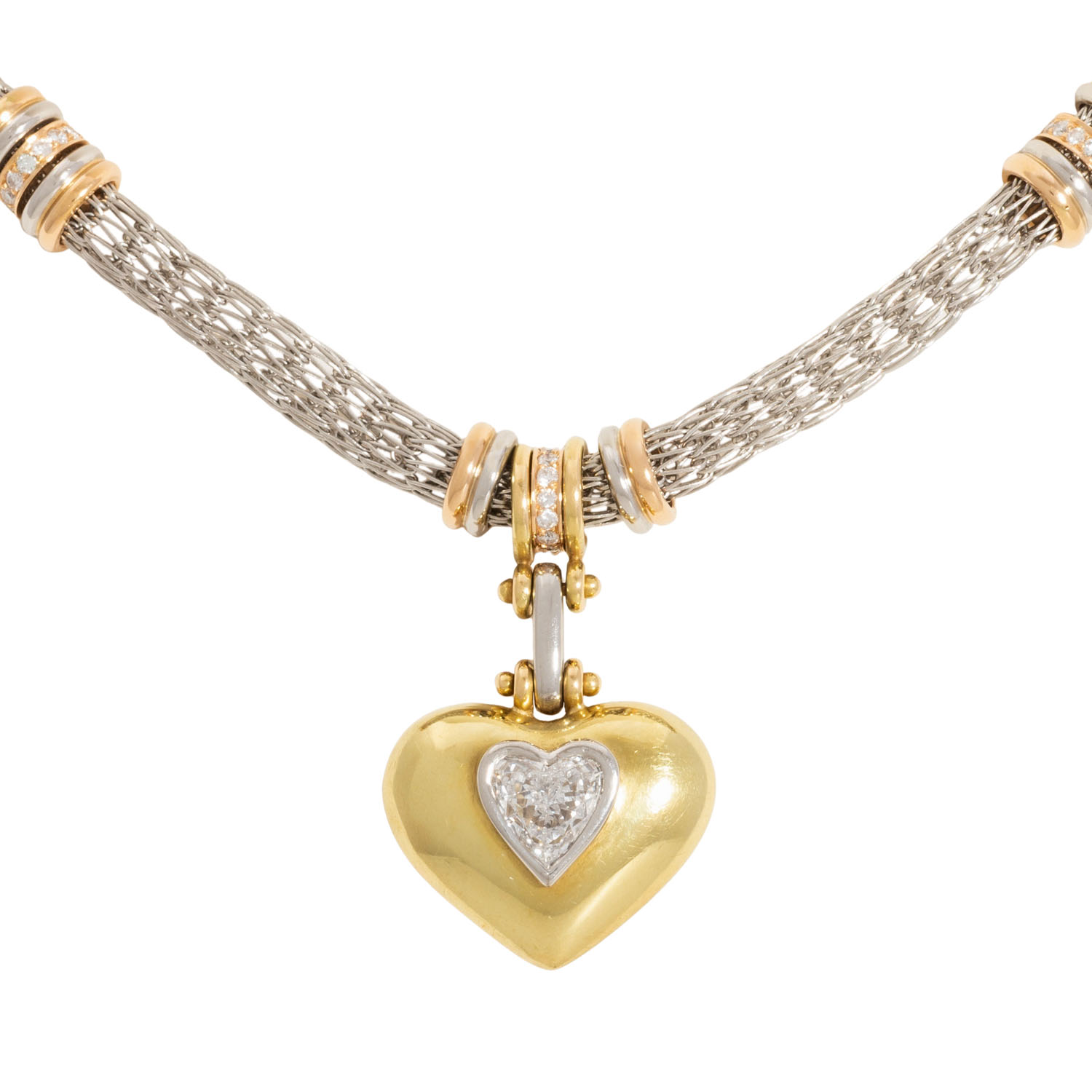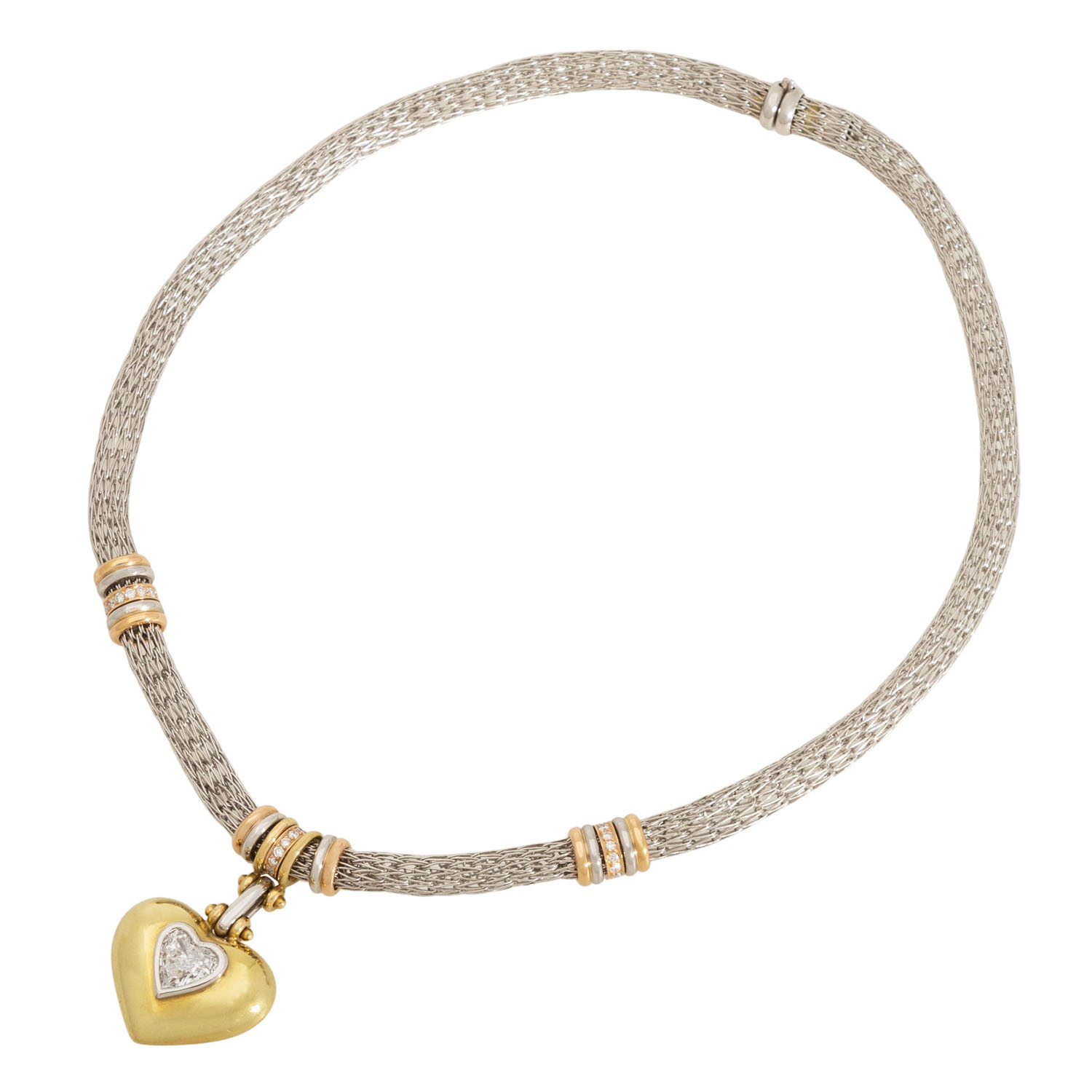 Necklace with diamond heart and 45 brilliant-cut diamonds, diamond heart approx. 1.7 ct, STW (I-J)/P1, fluourescence: strong, brilliant-cut diamonds totalling approx. 0.45 ct, RW (F-G)/VS, 18K yellow gold/platinum, 36.2 g, mesh nacklace L: approx. 38 cm, W: approx. 5.1 mm, pendant L x W: approx. 26 x 21 mm, 20th/21st century, signs of wear, with hallmark.
