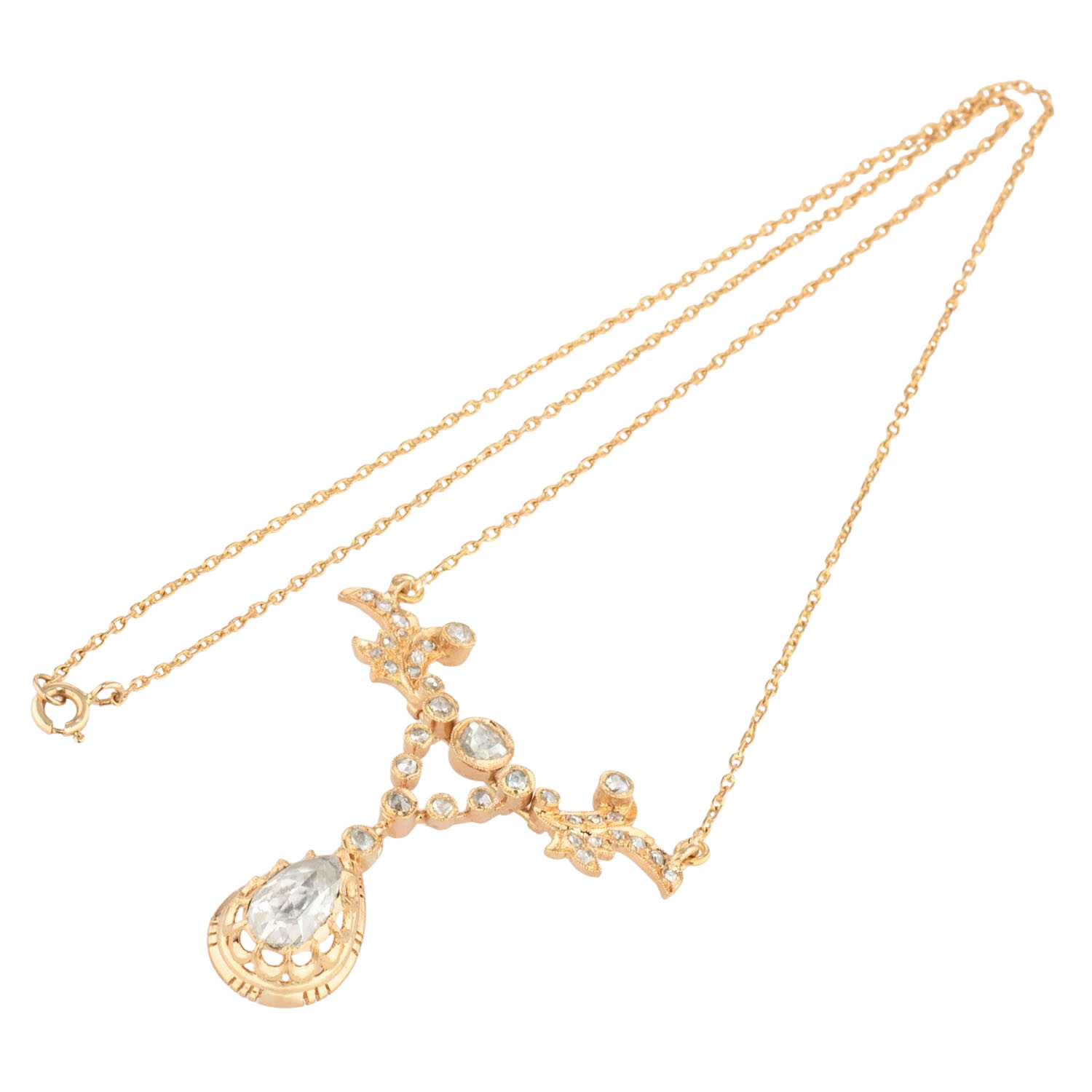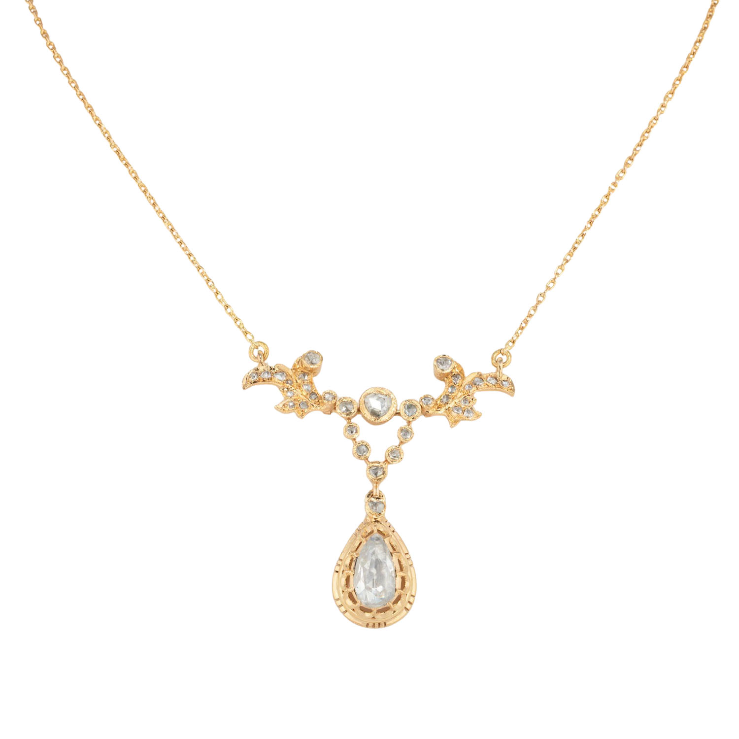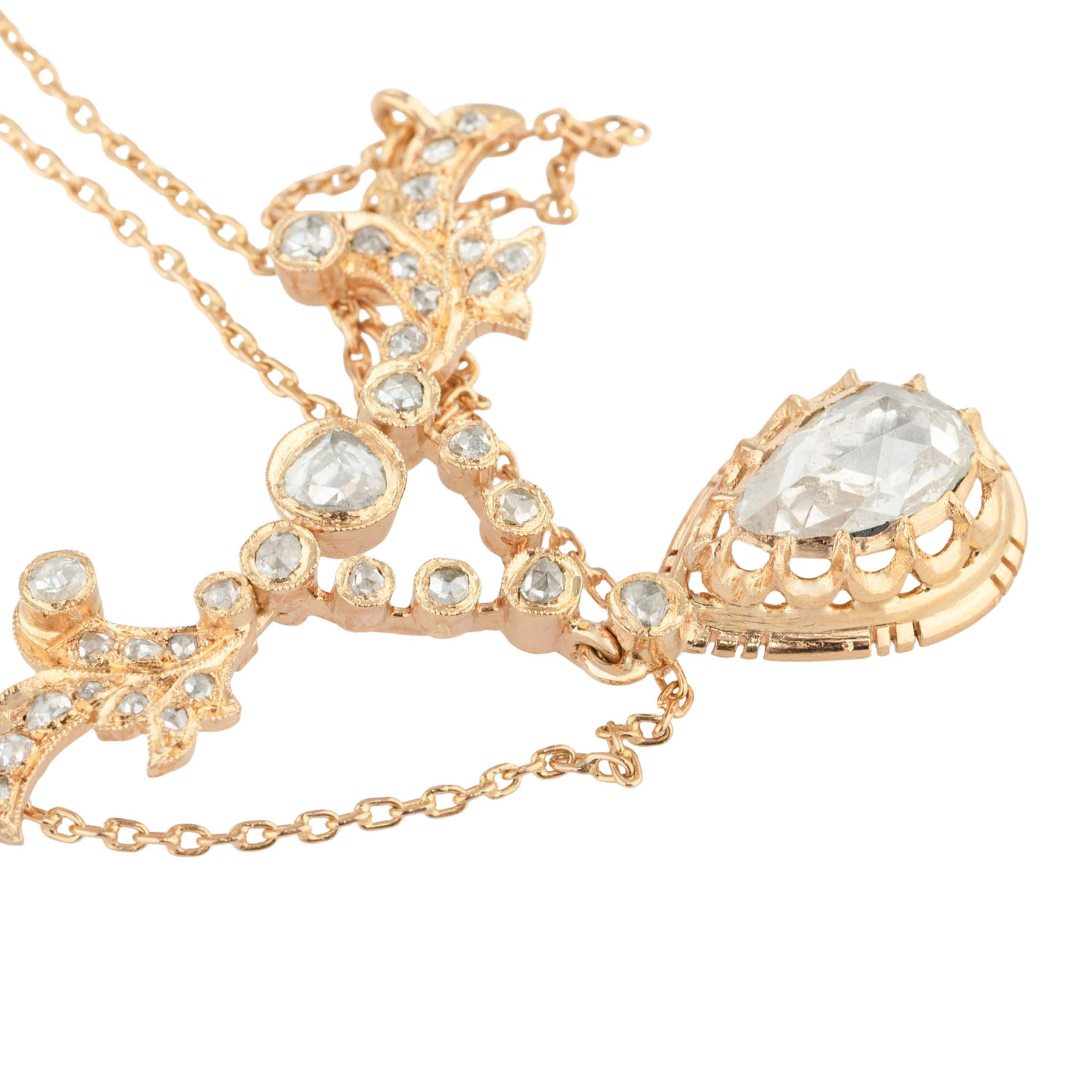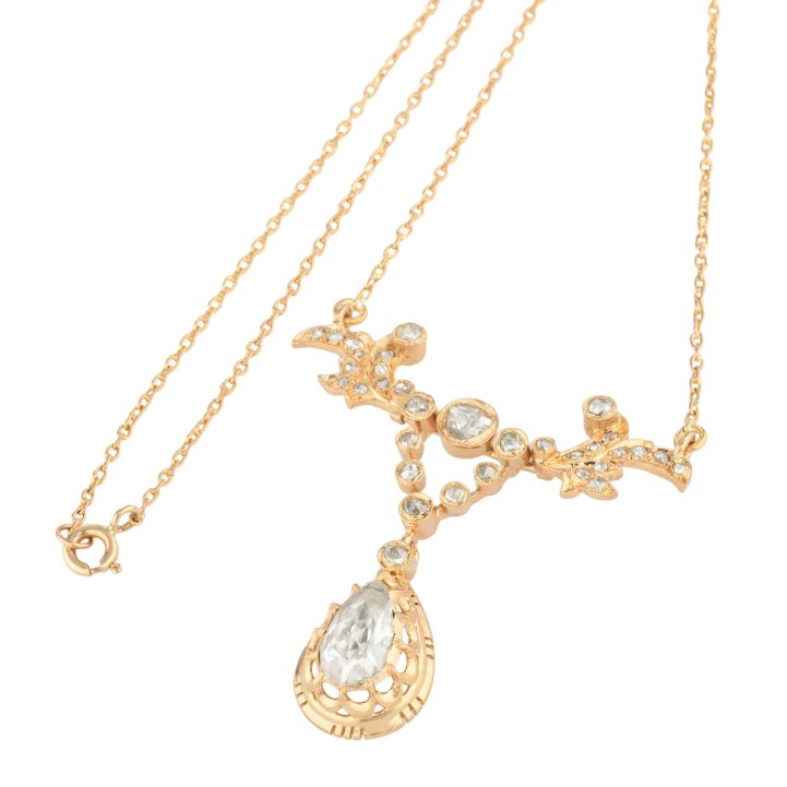 Necklace in the style of Rokoko with rose-cut diamonds, medium colour and clarity, hanging drop 10.5x6.5 mm, ca. TIW K-L)/I1, 18K yellow gold, 11.6 g, L: 45.5 cm, 20th century, minor signs of wear.