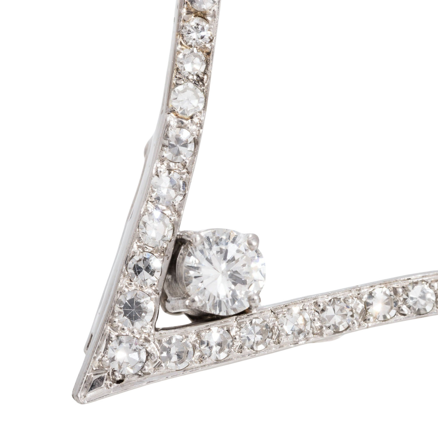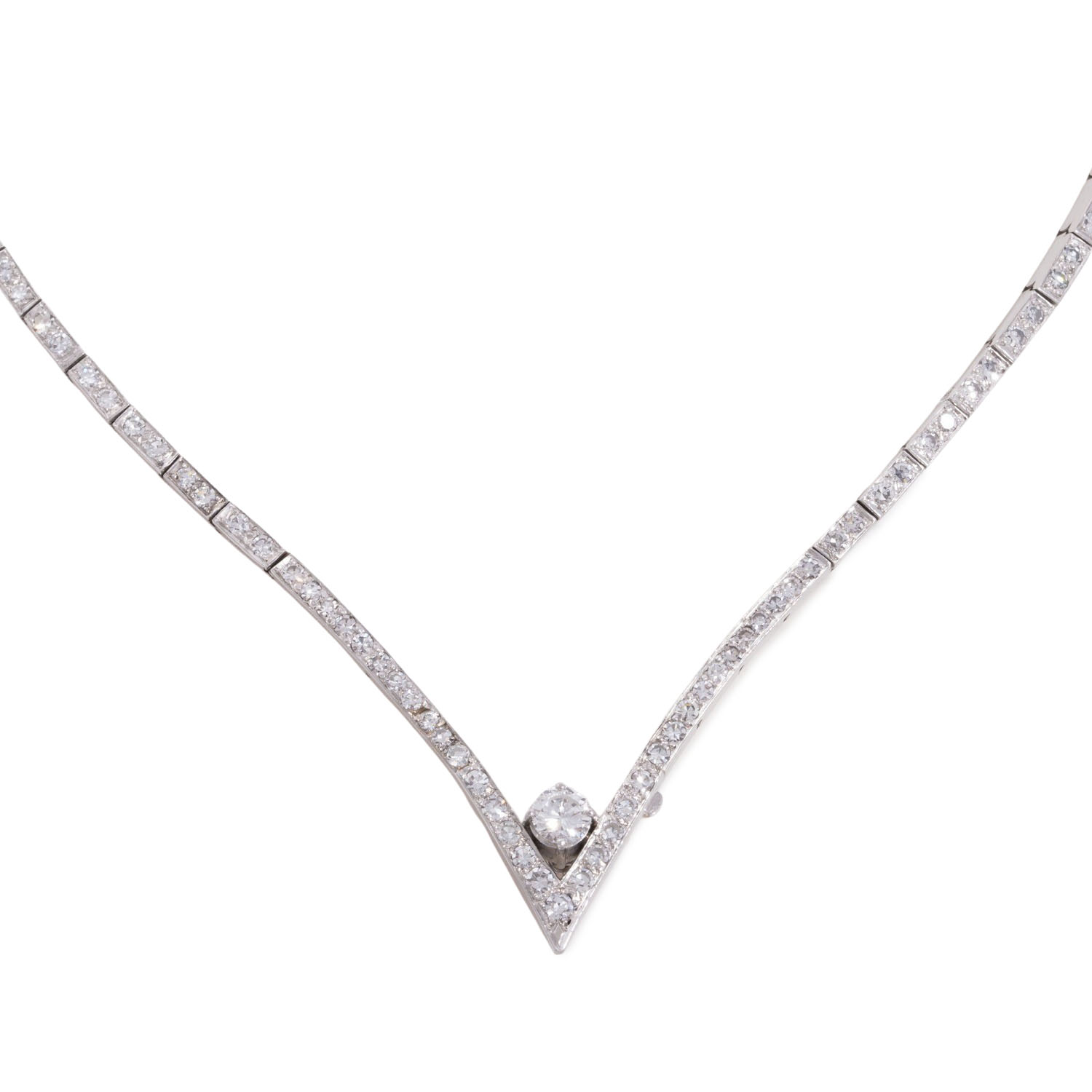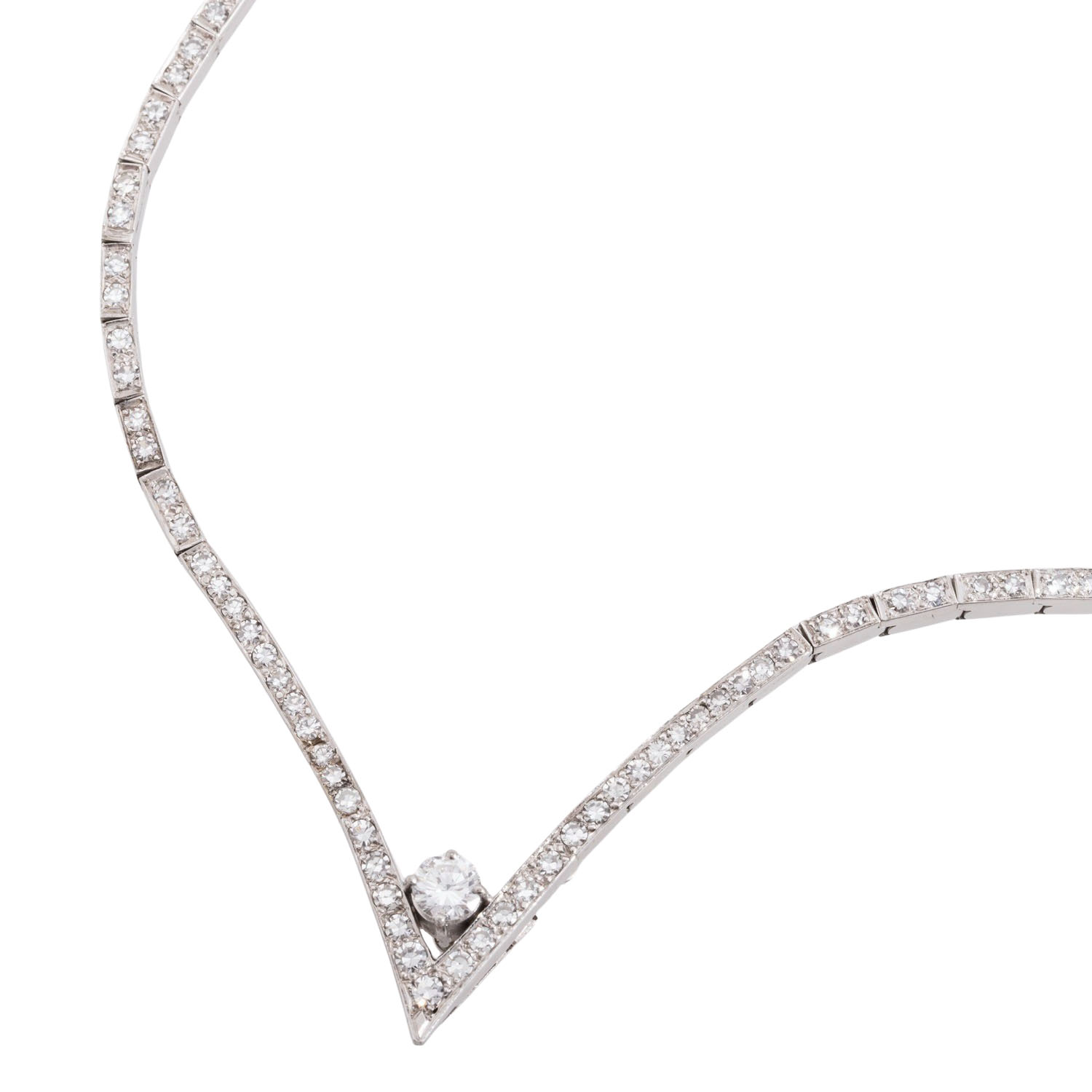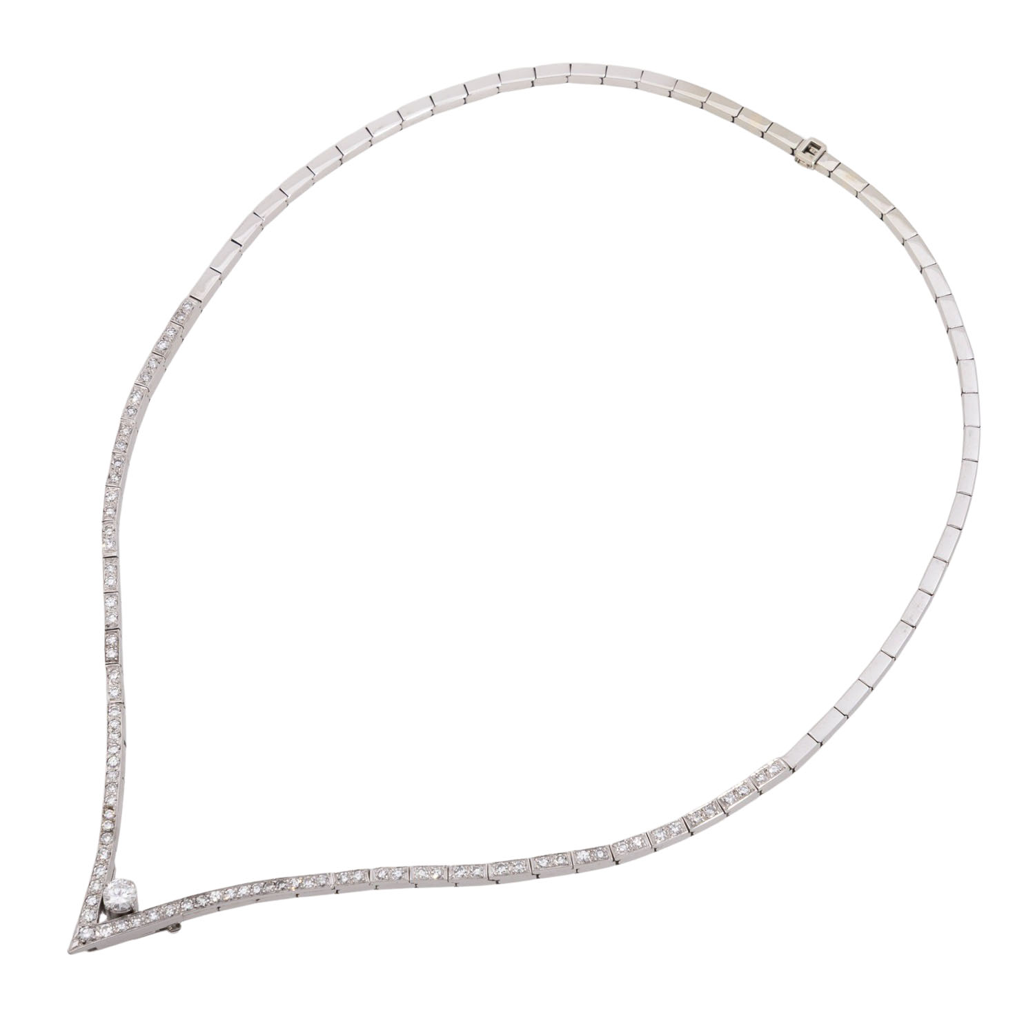 Collier with diamonds, of which 2 brilliant cut, totalling ap. 0.35 ct, WHITE (H)/VS, 80 single cut diamonds, totalling ap. 1.4 ct, good colour and clarity, 18K white gold, 23.7 g, L: 42 cm, box clasp with safety bar, suspension device with safety bar in center, late 20th century, minimal signs of wear.