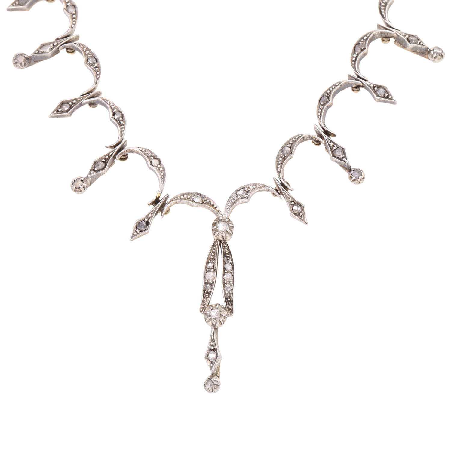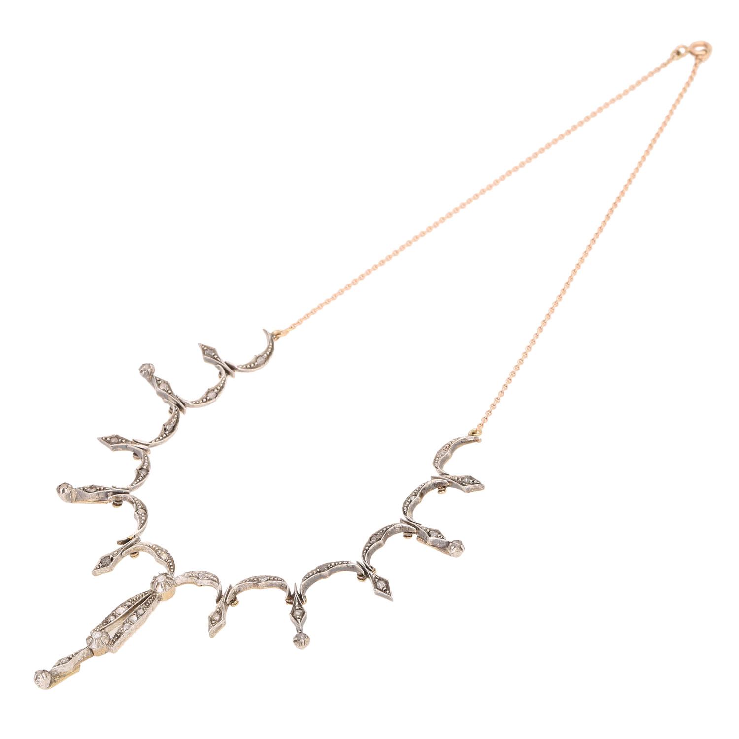 Necklace with diamonds totalling ca. 0.75 ct, 14K YG, face side silver, necklace red gold, 16.8 gr, necklace L: ca. 40 cm, center part around 1900, necklace later, good condition consistent with age.