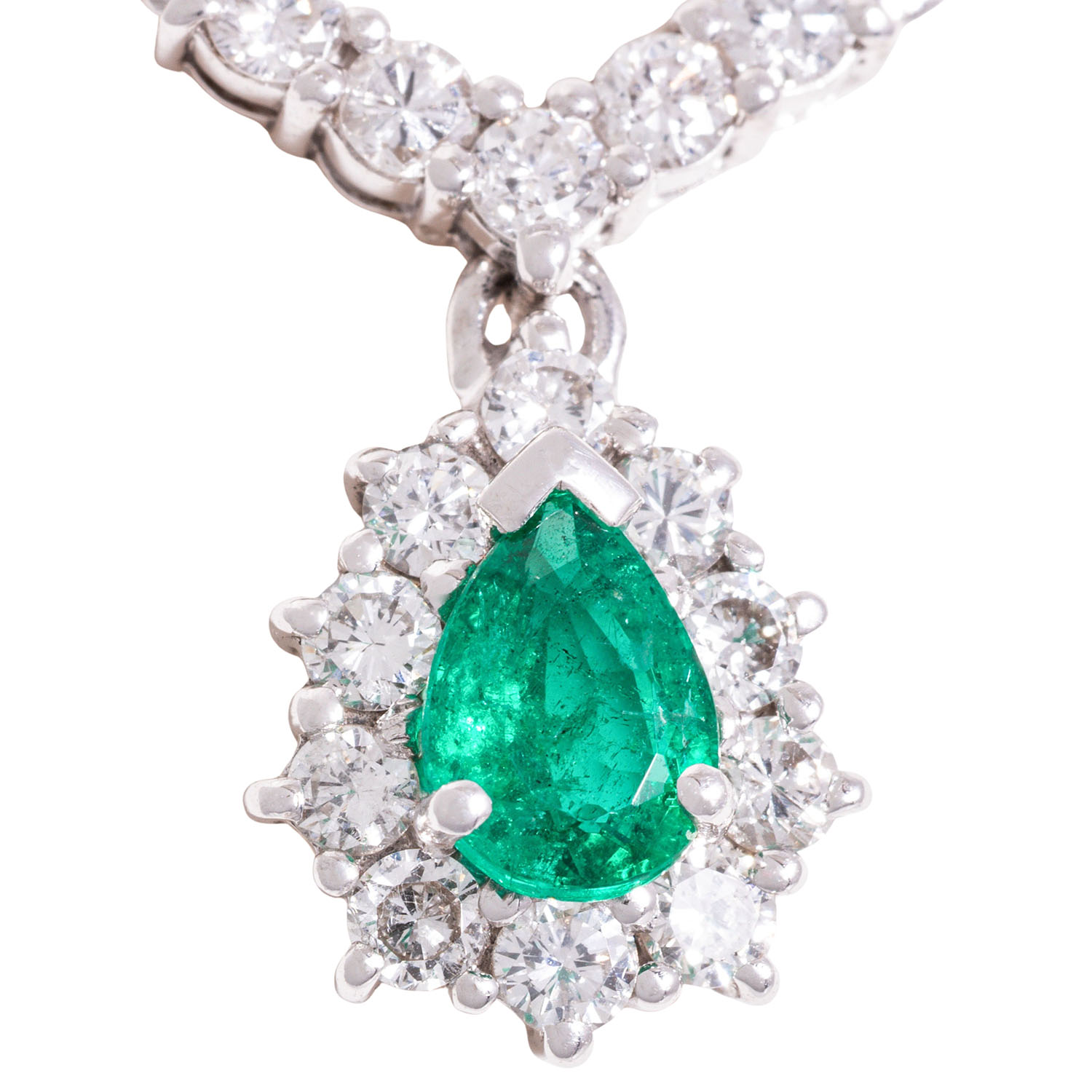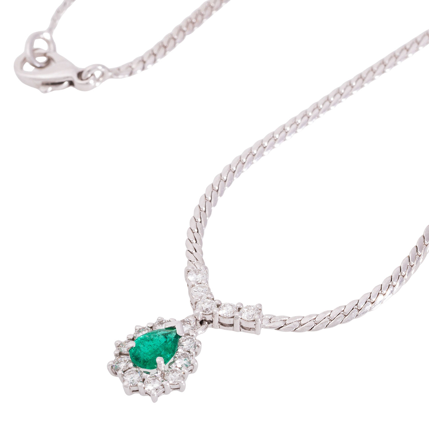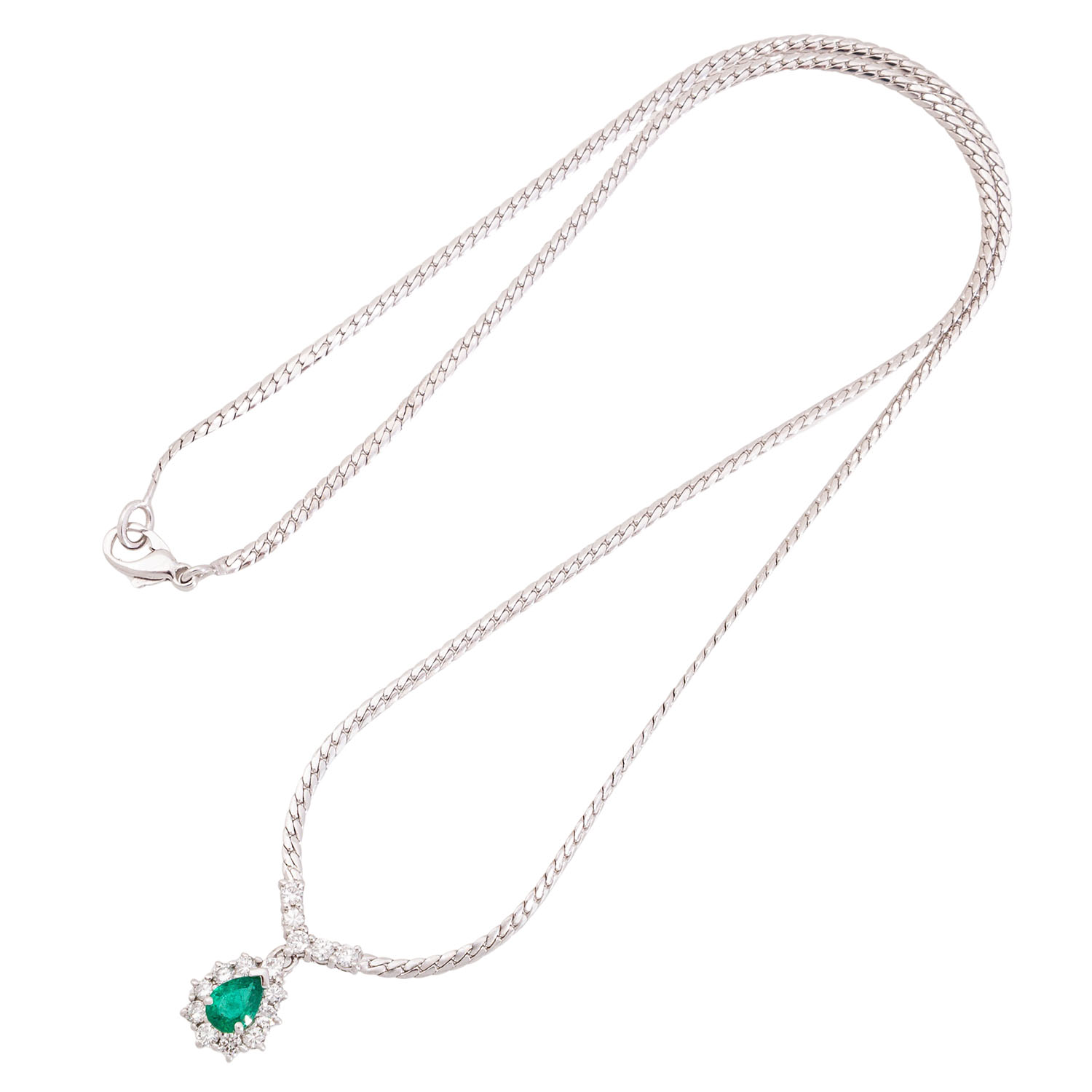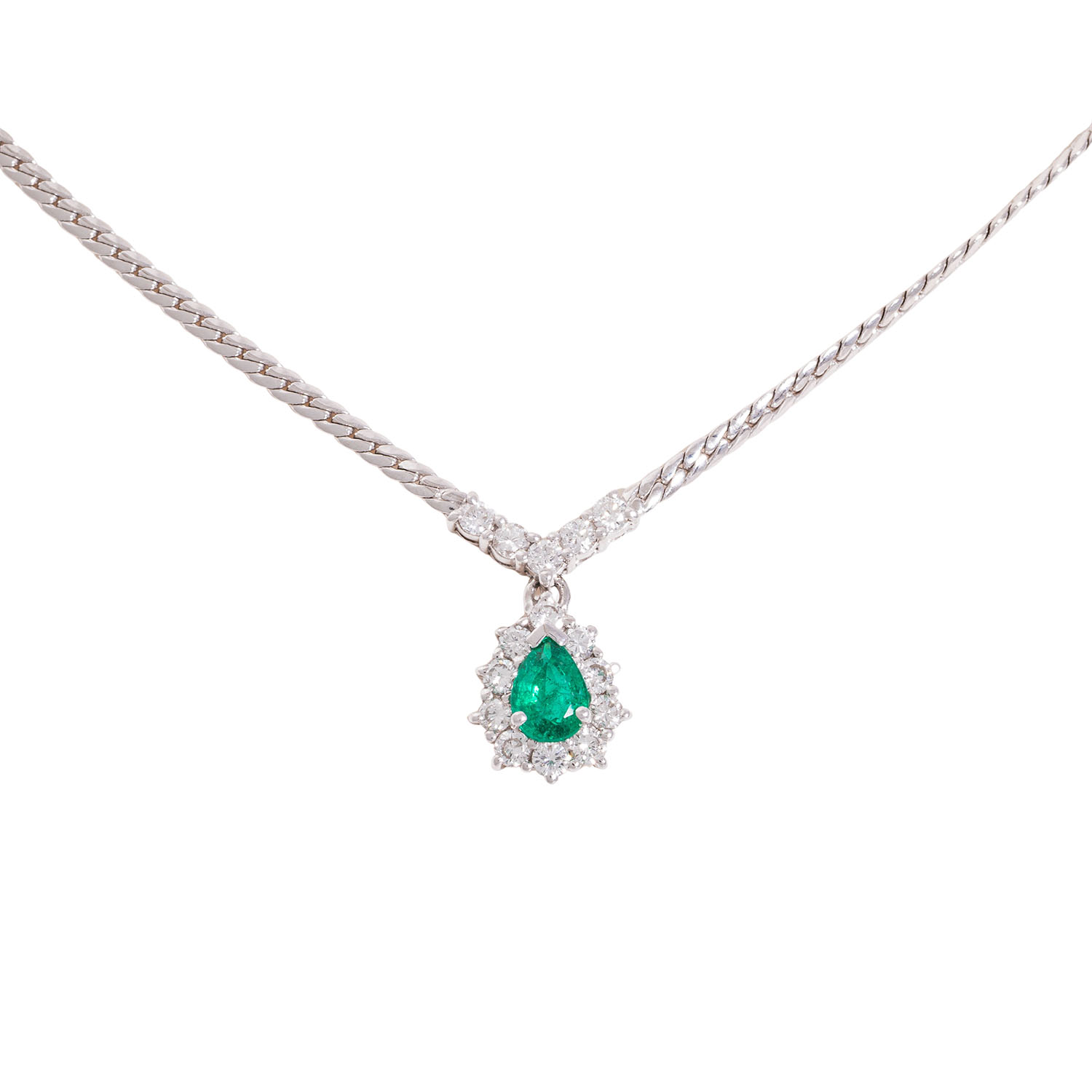 Necklace with emerald and brilliant-cut diamonds weighing approx. 0.59 ct, good to very good color, medium clarity, pear-shaped emerald weighing approx. 0.40 ct, WG 18K, 9.0 g, l: approx. 44.5 cm, 1990s, minor signs of wear, incl. jeweler's certificate from 1993.