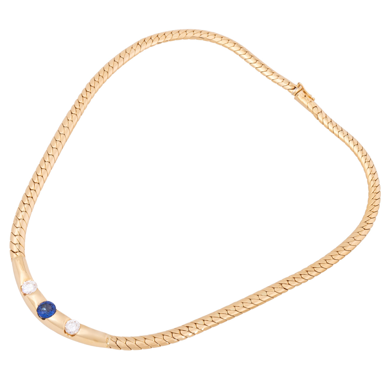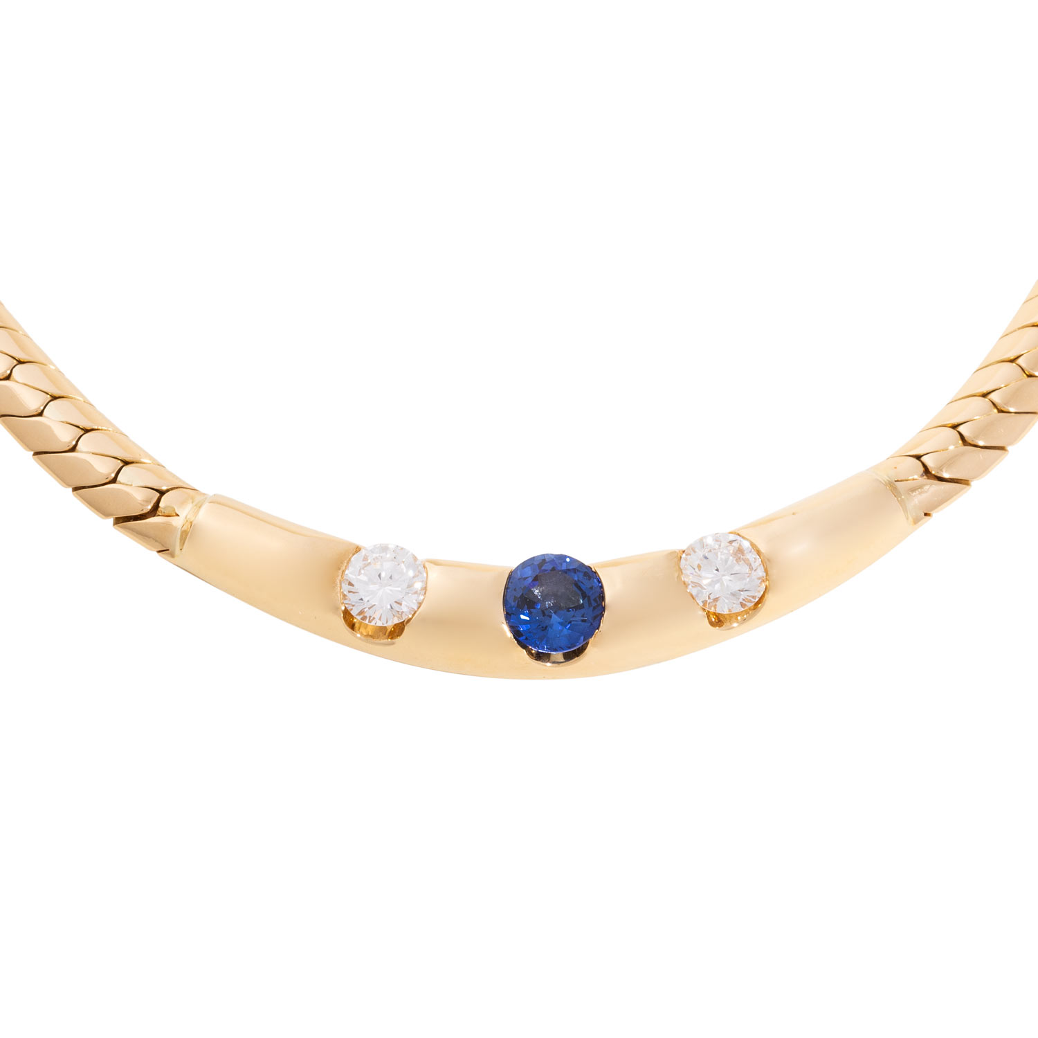 Necklace with fine sapphire and 2 brilliant-cut diamonds of 0.75 ct each, ca. RW (E)/IF, sapphire ca. 1.5 ct, 18K YG, 46.5 gr, L: ca. 42 cm, 1990s, minimal signs of wear, incl. 2 IGI certificates (1987).