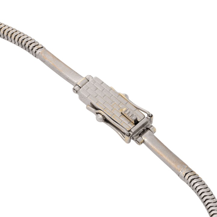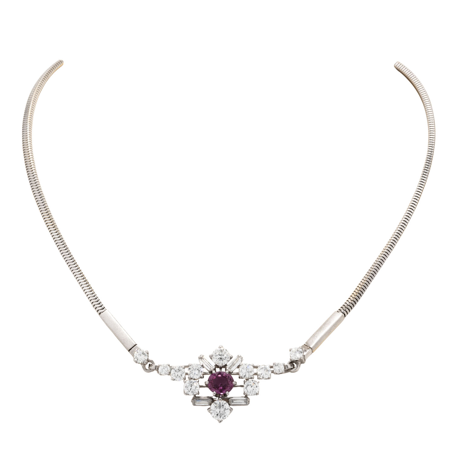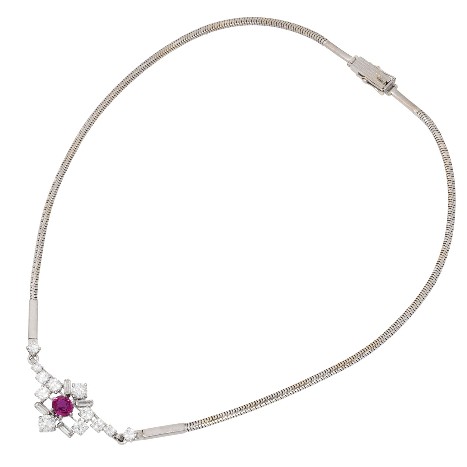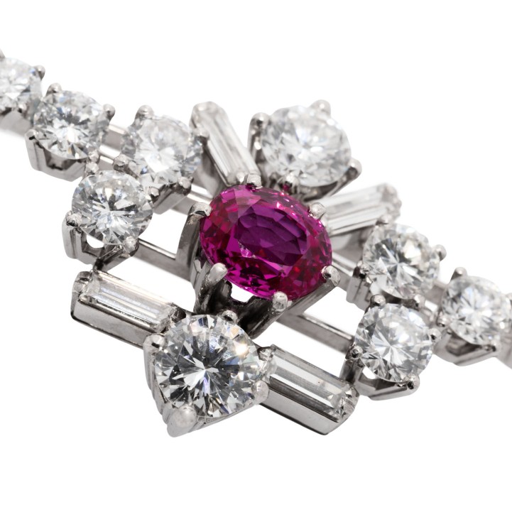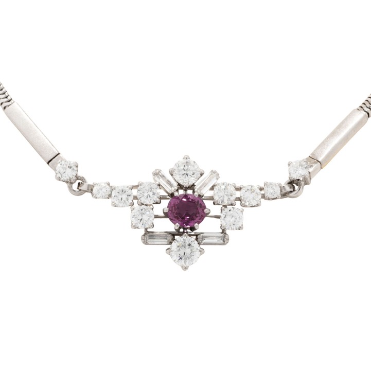 Necklace with fine oval faceted vivid-pink sapphire and baguette- and brilliant-cut diamonds totalling ca. 3.7 ct, ca. RW-STW (G-I)/VS, of which largest brilliant ca. 0.55 ct, 18K white gold, 34 g, L: 45 cm, 2nd half of 20th century, handcrafted mid-section in nice condition, snake necklace with parts of repair and enlargement.