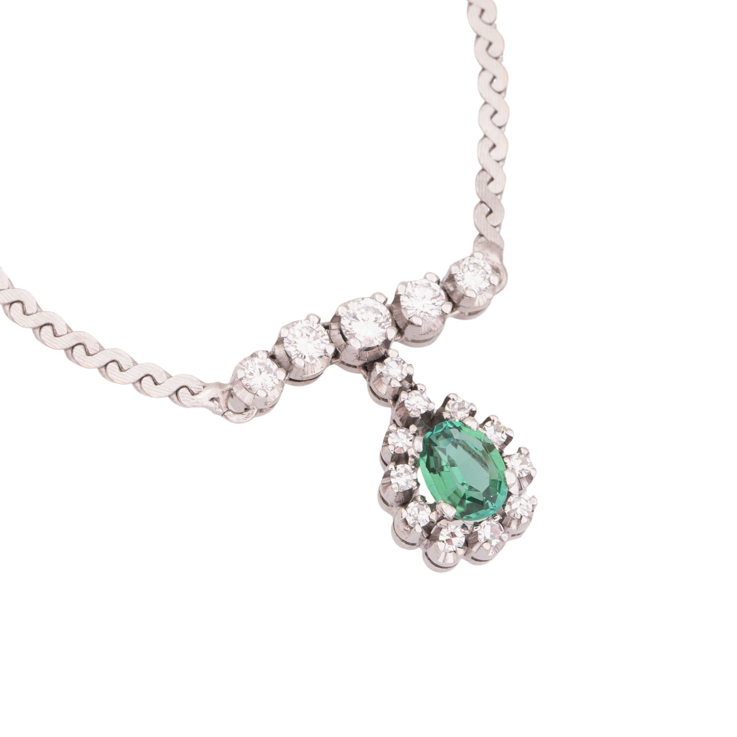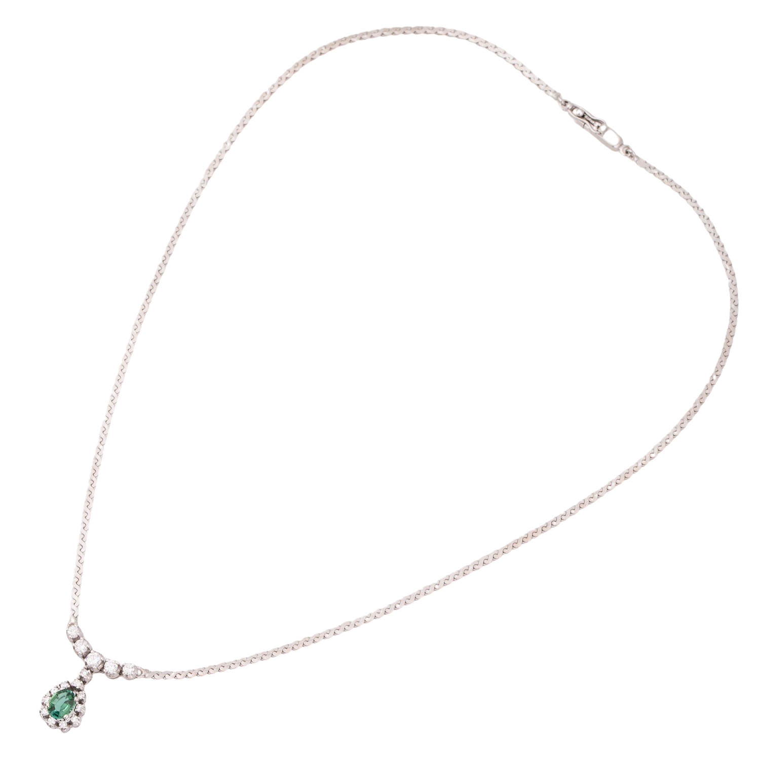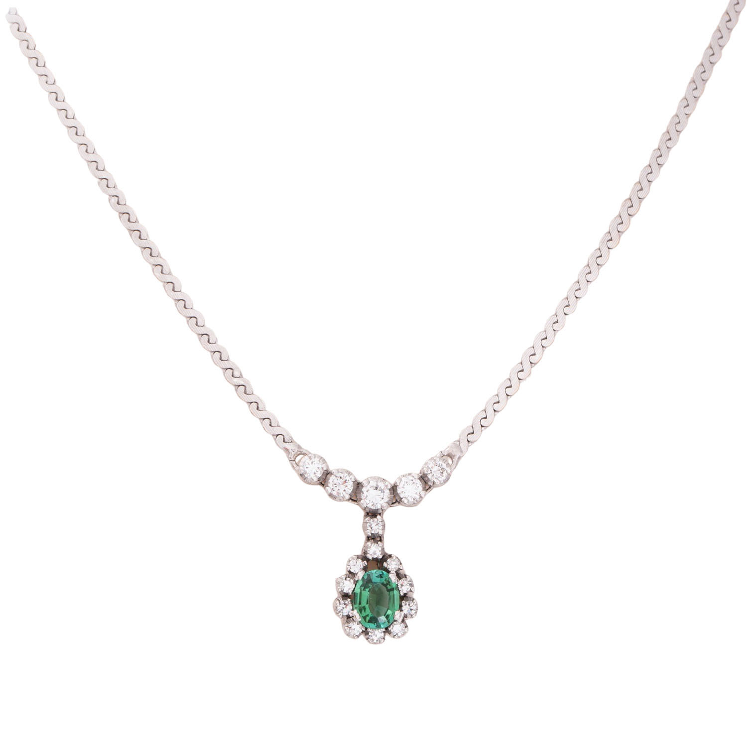 Necklace with green oval tourmaline ca. 0.6 ct and brilliant-cut diamonds totalling ca. 0.5 ct, good colour and clarity, 18K white gold, 11.6 g, L: 42 cm, 2nd half of 20th century, minor signs of wear.