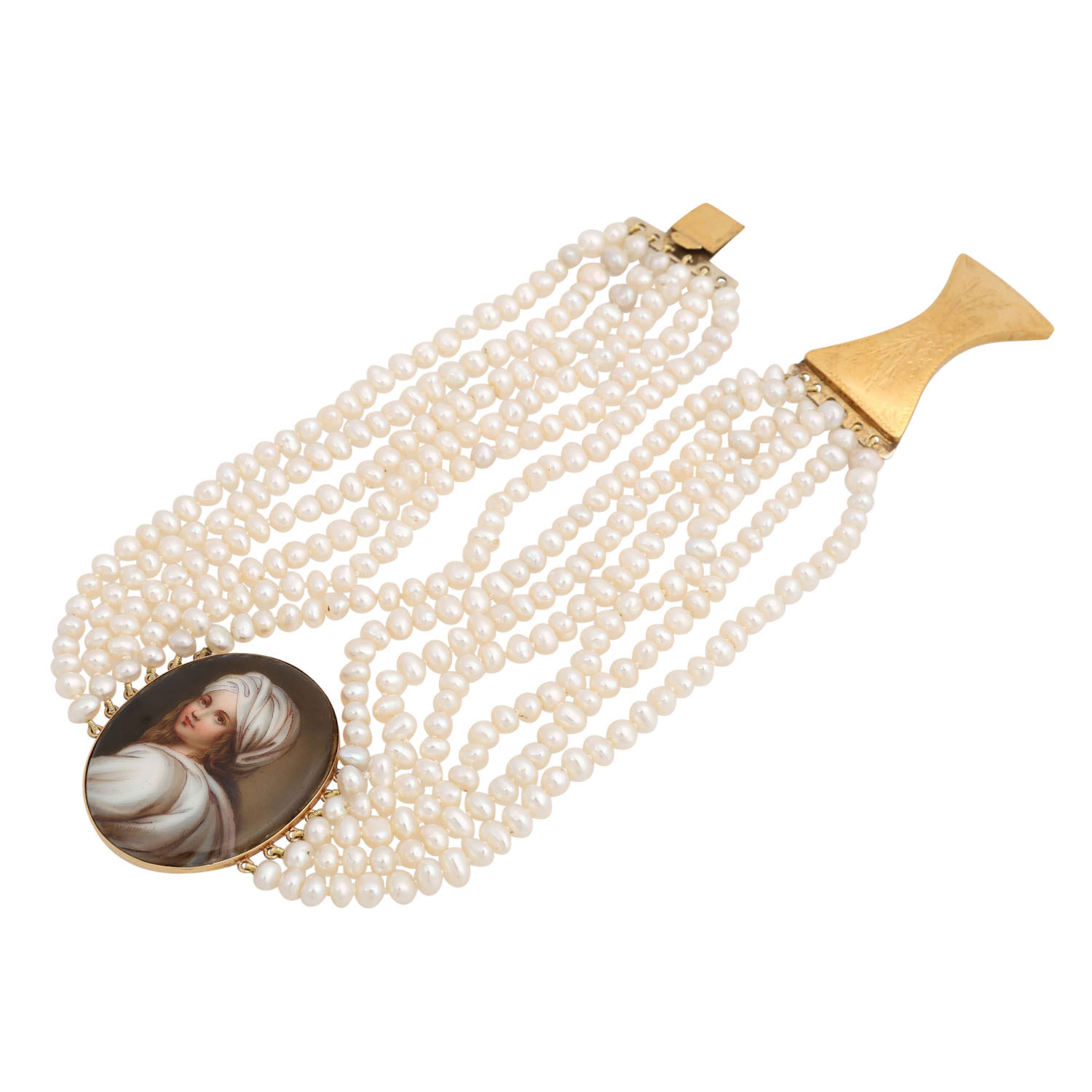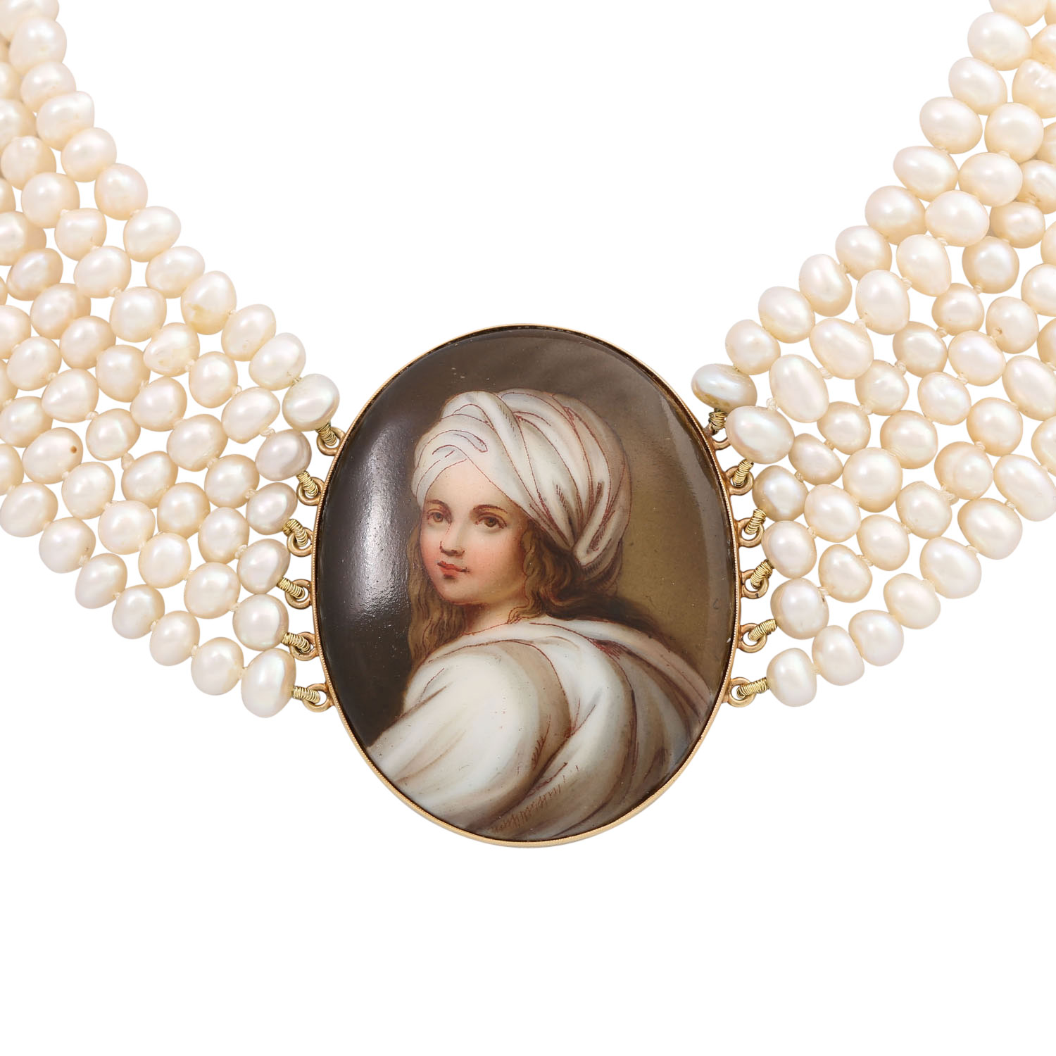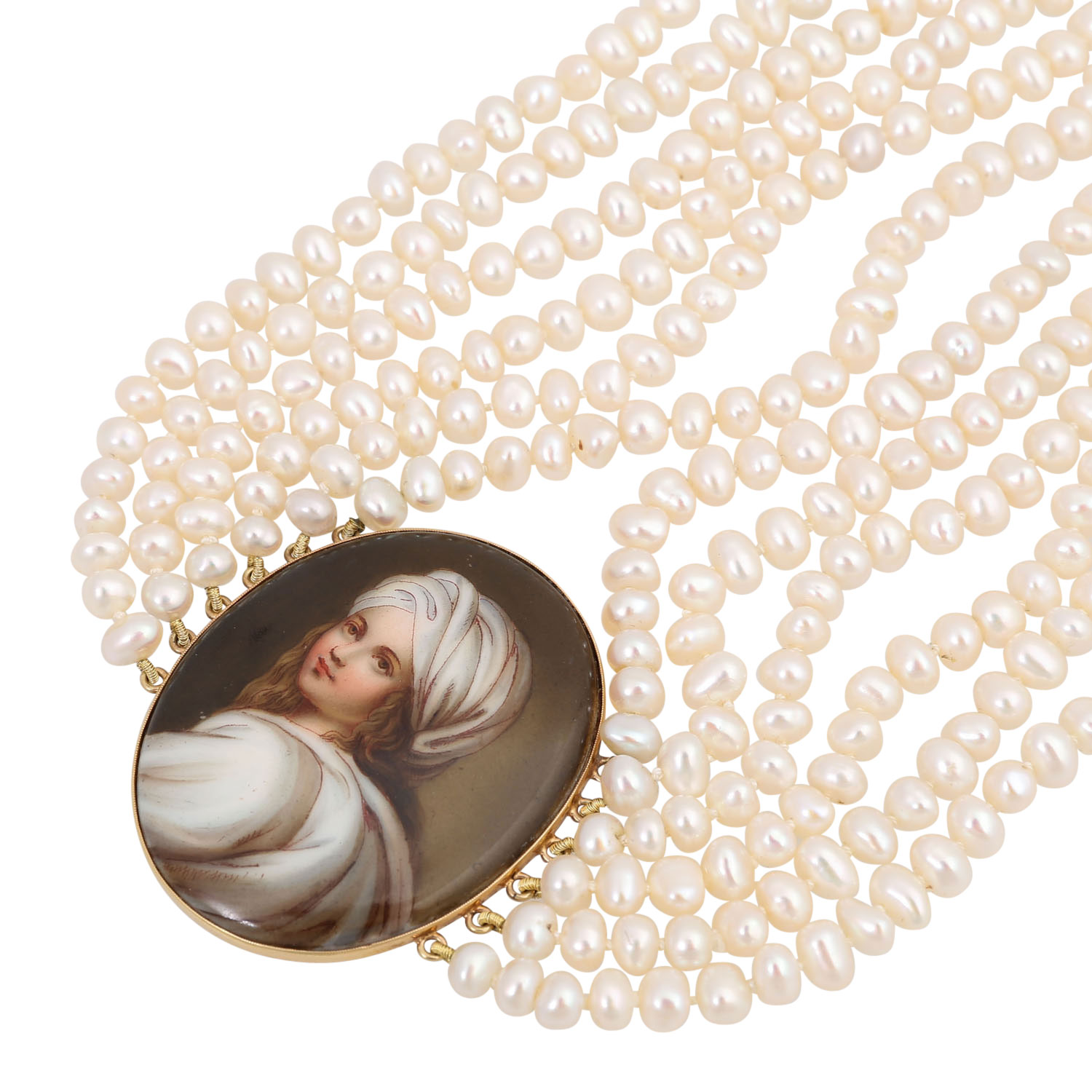 Choker with Miniature painting after Guido Neri 'Portrait of Beatrice Cenci' set in 14K yellow gold, 4.7x3.7 cm, clasp with engravings made of metal gilded, both antique parts set-in modern 6-rows necklace made of fresh water cultured pearls, L: 36 cm, 19th/20th century, good condition.