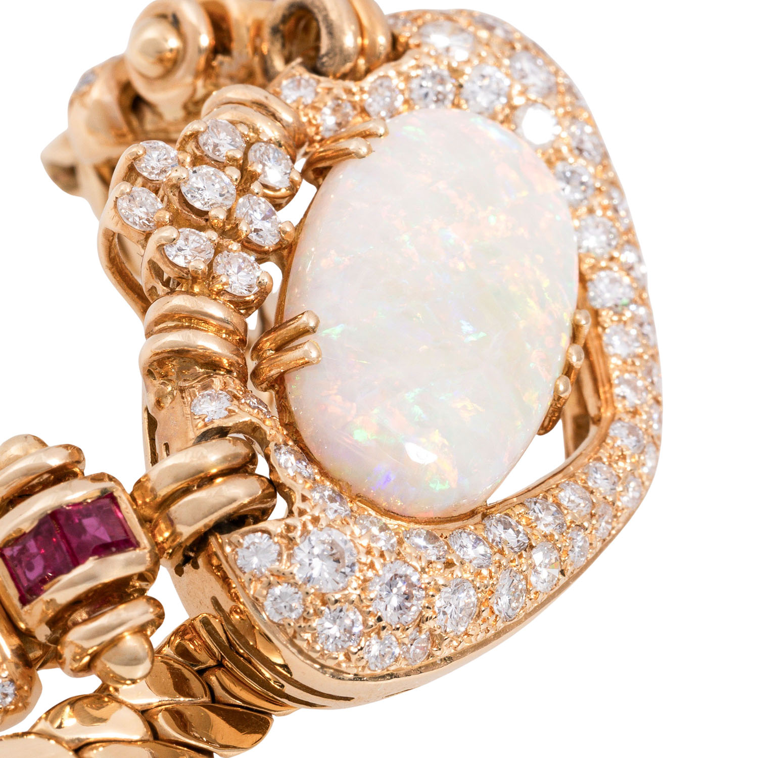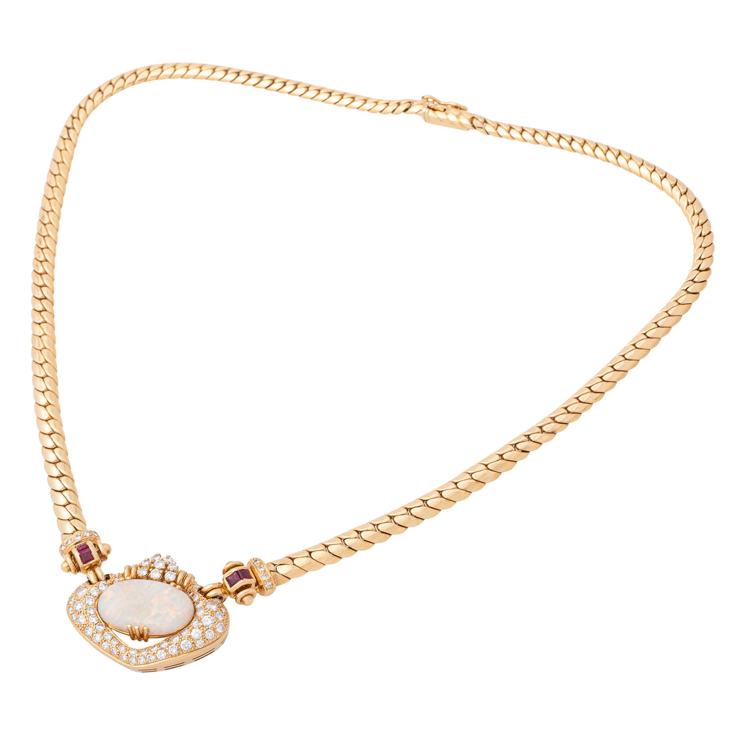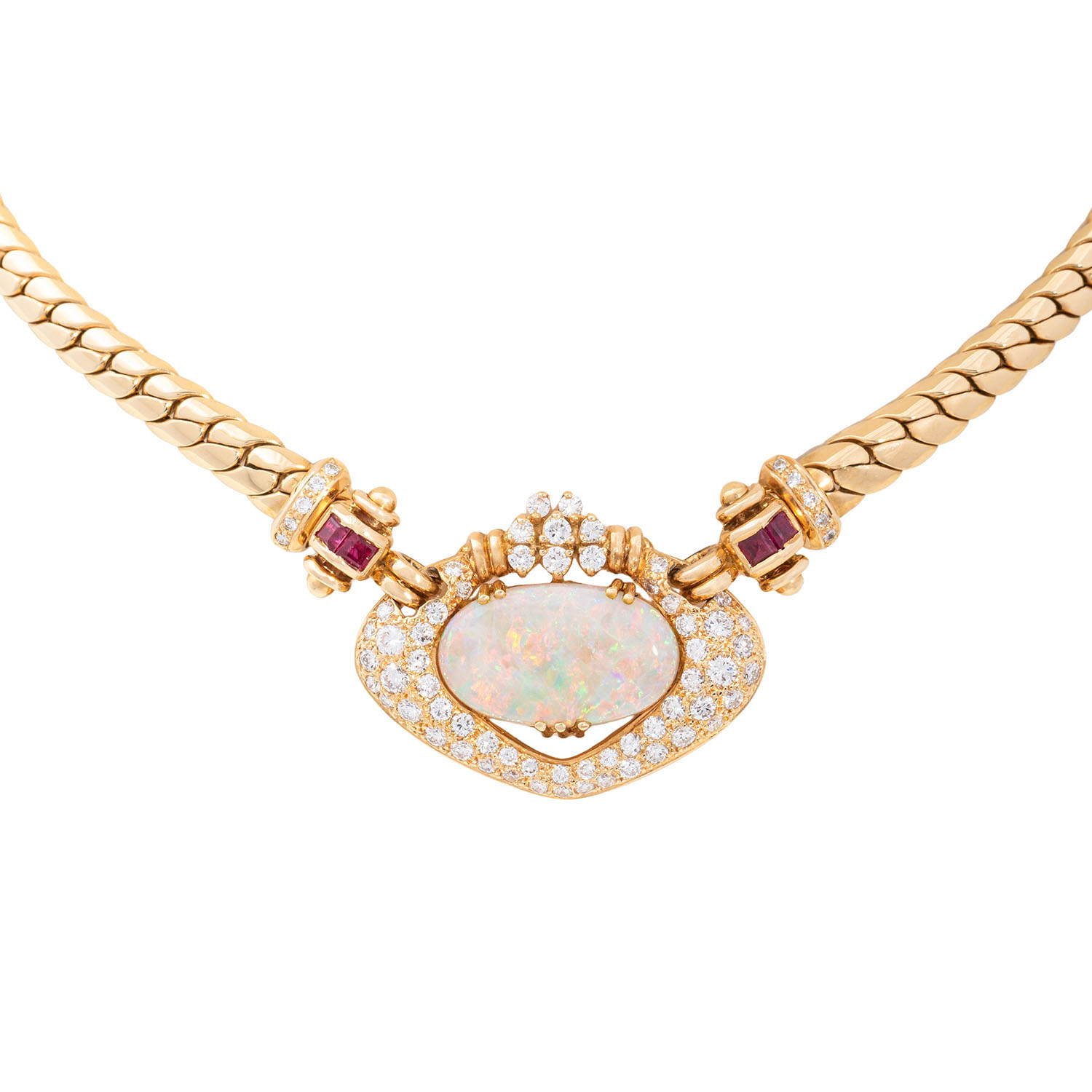 Necklace with beautiful oval opal ca. 5.9 ct, 4 carré-cut rubies ca. 0.63 ct and brilliant-cut diamonds, totalling ca. 2 ct, ca. WHITE-STW (H-J)/SI, 18K yellow gold, 38.5 g, L: 43 cm, late 20th century, minor signs of wear.