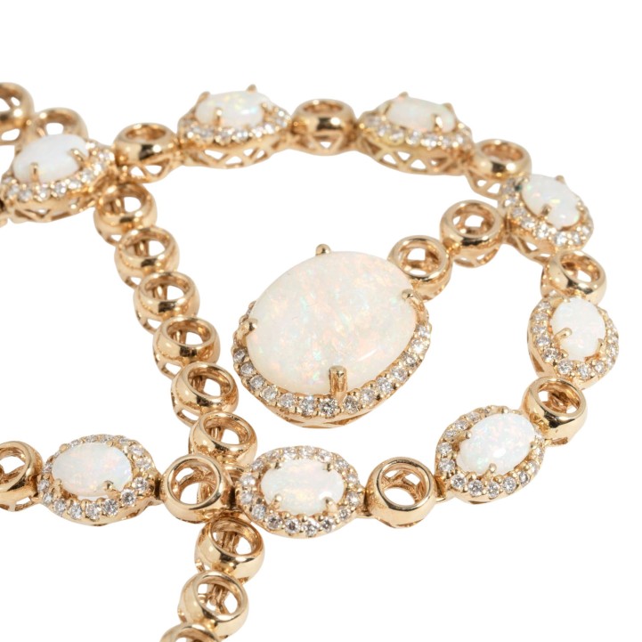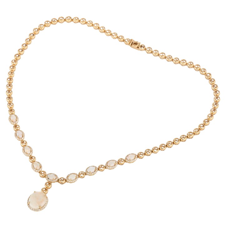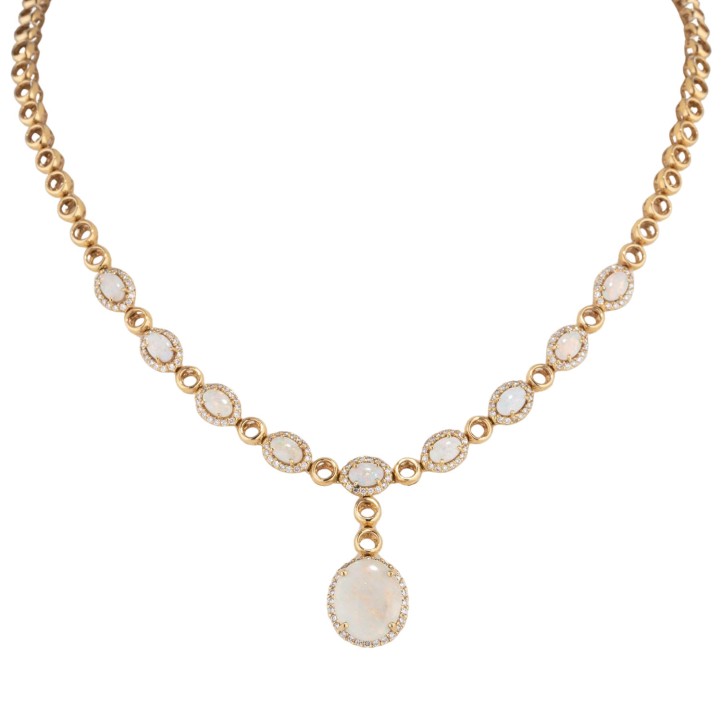 Necklace with opals totalling ca. 6 ct and brilliant-cut diamonds totalling ca. 1.3 ct, 1 hanging opal 14x11 mm and 9 opals 6x4 mm (of which 1x with drying crack), 18K yellow gold, 37.6 g, L: 45.5 cm, 20th/21st century, good condition.