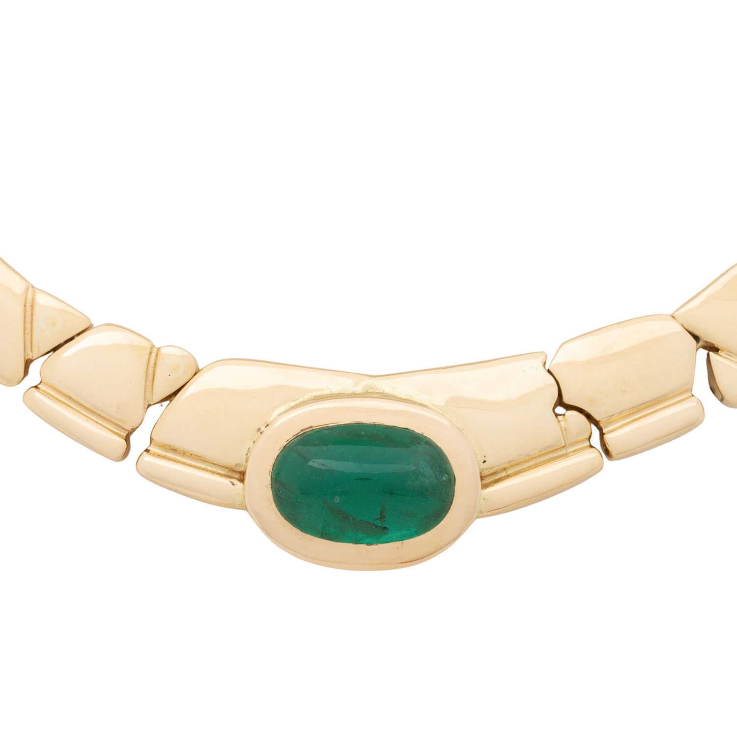 Necklace with green oval emerald cabochon, ap. 14.8 x 9.3 mm, 18K yellow gold, 50.5 g, L: 39 cm, box clasp with security catch, late 20th century, minimal signs of wear.