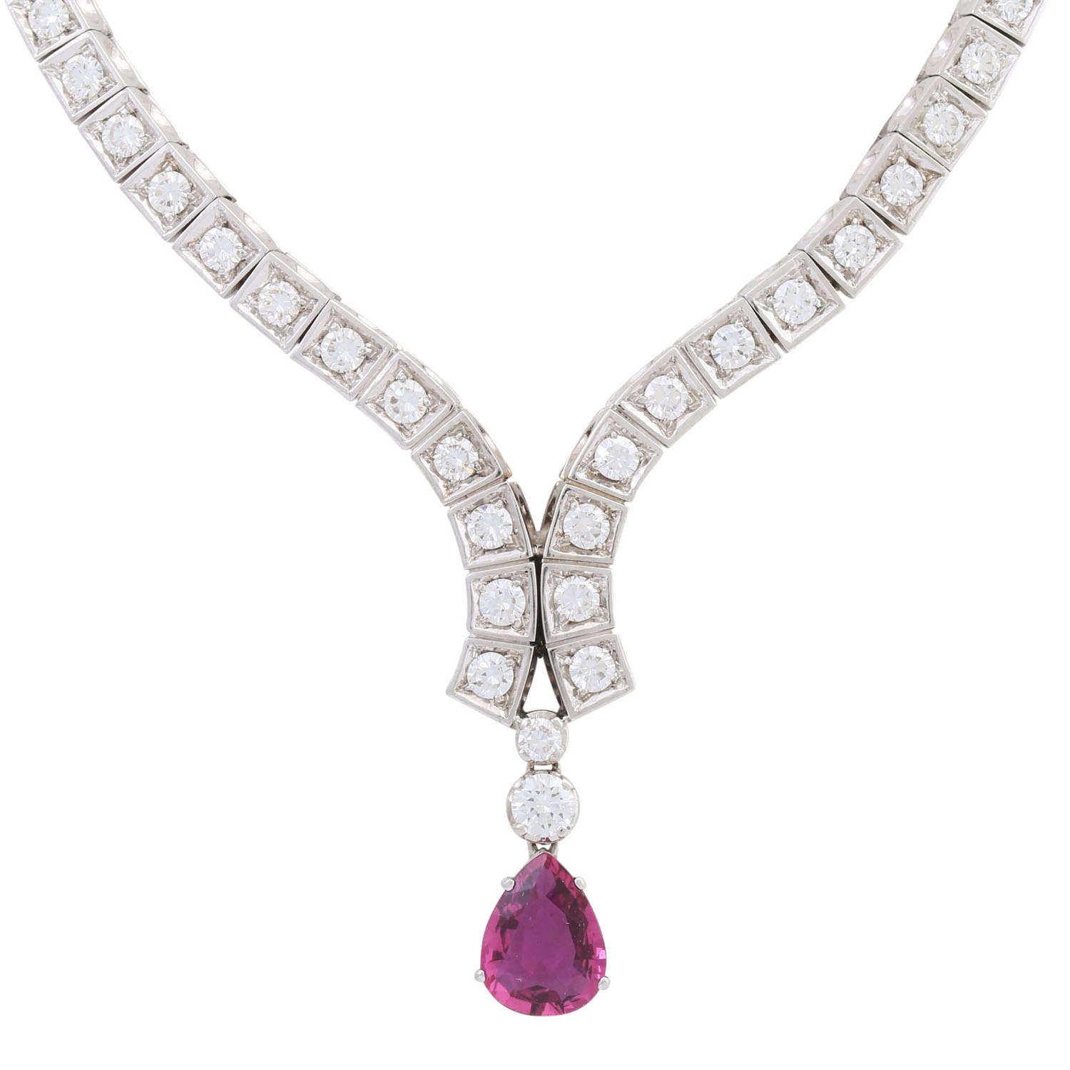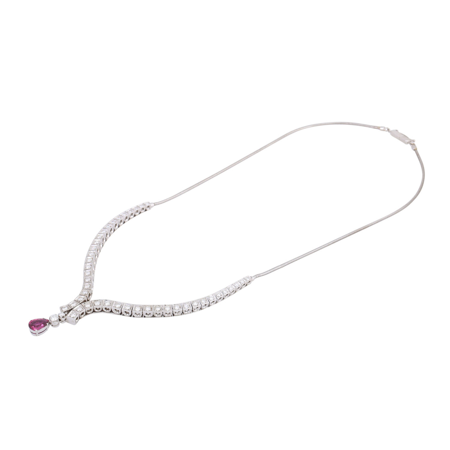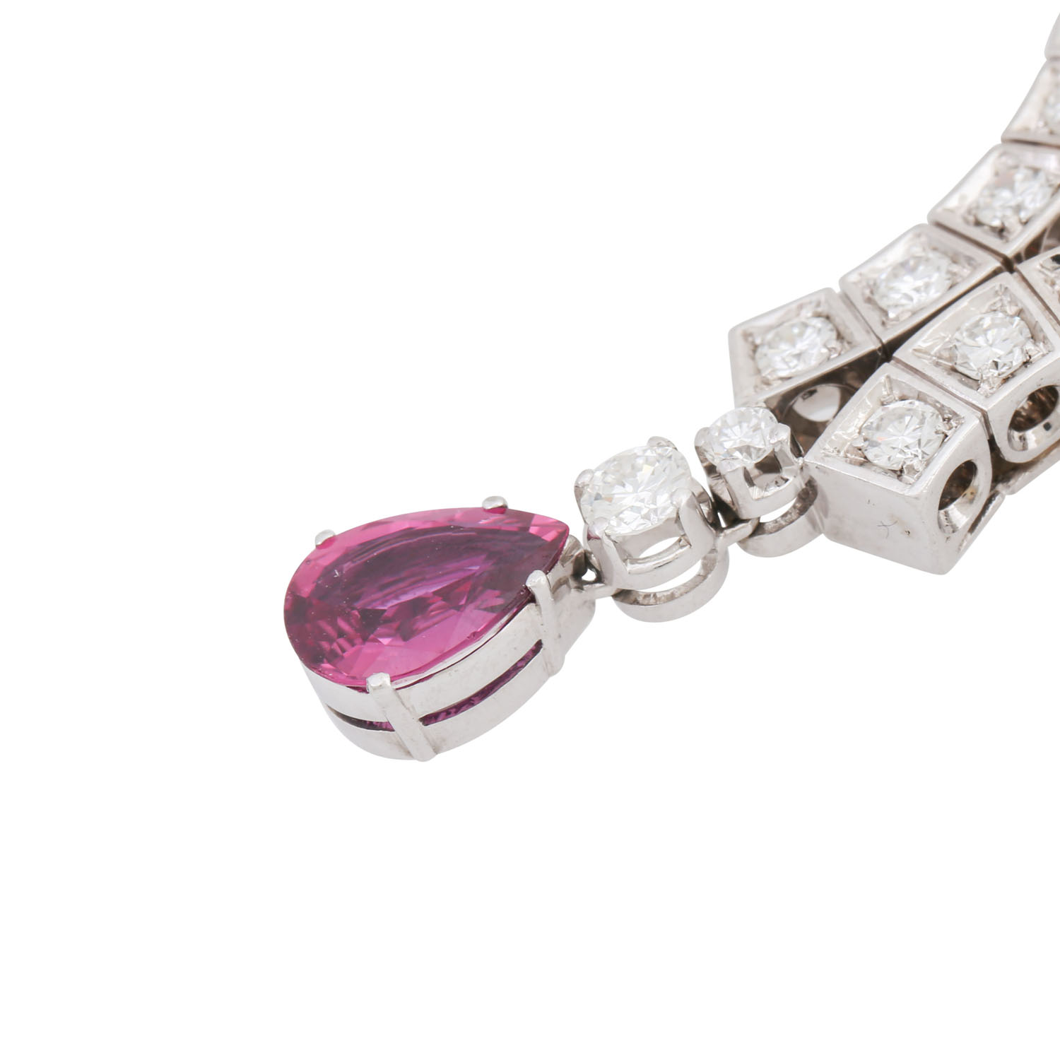 Necklace with pink pear-cut faceted sapphire and brilliant-cut diamonds totalling ca. 3 ct, ca. WHITE-STW (H-J)/VVS, 18K white gold, 34.4 g, L: ca. 46 cm, 2nd half of 20th century, minor signs of wear.