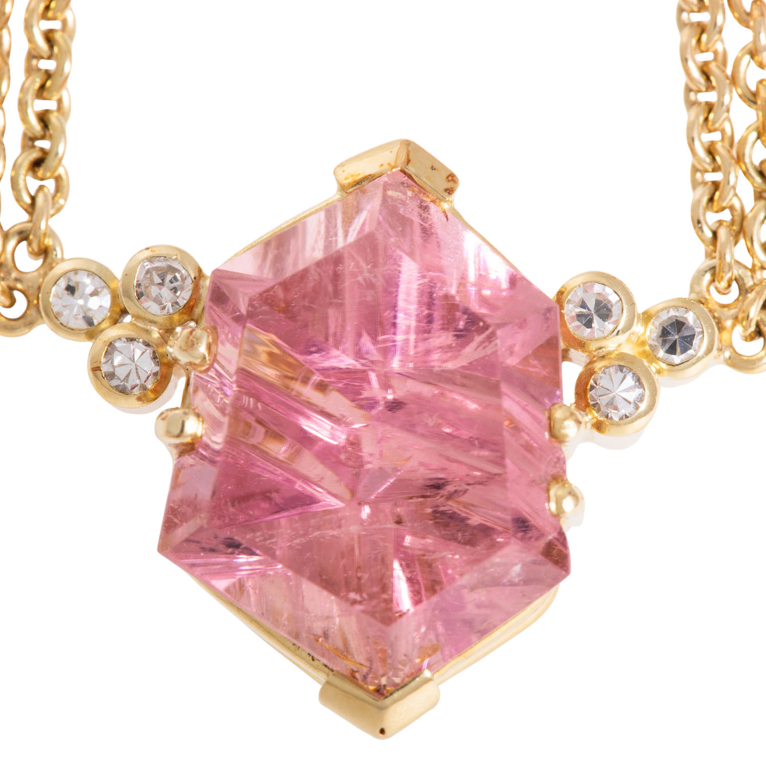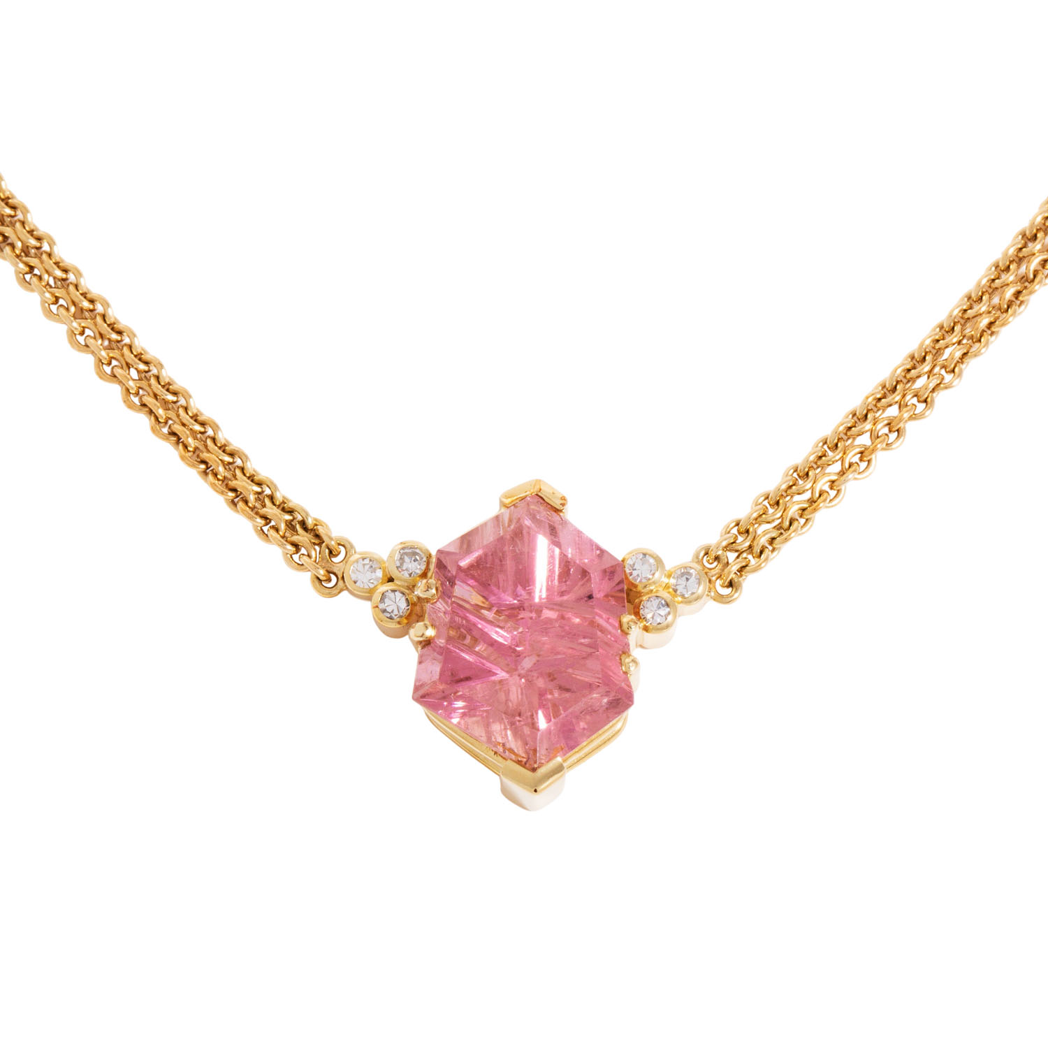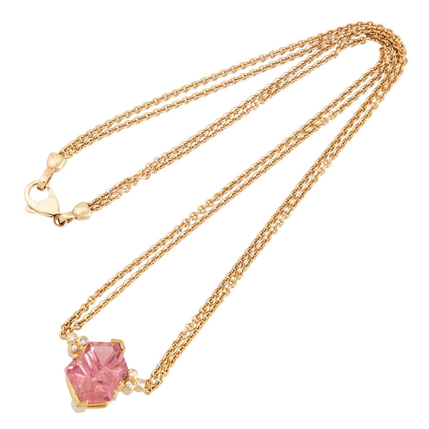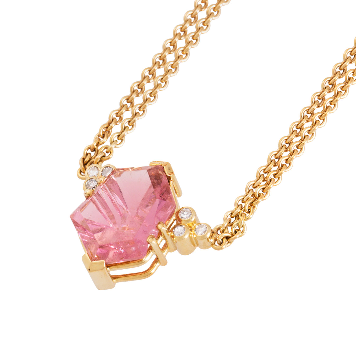 Necklace with pink tourmaline, modern cut from Munsteiner, 6 single cut diamonds, totalling ap. 0.10 ct, good colour and clarity, with double row anchor chain, 14K yellow gold, 14.0 g, L: 40 cm, 20th/21st century, minimal signs of wear, handcrafted.