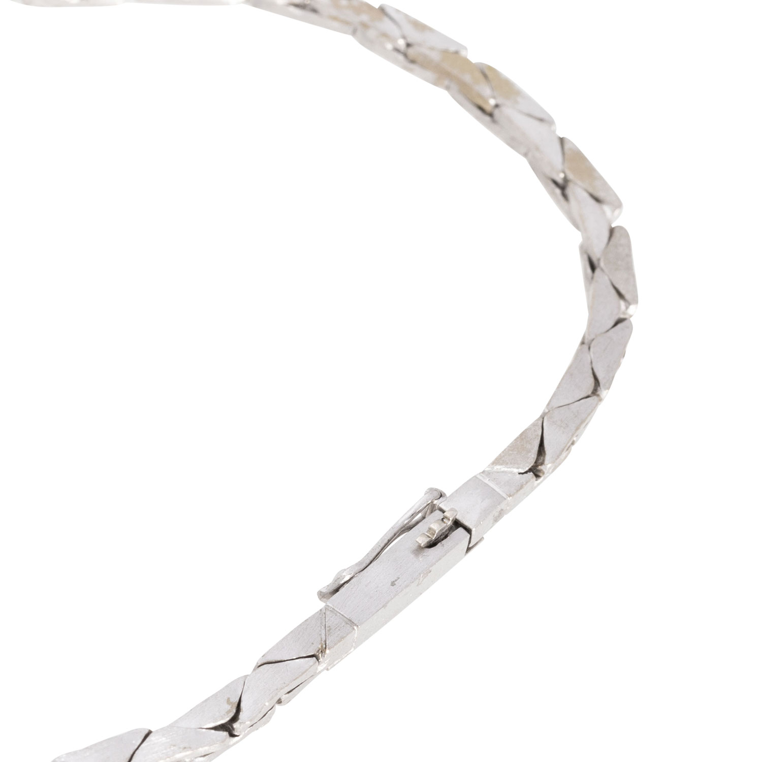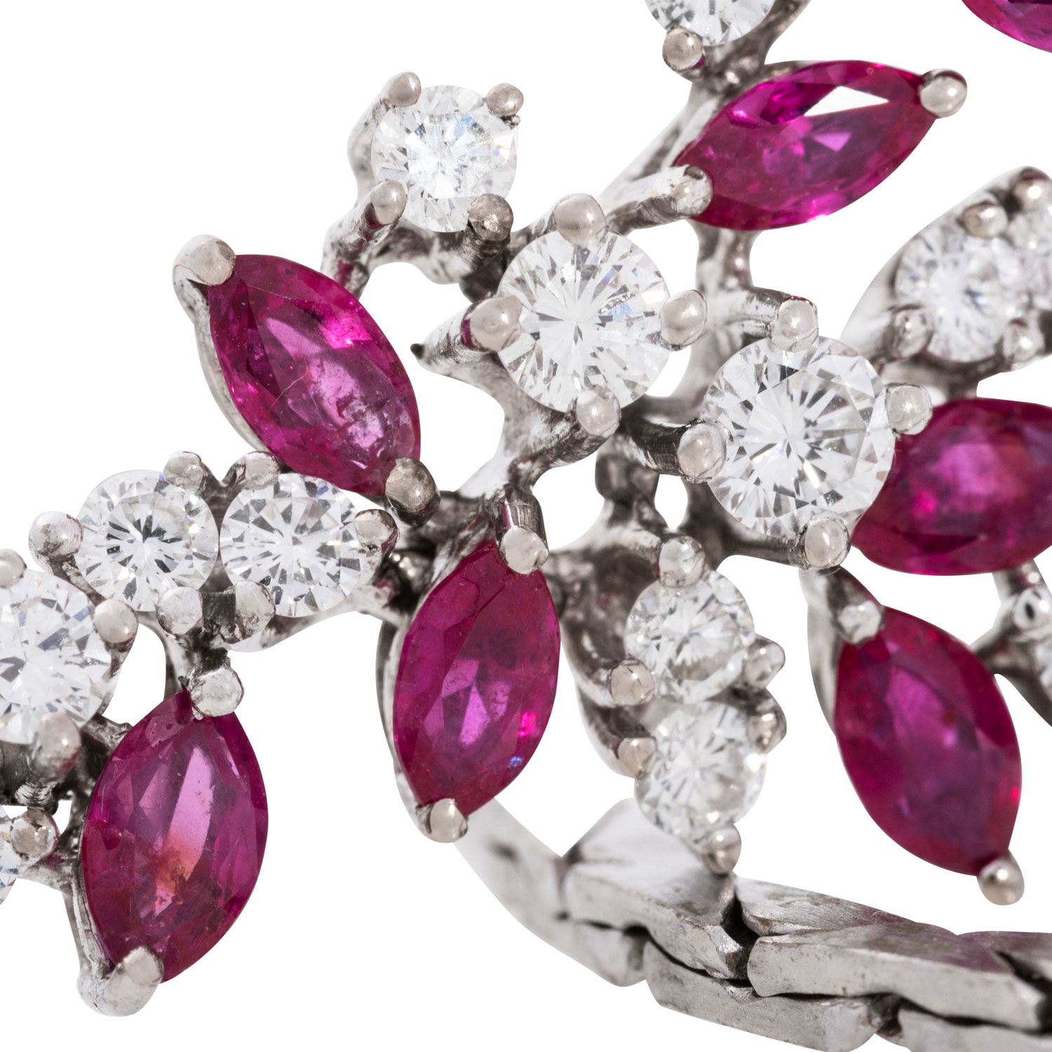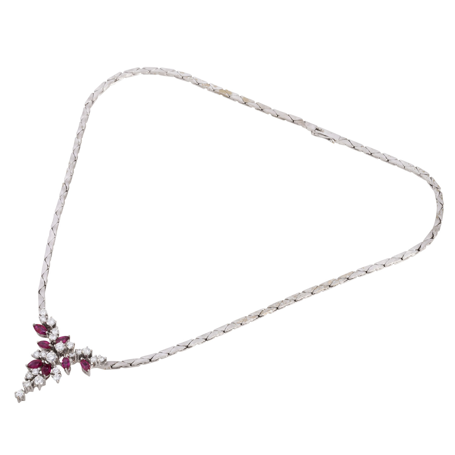 Collier with 7 rubies, from 5.4 x 2.6 to 6.5 x 3.2 mm, 22 brilliant cut diamonds, totalling ap. 1,9 ct, WHITE (H)/VS, 18K white gold, 35.9 g, L: 44 cm, box clasp, security catch, 2nd half of 20th century, minimal signs of wear.