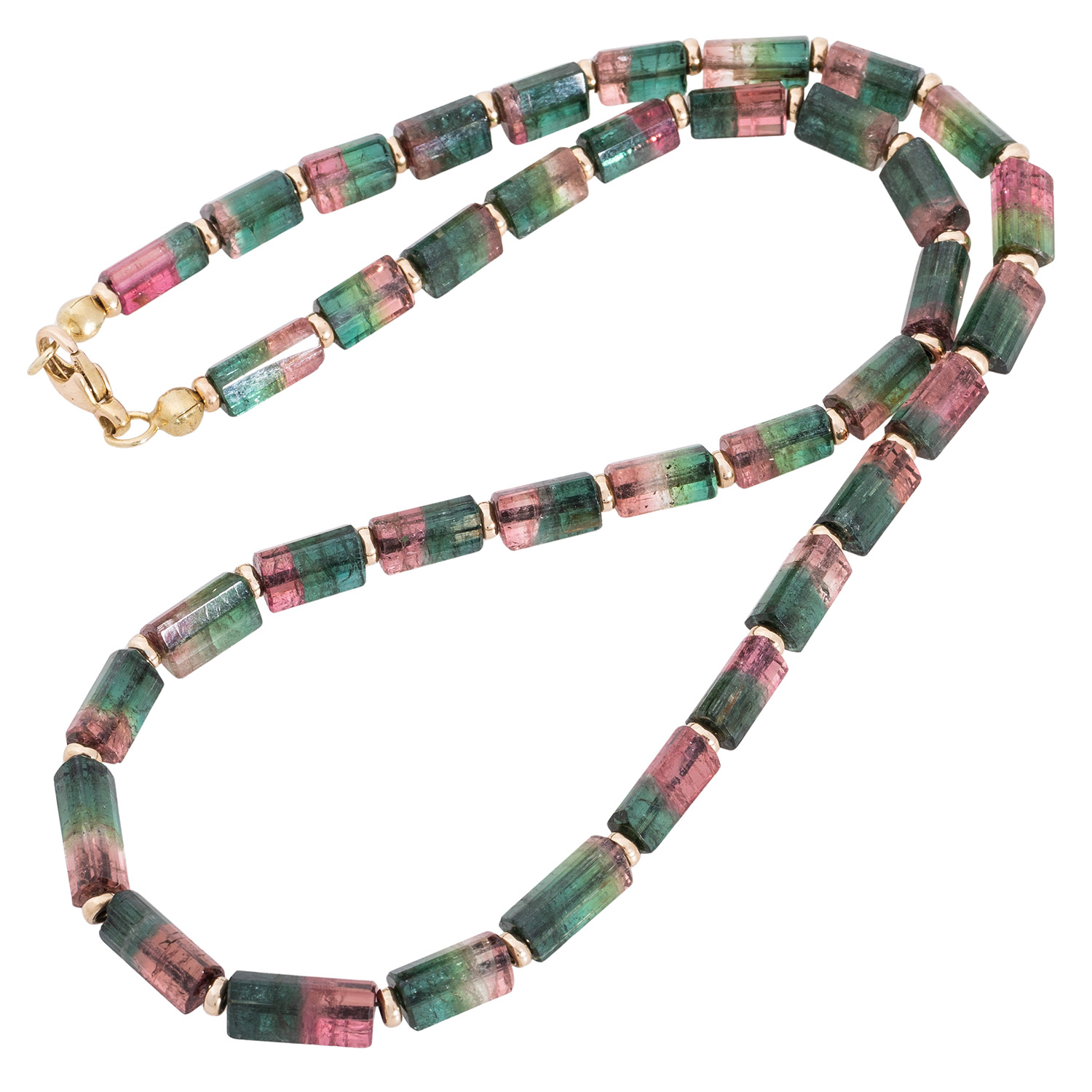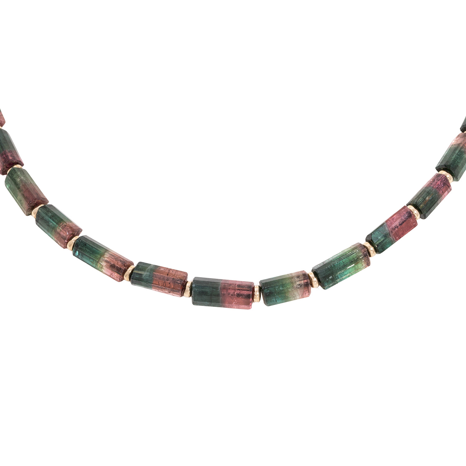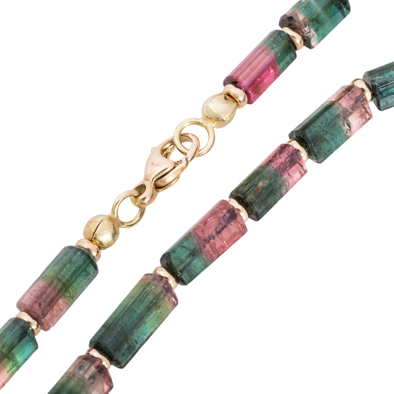 Necklace with bicolored tourmalines, 38 faceted/polished tourmalines in green and pink shades, so-called “watermelon tourmalines” and gold-colored intermediate links, clasp YG 14K, l: approx. 42 cm, 20th/21st century, minor signs of wear, tourmaline crystals with visible inclusions, some crystals slightly rubbed and small chips.