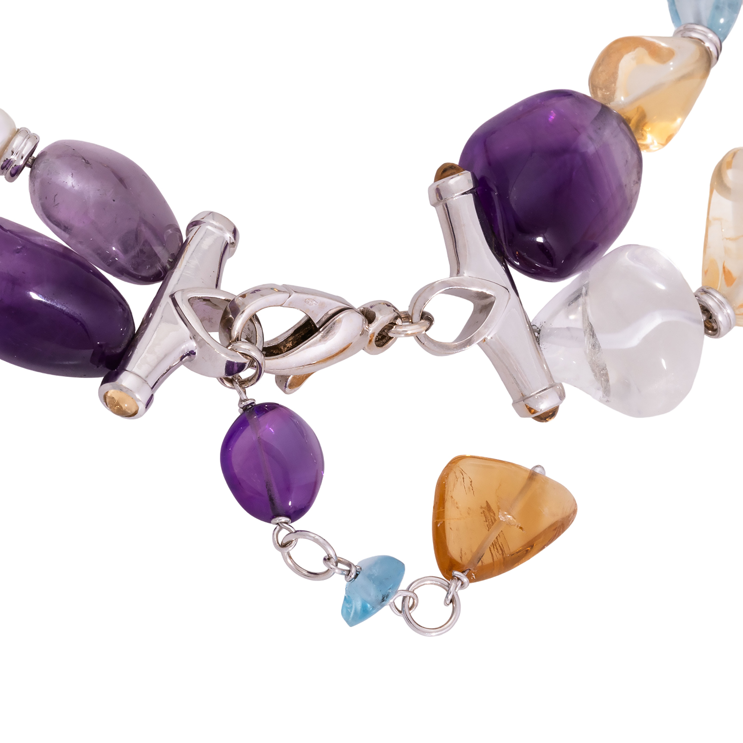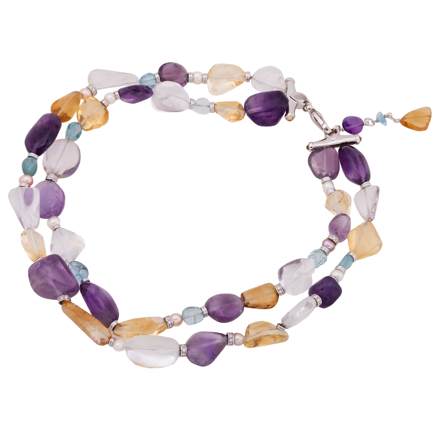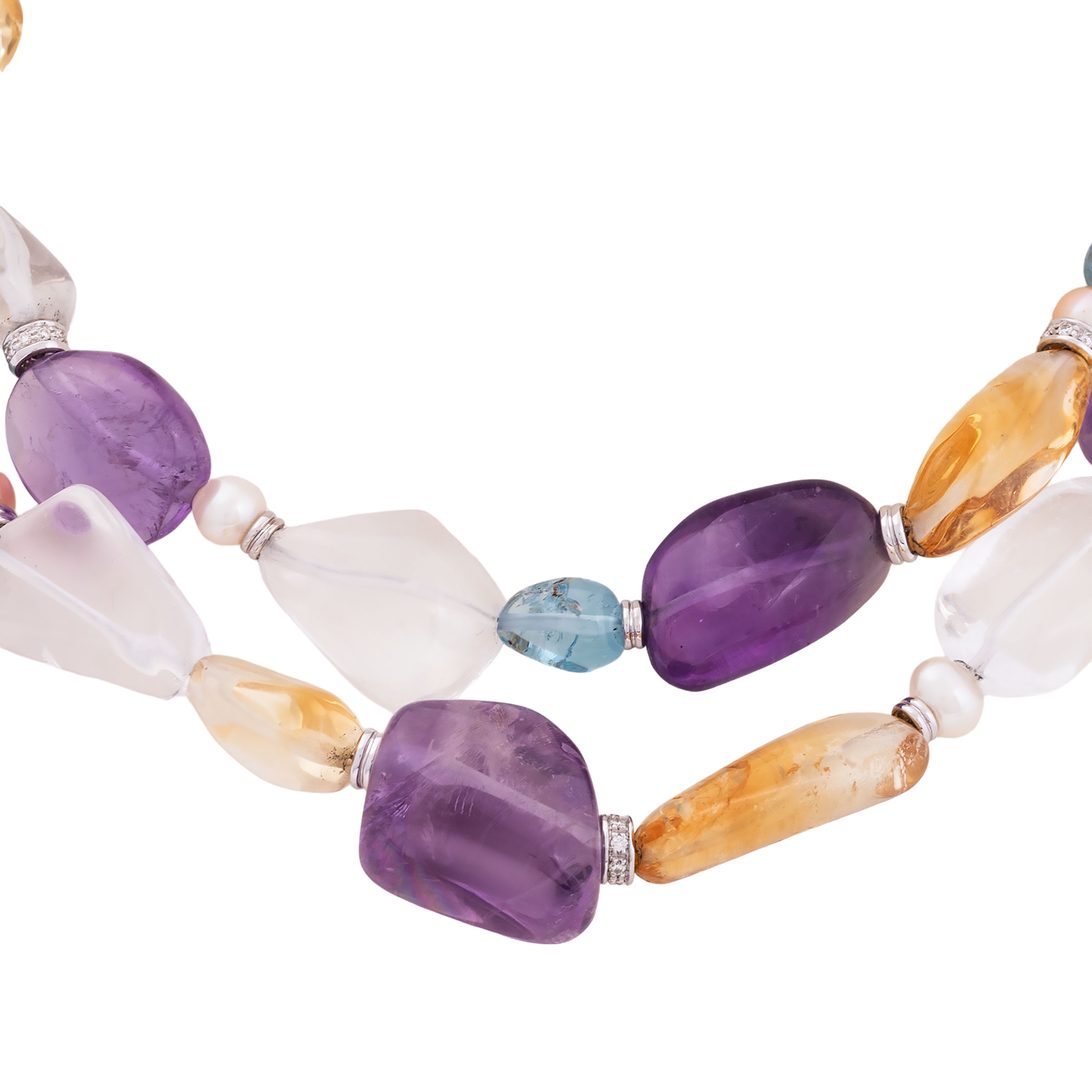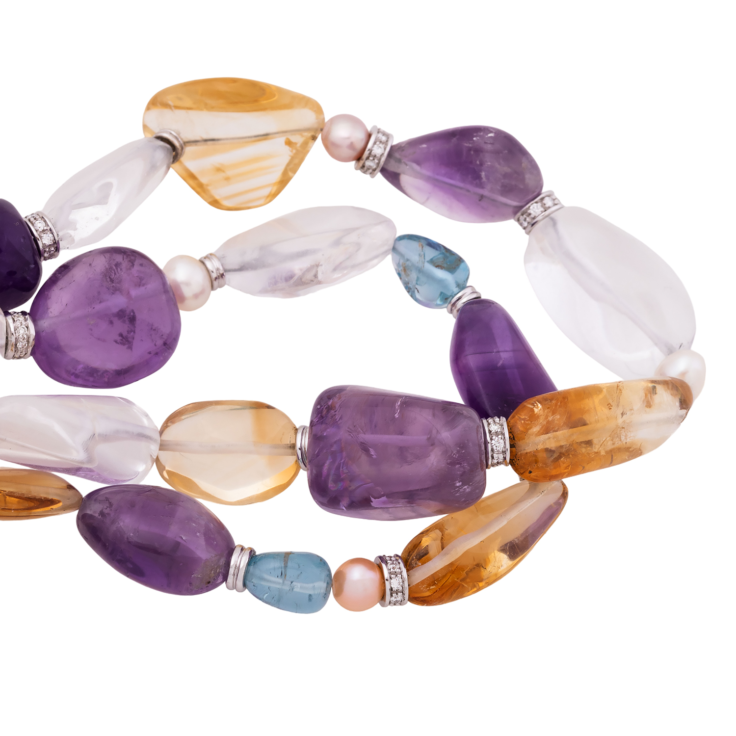 Necklace with various gemstones: citrine, amethyst, rock crystal, aquamarine, freshwater cultured pearls and brilliants totall. c. 0.80 ct, good colour and clarity, WG 18K, totall. 202.8 g, L: ca. 47 cm, 21st century, minor signs of wear.