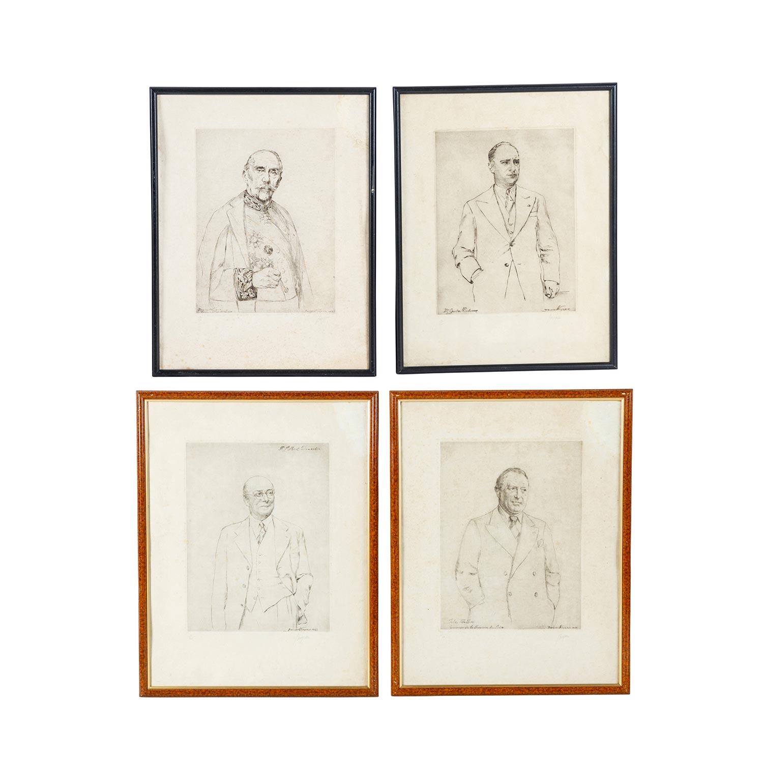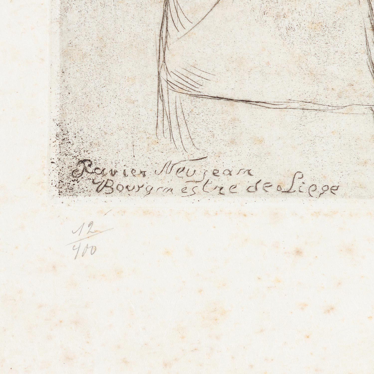 1x 'Xanier Neujeanne, Bourgmestre de Liége', In uniform with medal; 1x 'Gaston Bodemarc'; 1x 'Albert Dewandre'; 1x 'Jules Mathieu, Gouverneur de la Province de Liége'; etchings/paper, each inscr. and titled in the plate, 3x dat. 1939, each with sheet signed by hand a. numbered 12/400, plate dimensions each ca. 44x33 cm, sheet dimensions each ca. 65x50 cm, outer frame dimensions 2x ca. 70x55 cm, 2x ca. 68x53 cm. Damaged. Each with frame (1x glass missing). Traces of age.