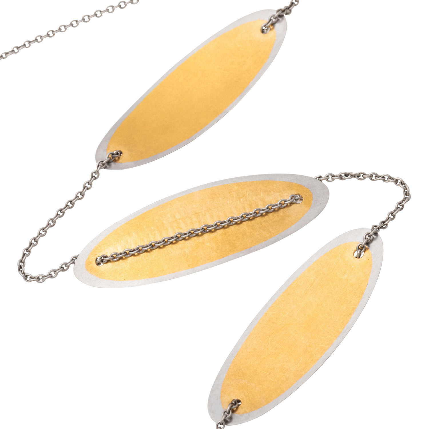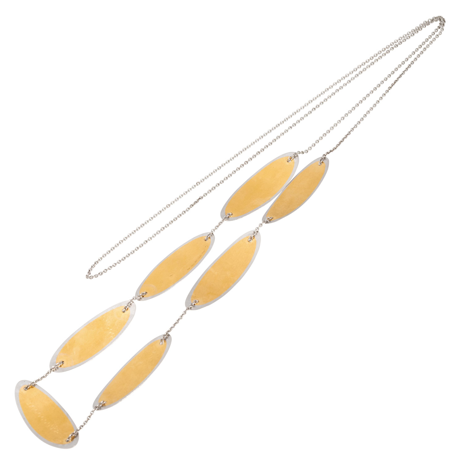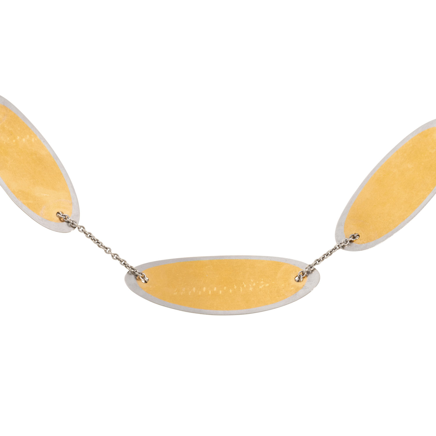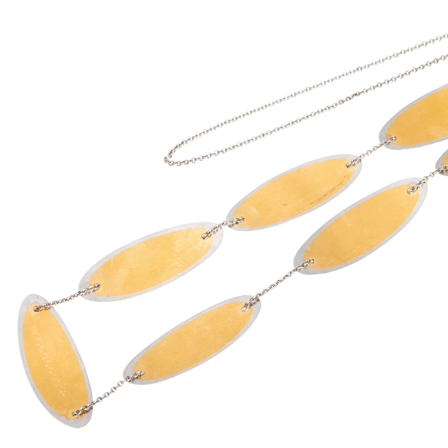 NIESSING necklace with 7 elliptic parts 3.5x1.2 cm, platinum with 24K yellow gold, 17.3 g, L: 80 cm, late 20th century, signs of wear, marked NIESSING.